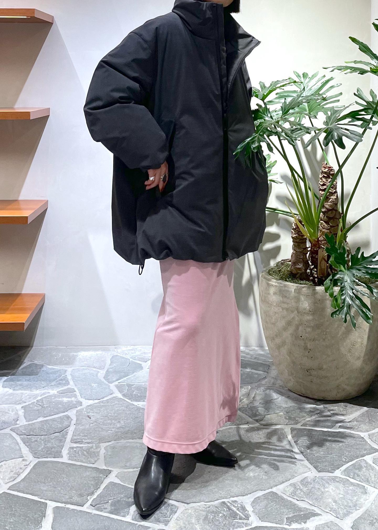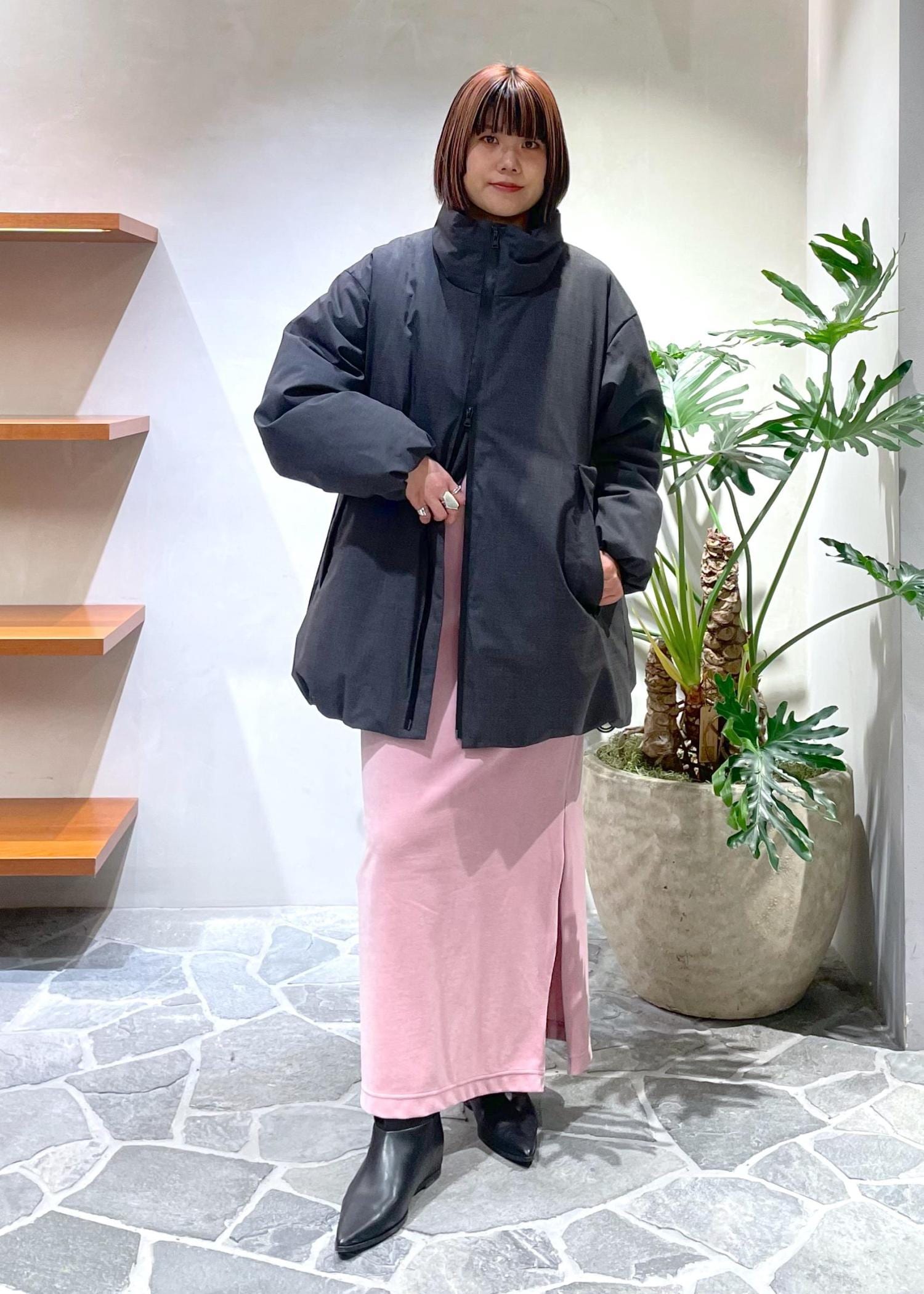 ボタニカルダイのワンピースにウールMIXミドルダウンでホリデーシーズンにもおすすめのスタイリングです!