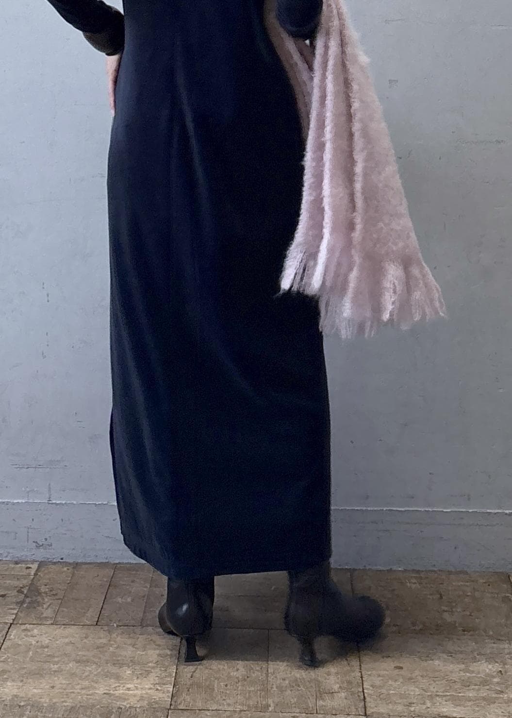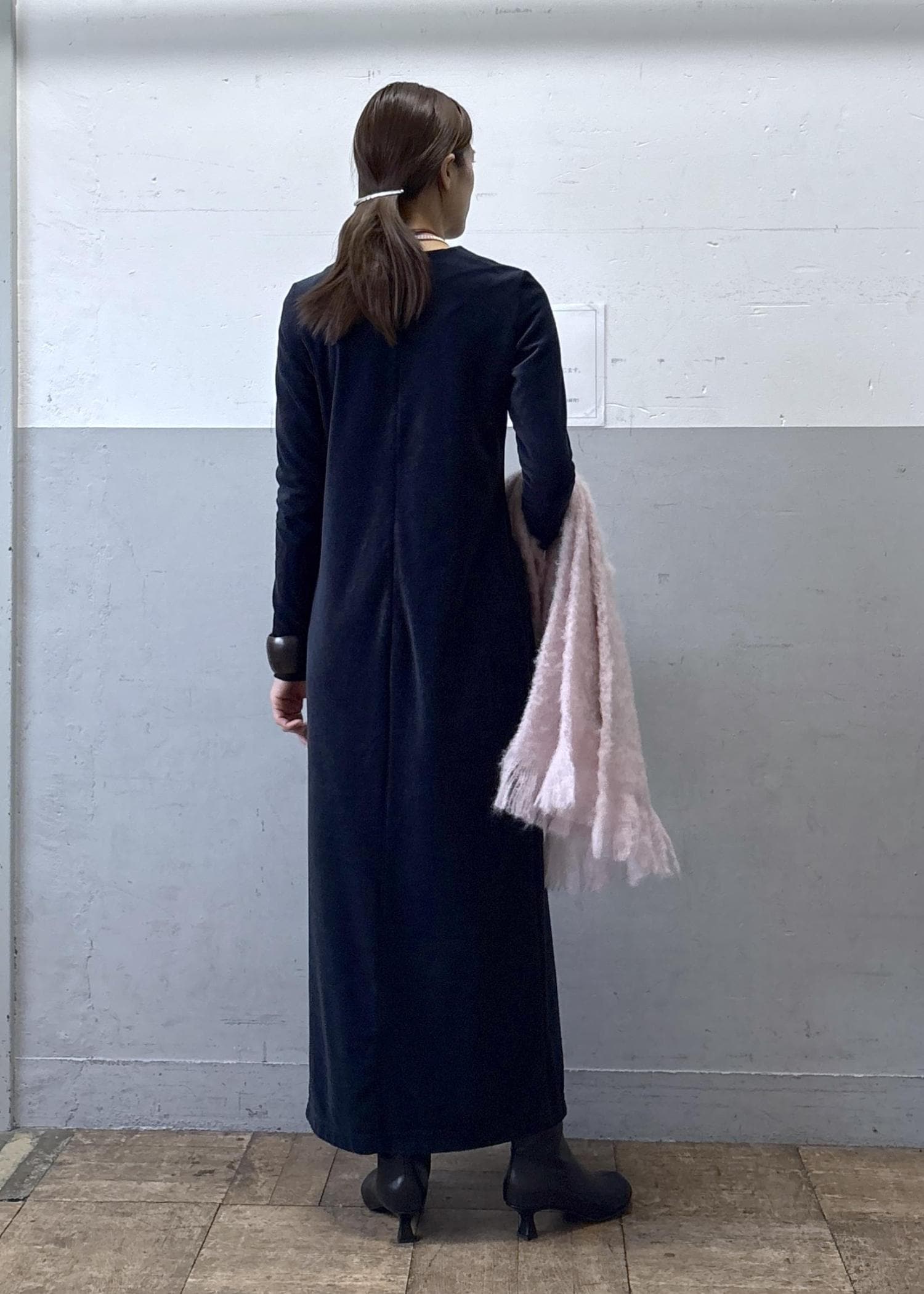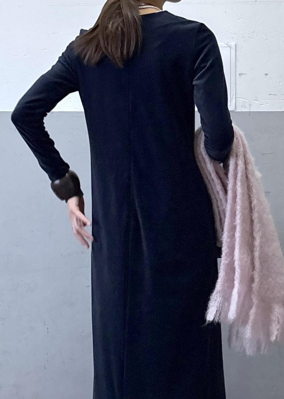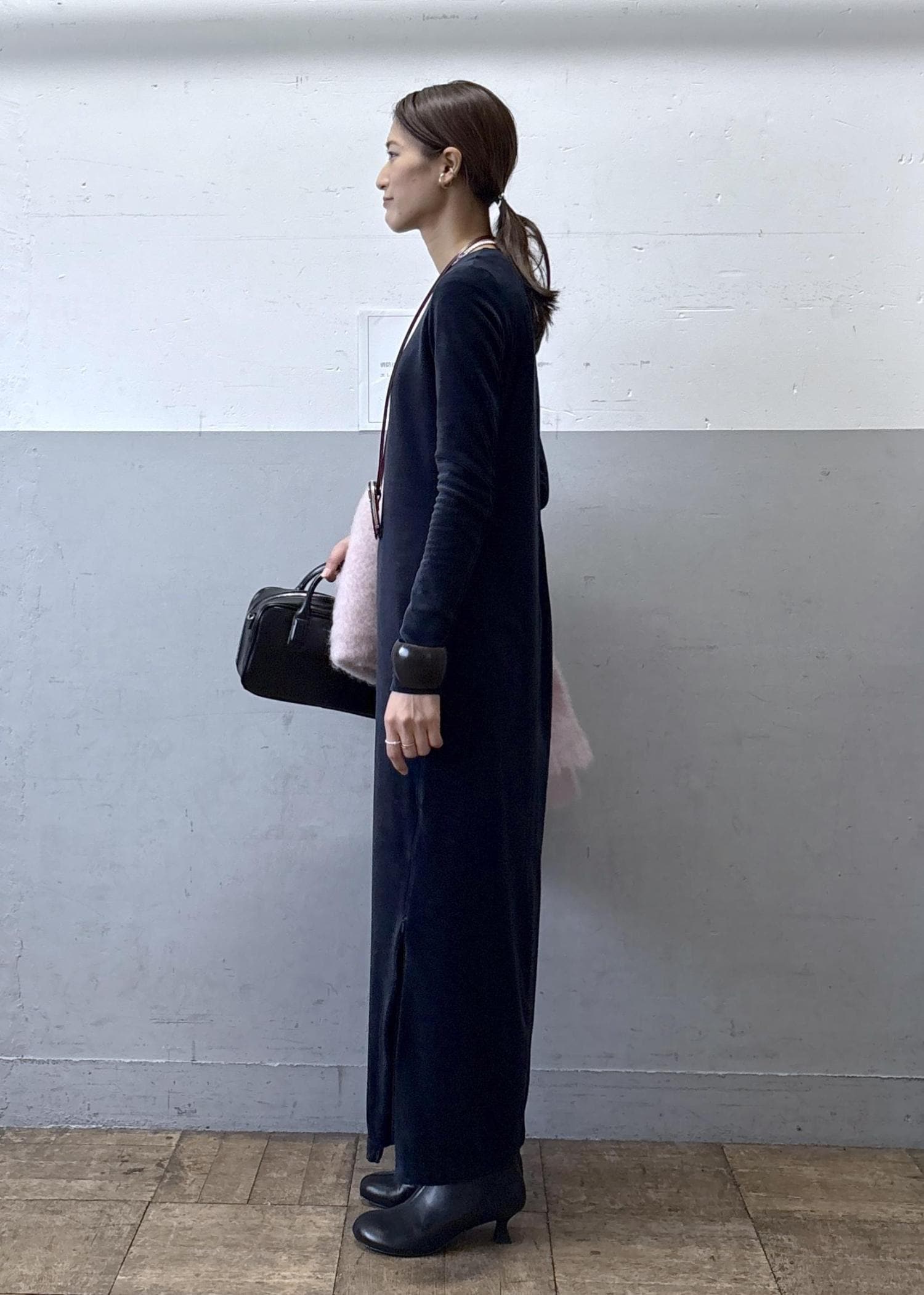 シンプルなシルエットのワンピースで、お好みに合わせて足元にスリットを入れられるようになっています。