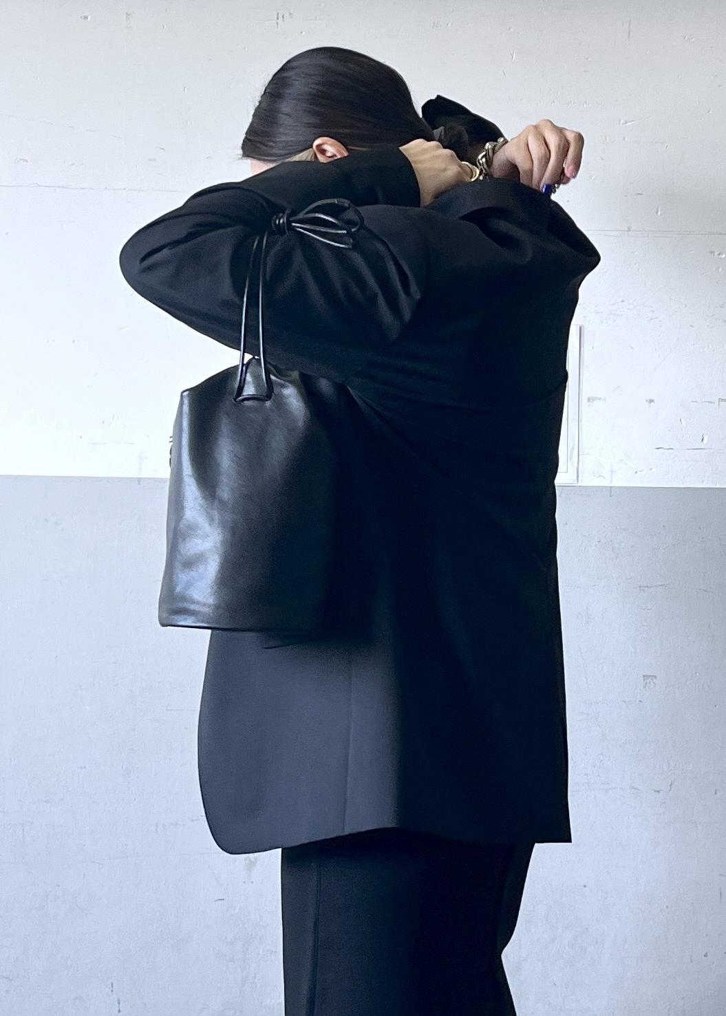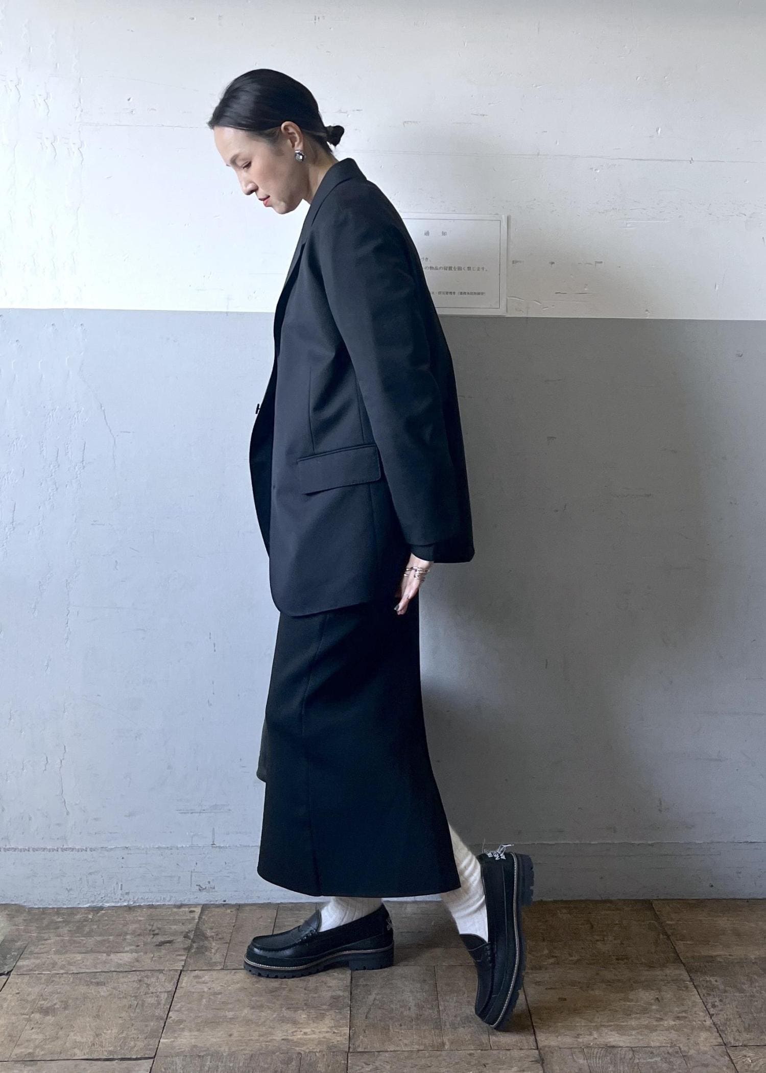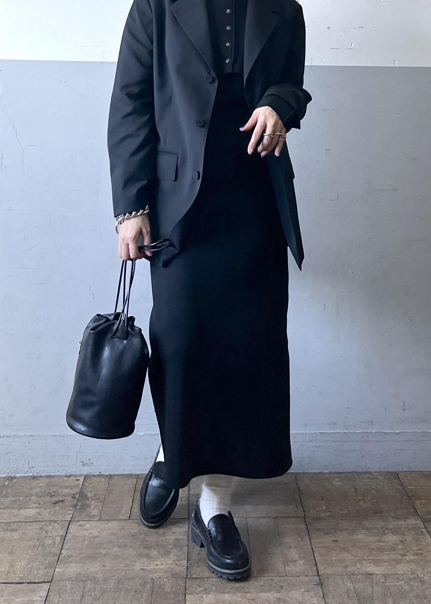 黒のジャケットを主役に、ワントーンでまとめたスタイリング。インナーや小物でさりげく表情をつけることで、シンプルながら奥行きのある印象に。