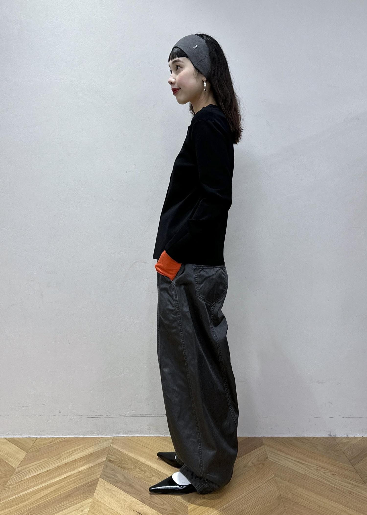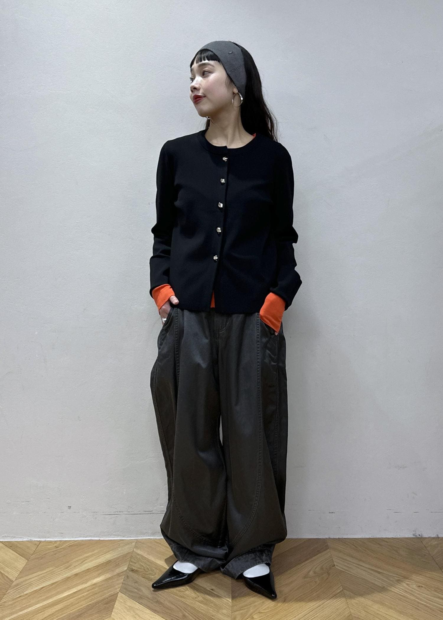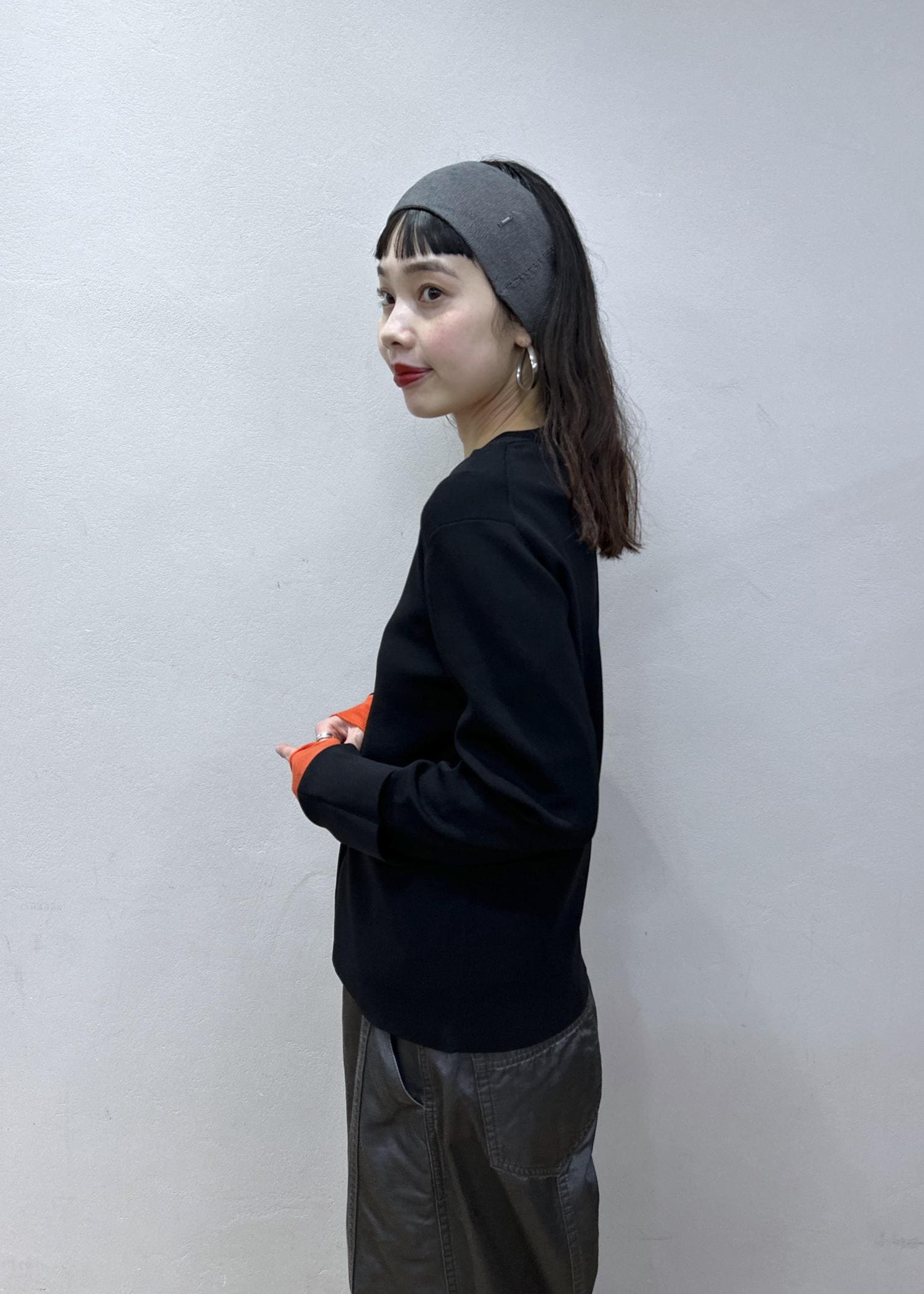 差し色にオレンジカラーのインナーを