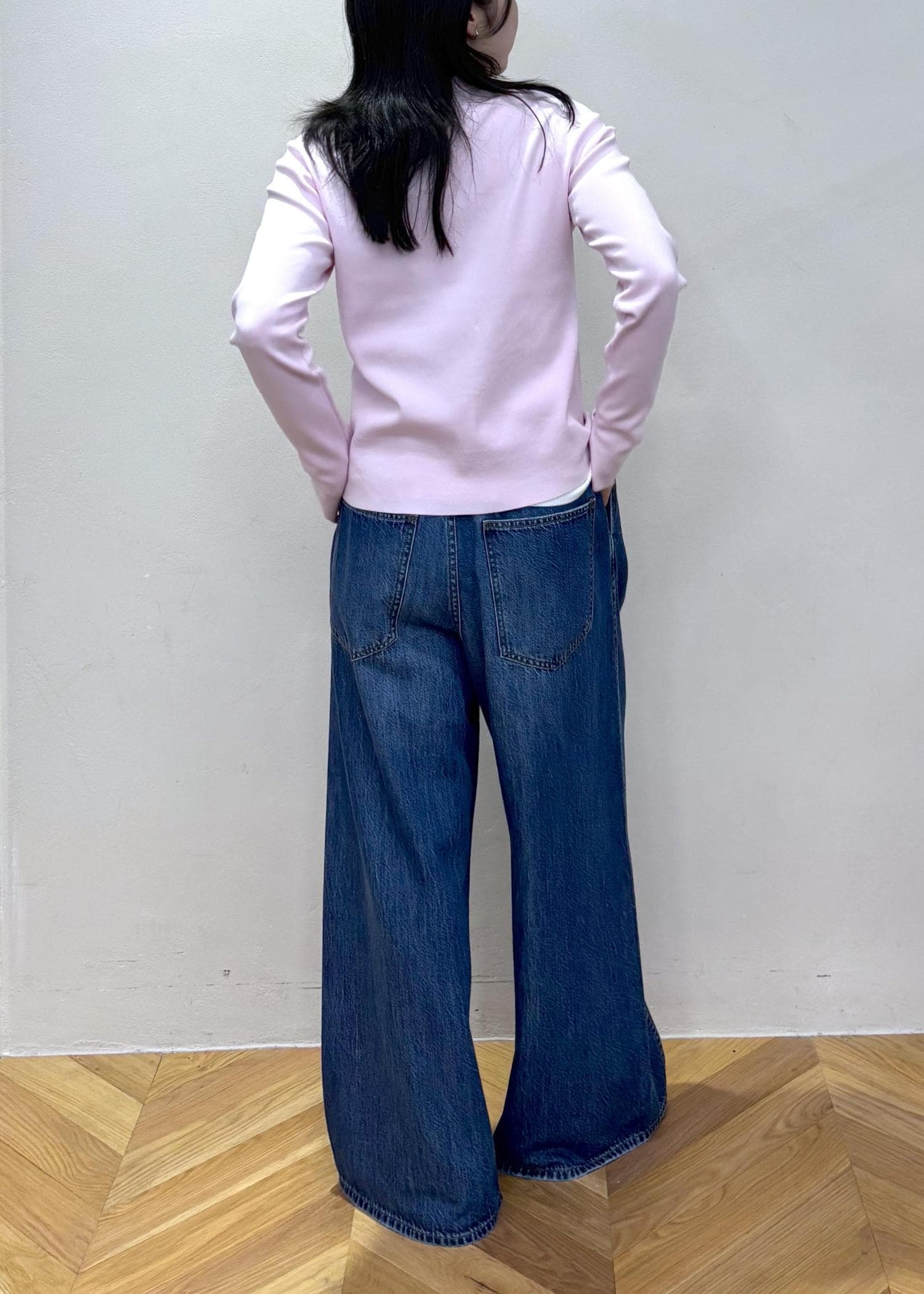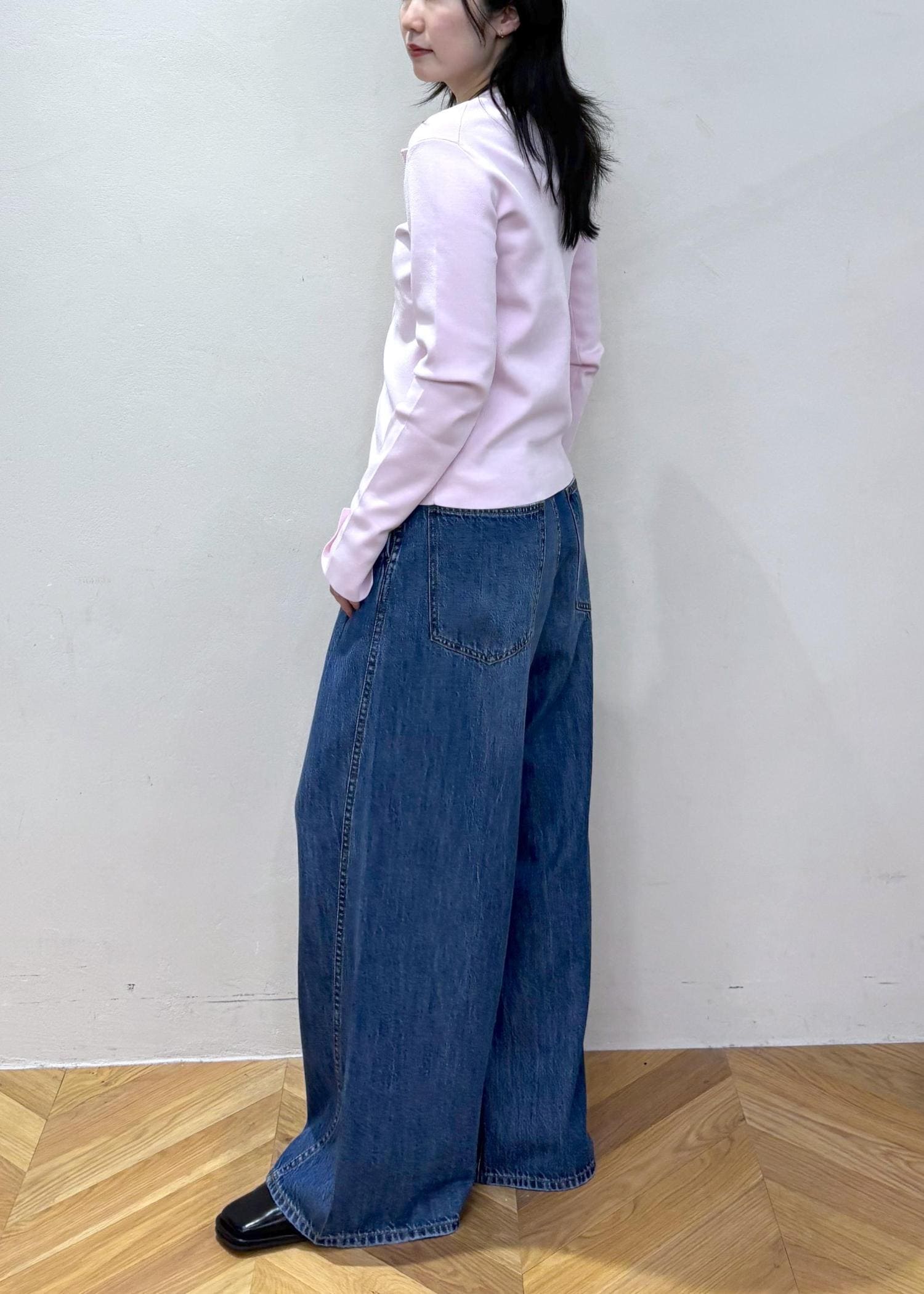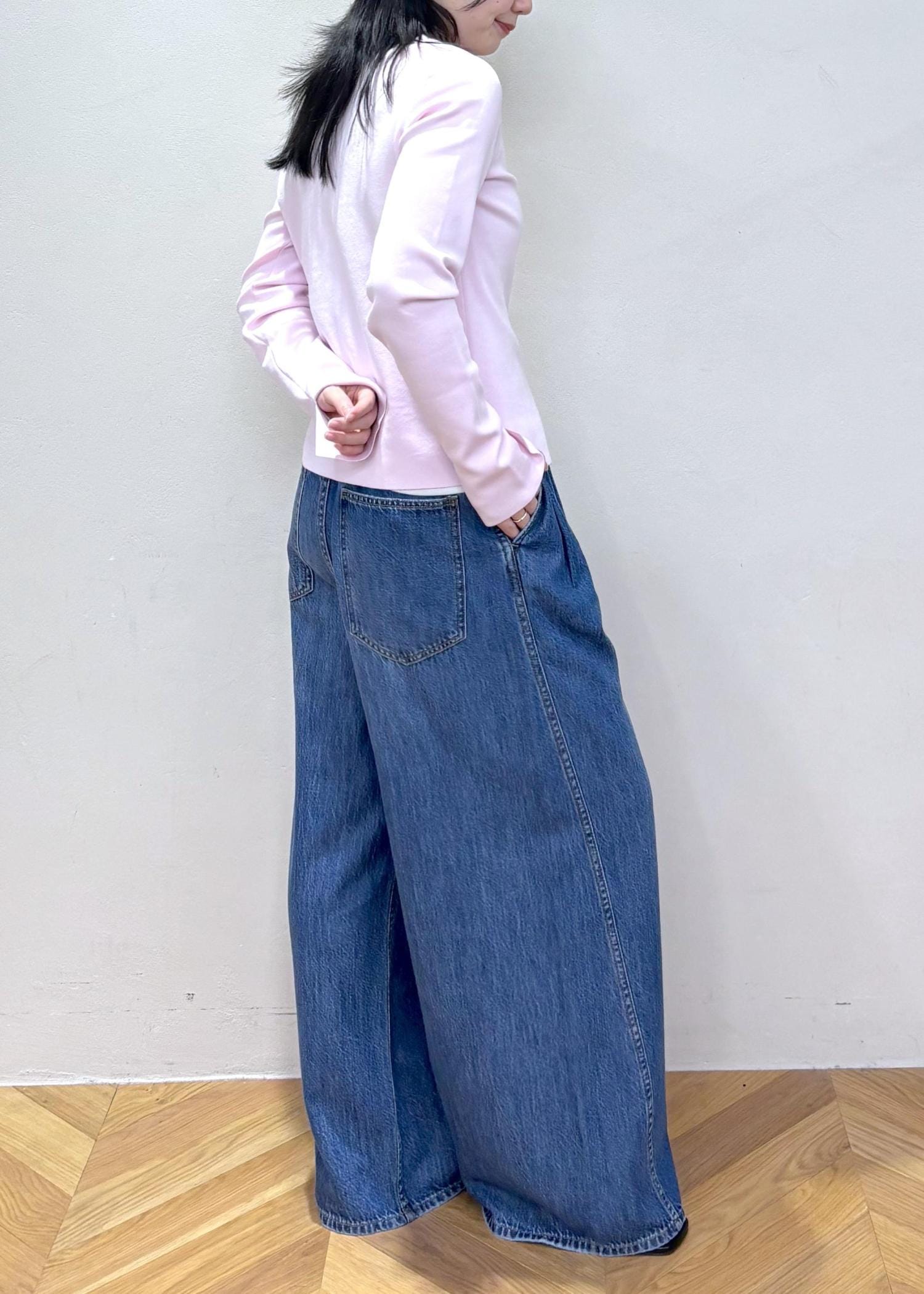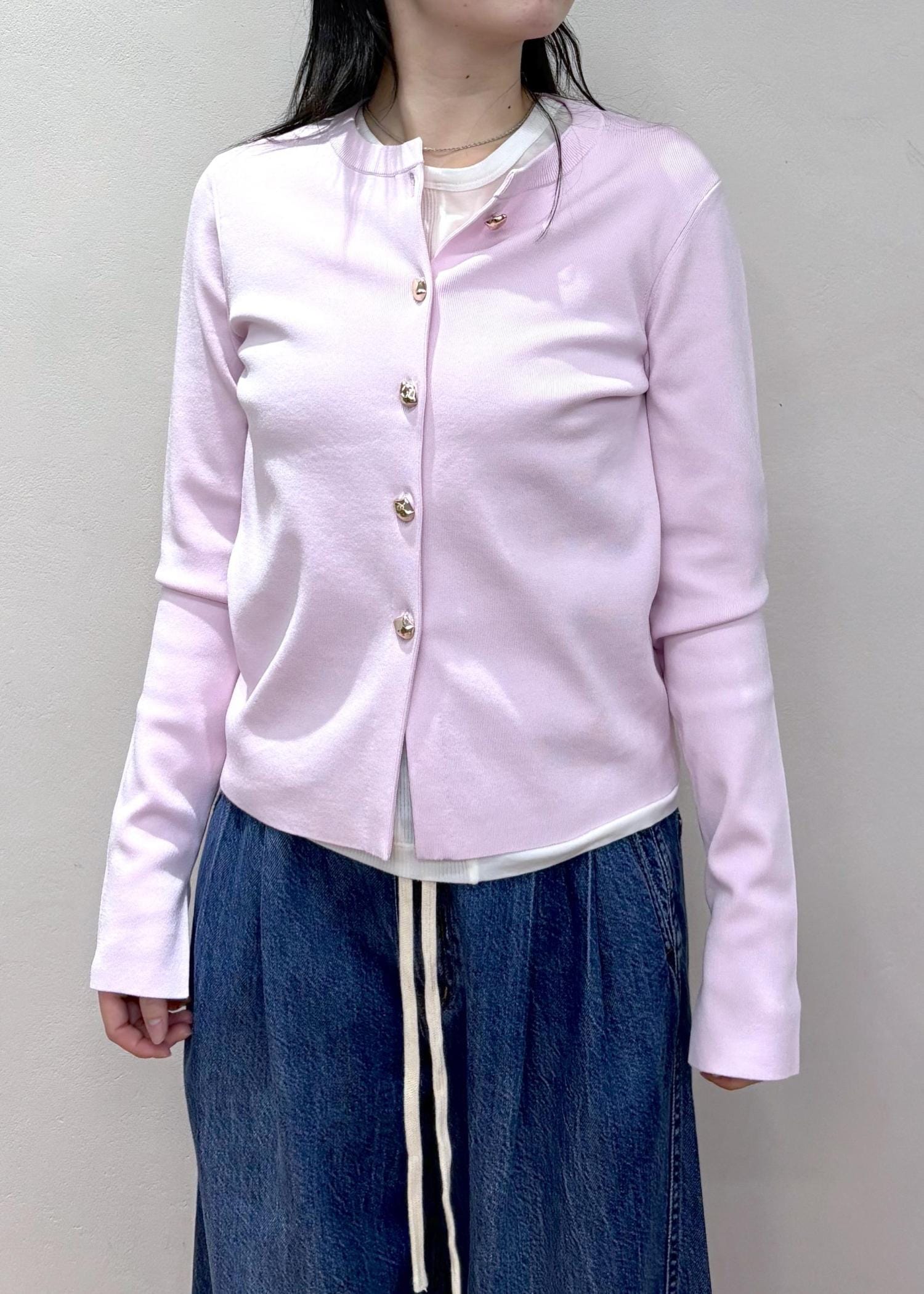 絶妙なピンクのカーディガン(長め)を使った
