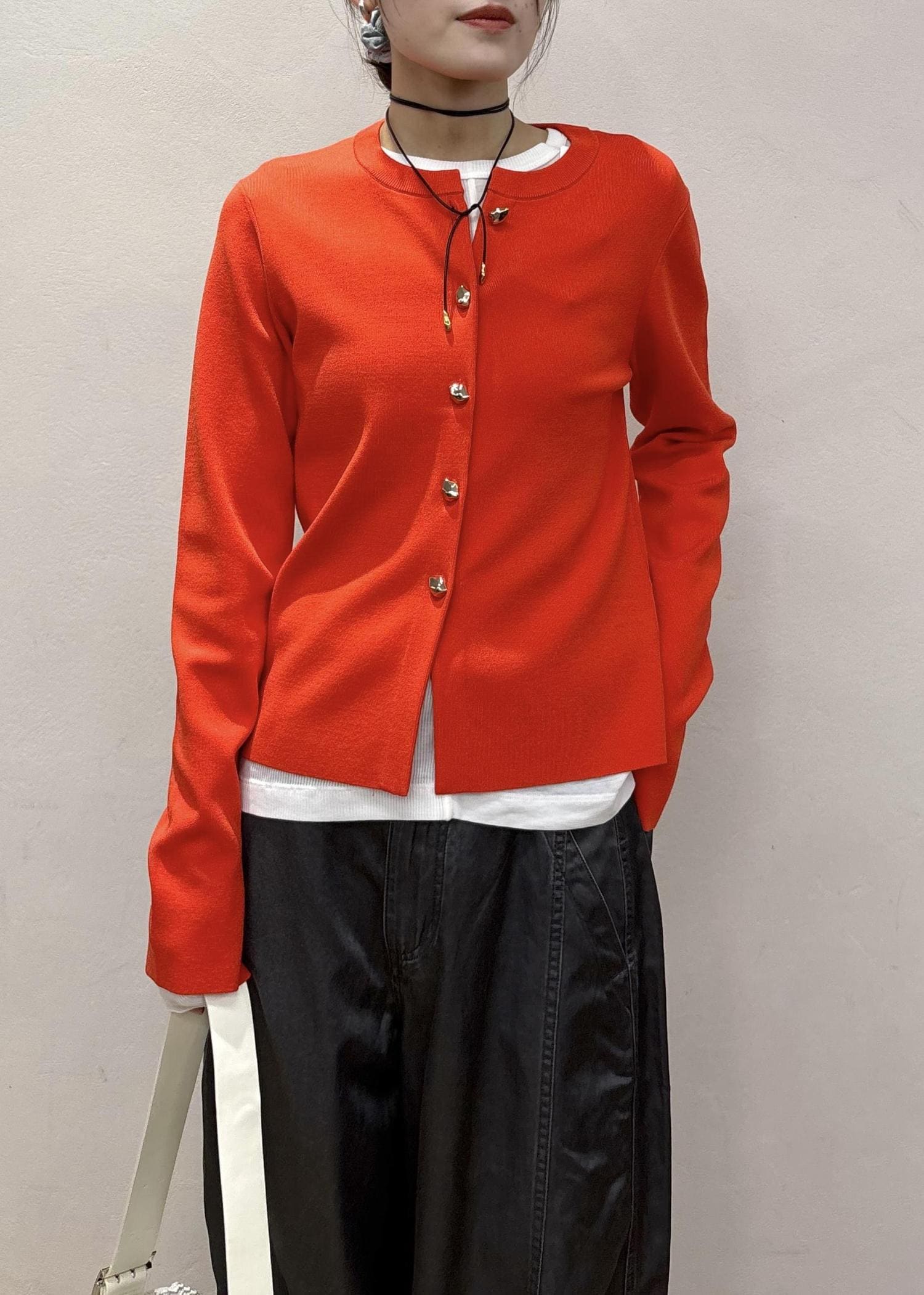 パキッと鮮やかな朱赤カラーが目を引くカーディガン♡