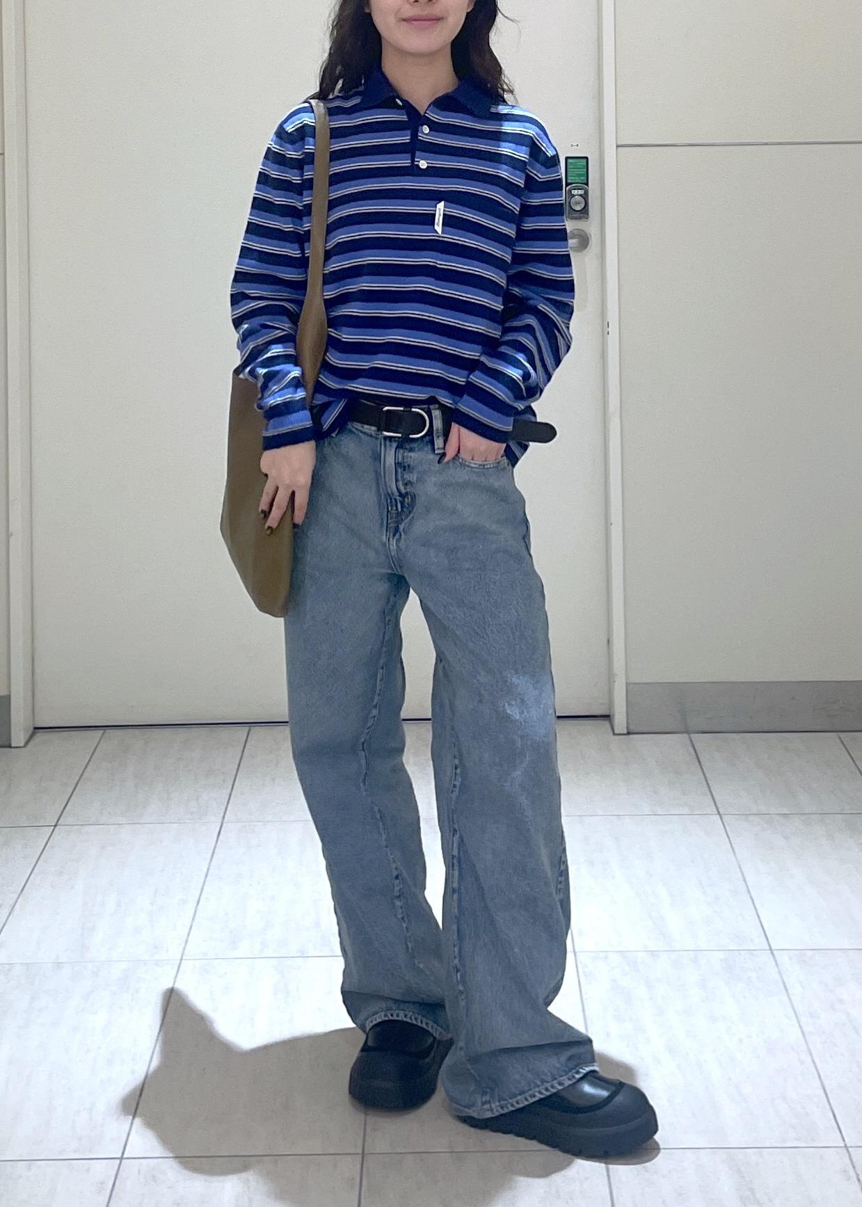 トップスはHommegirlsのニットポロです。肌触りも抜群でとても柔らかくちょうどいいサイズ感でした。トップスにデザインがあるので、ボトムスはシンプルな形のデニムを合わせています。