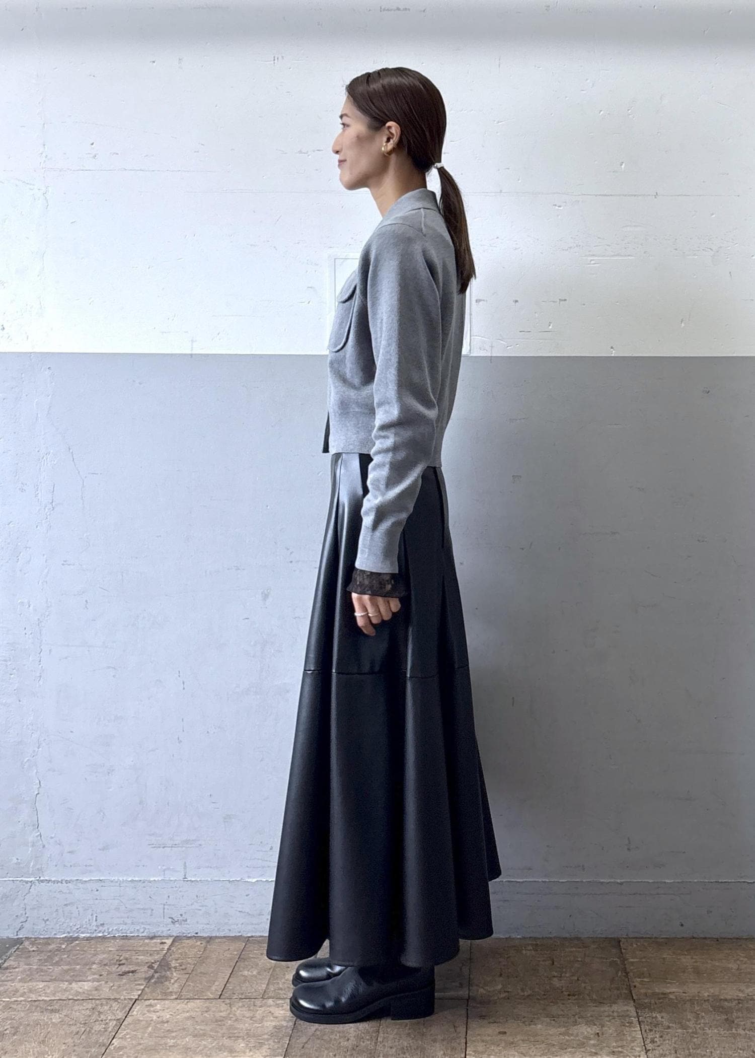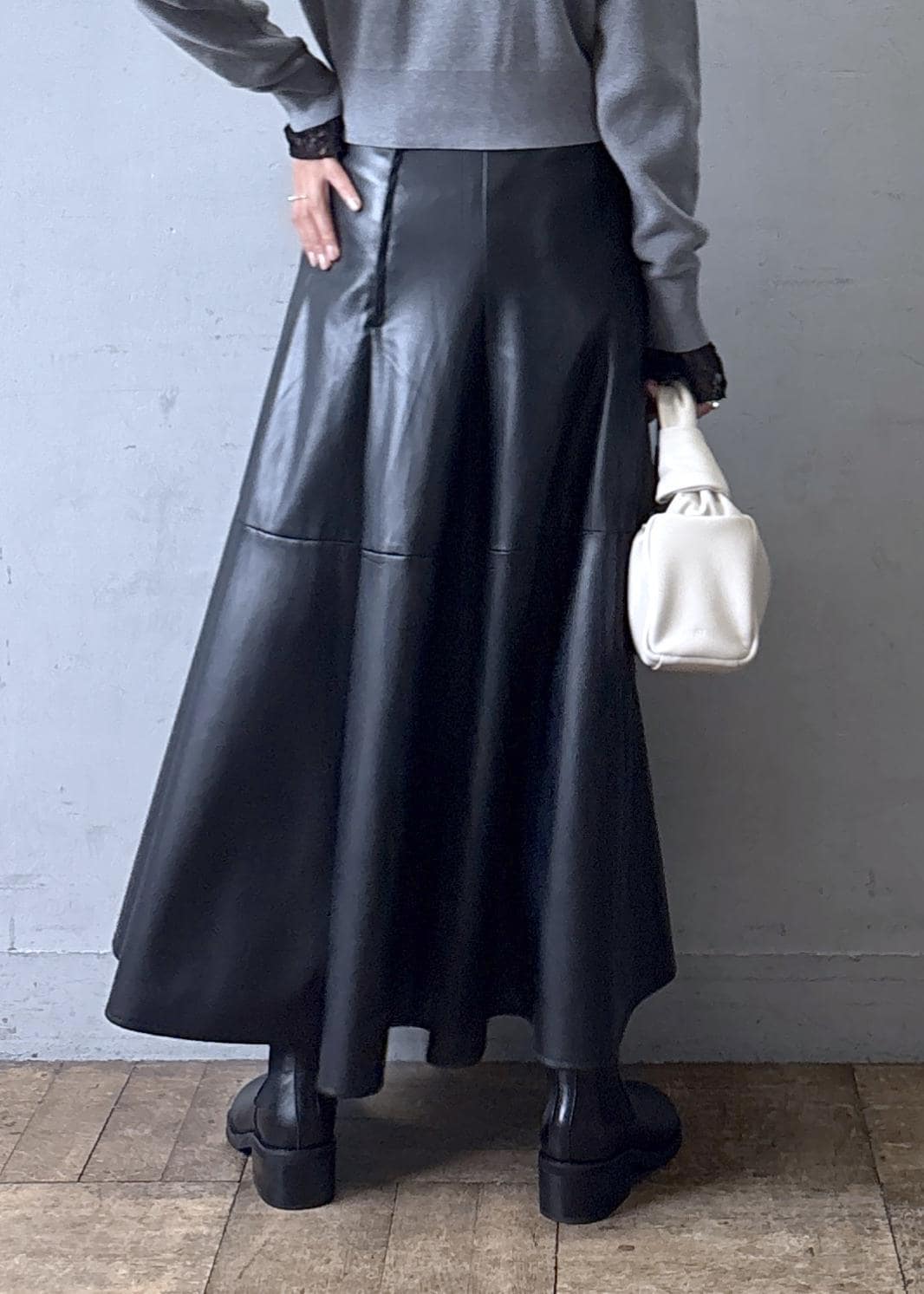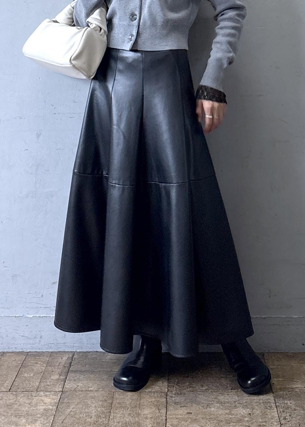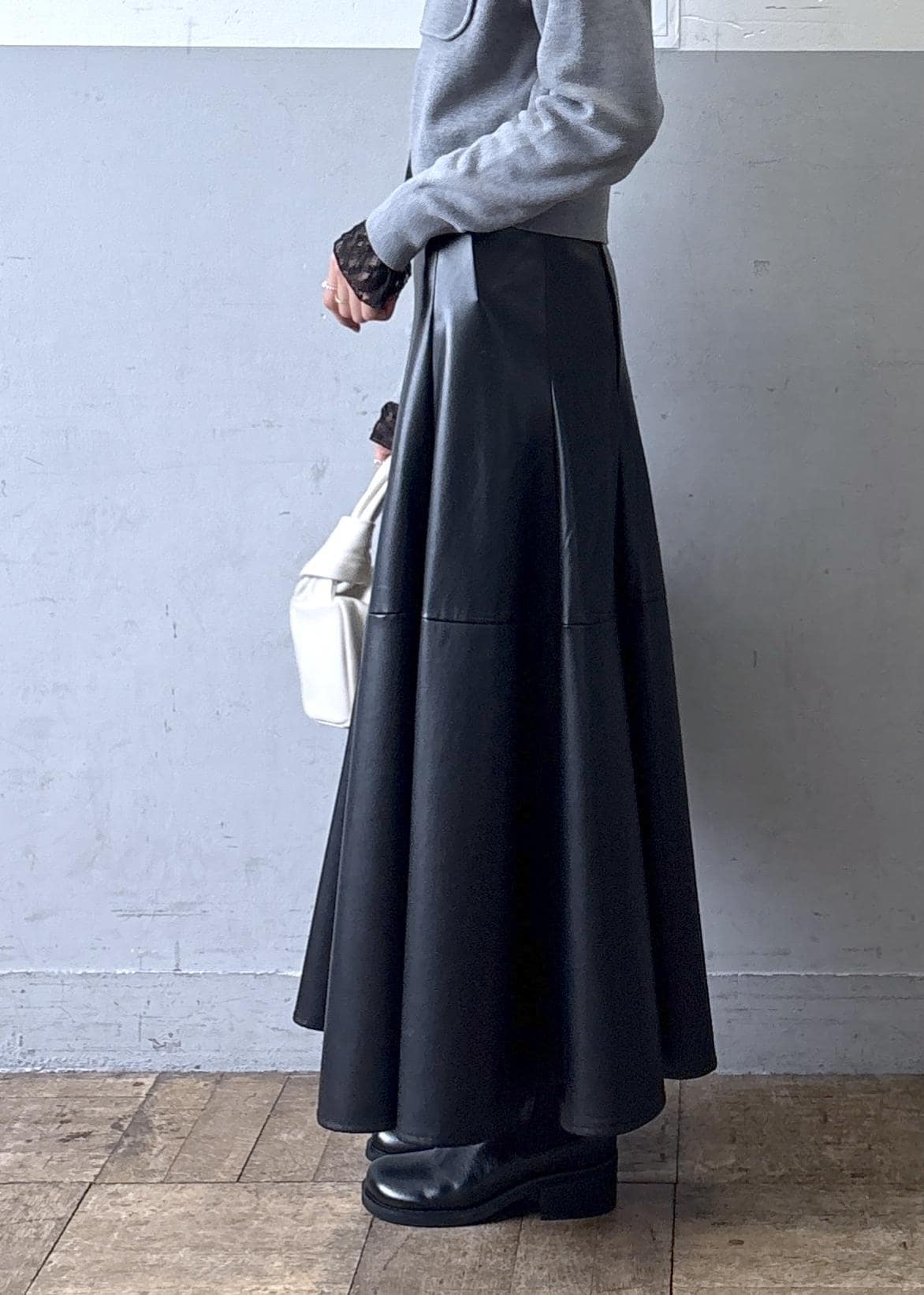私はレースのインナーをレイヤードし、リアルバイしたレザースカートと合わせてコーディネートしました。