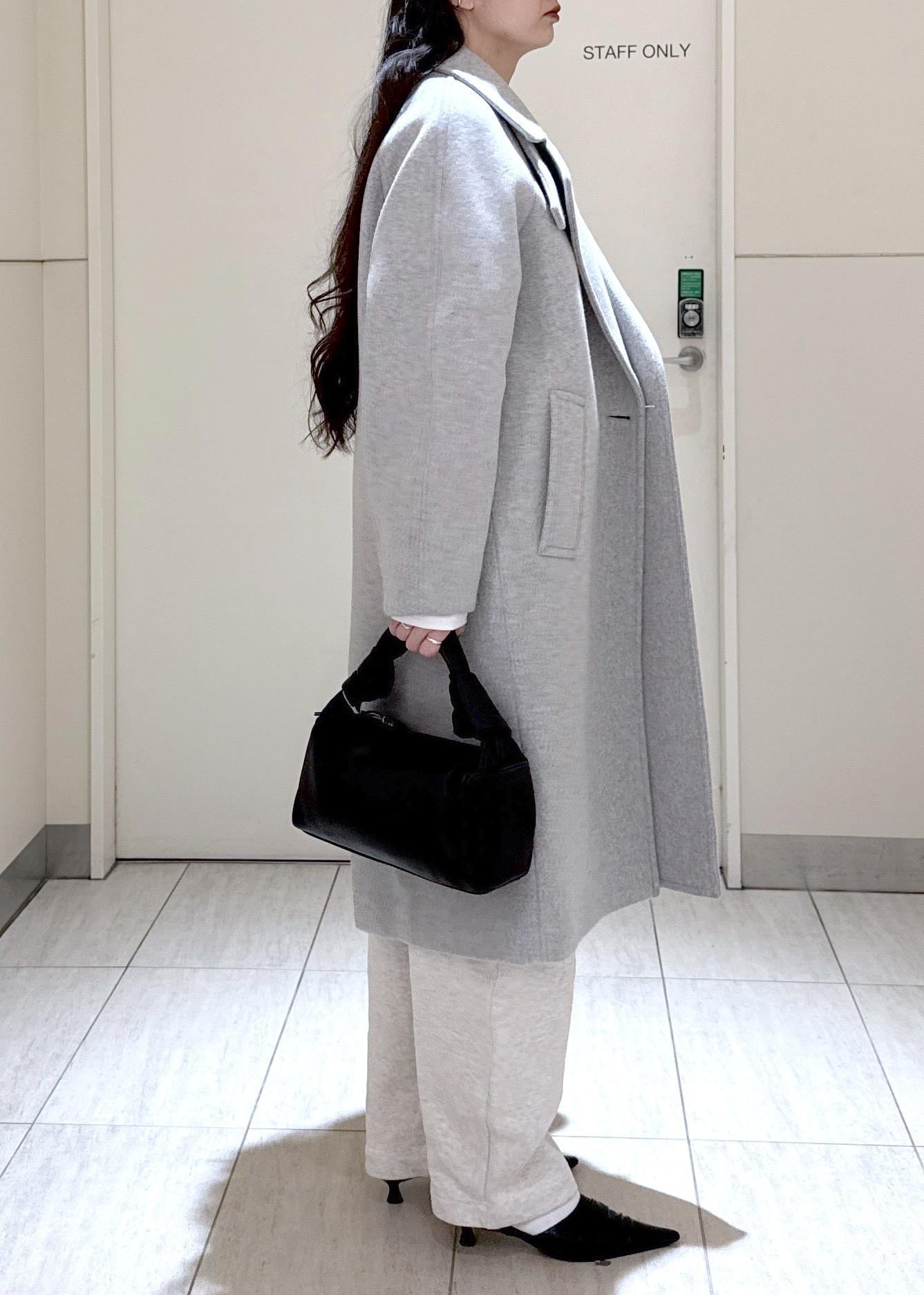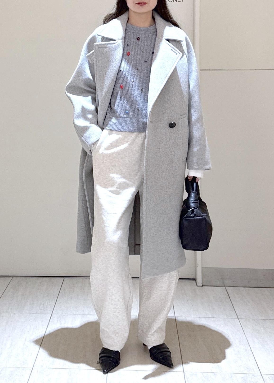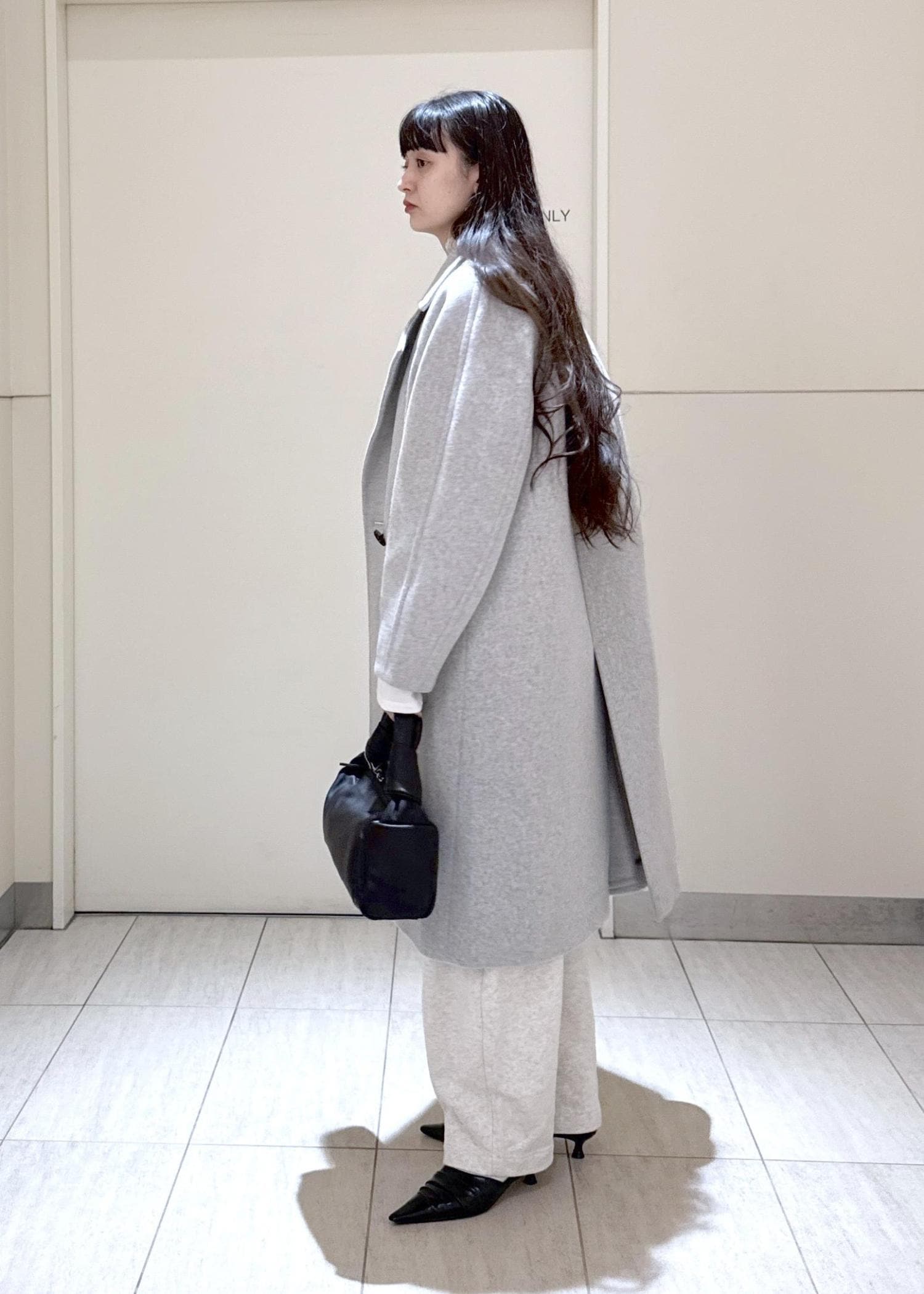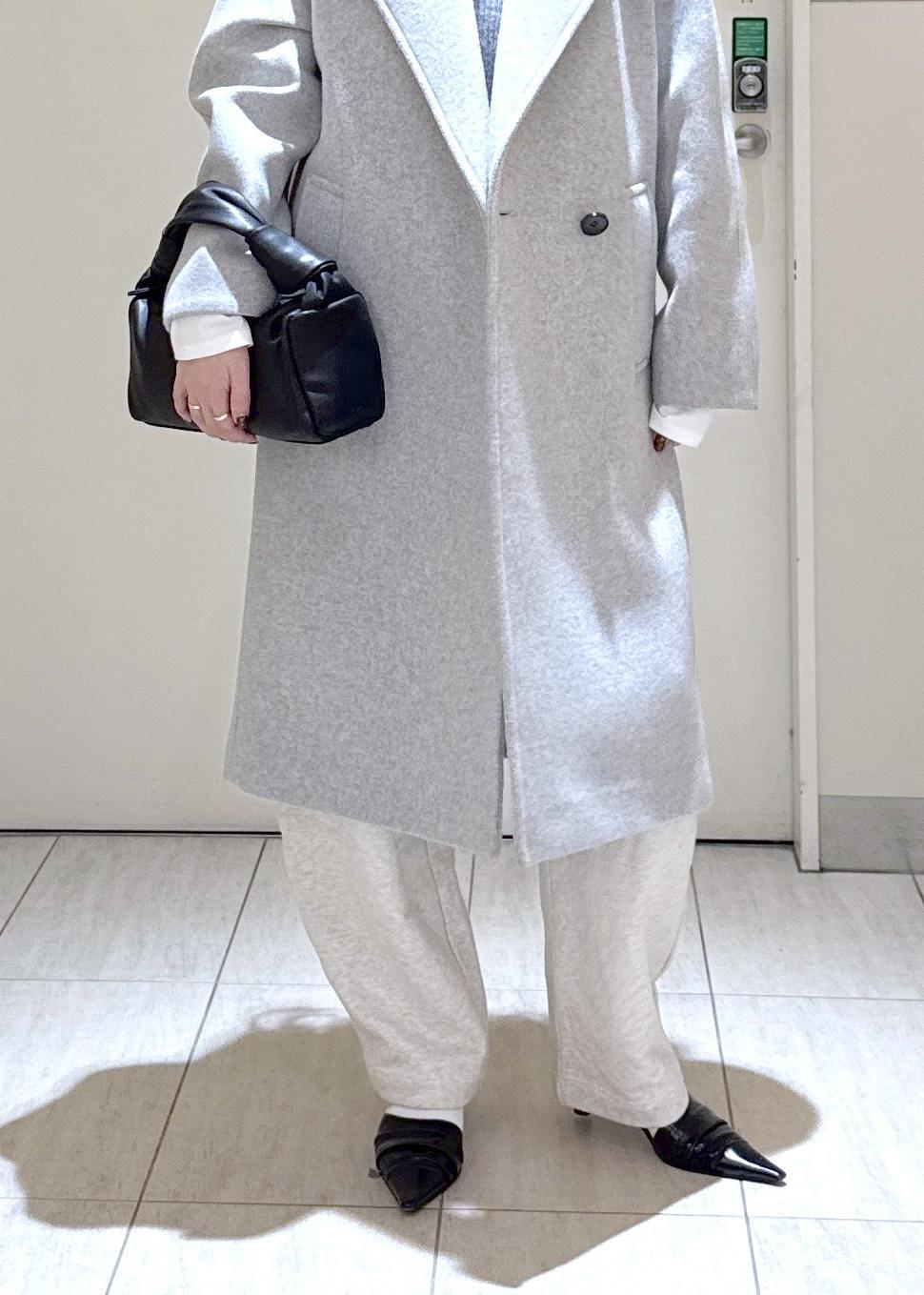 このアウターロング丈ですごくしっかりした素材ですが、すっごく軽いんです!!今回はアウターが綺麗目なデザインなのでボトムだけカジュアルなスウェットを合わせて綺麗目にまとまりすぎないようにしました。