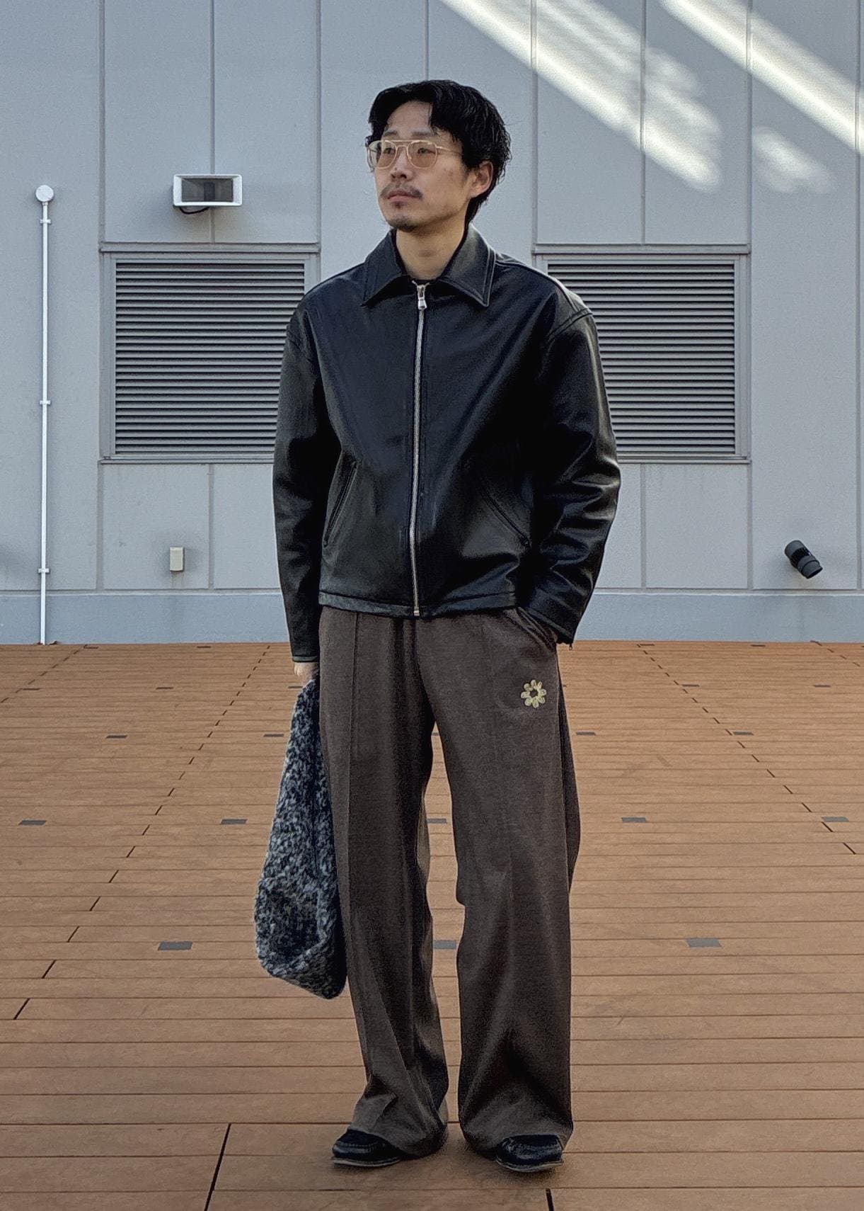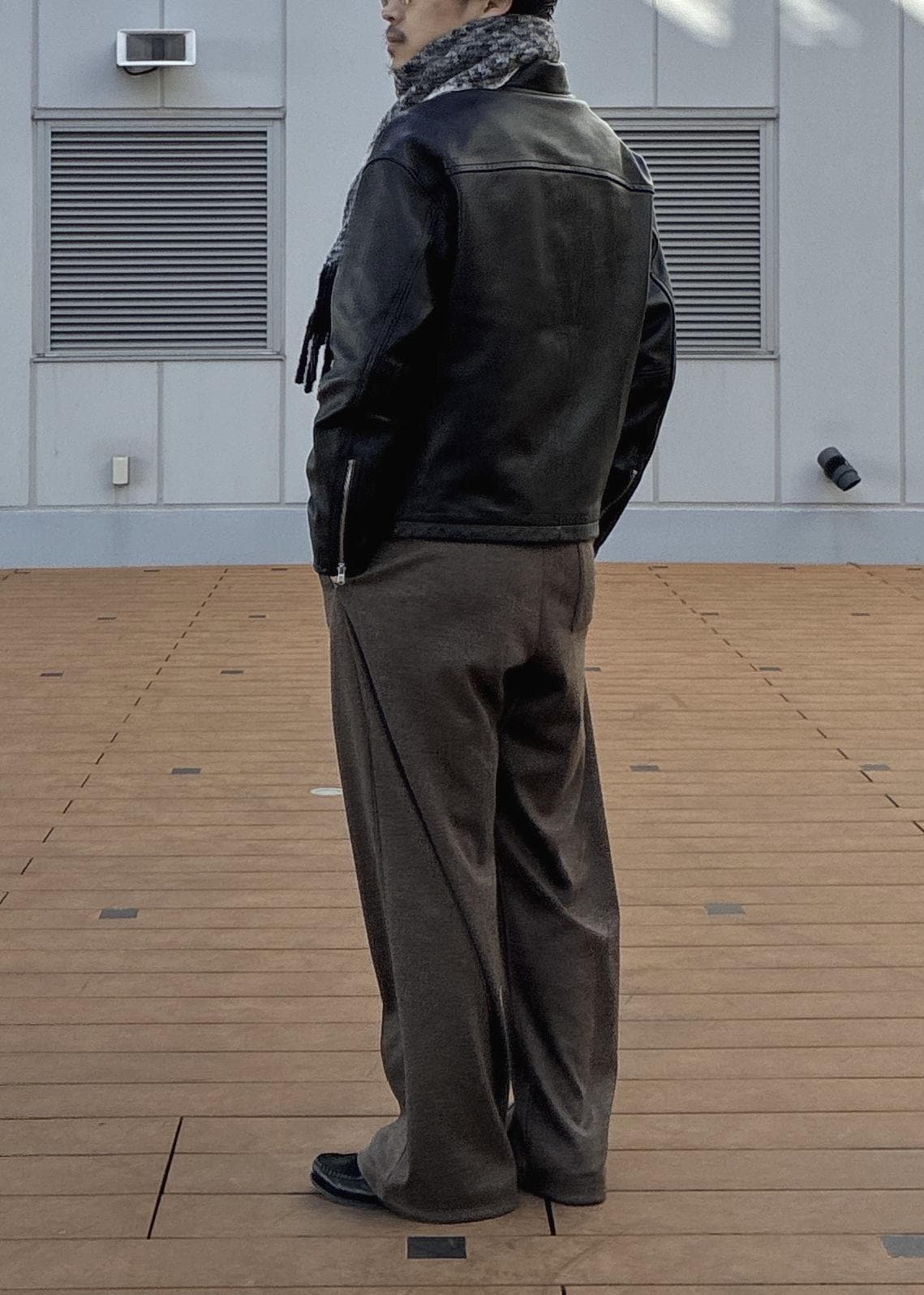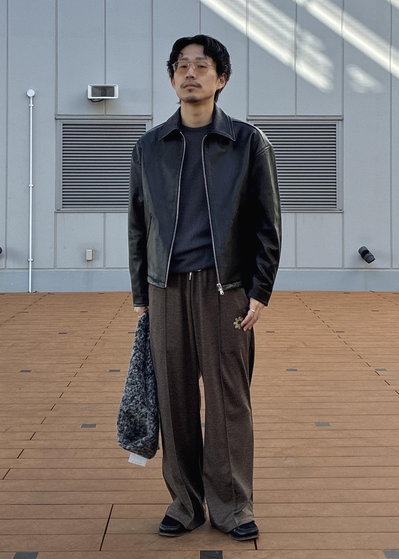 レザーの質感に、ジャージー素材のスラックスのバランスが、キマりすぎずにちょうどいいバランスにまとまってくれておすすめです!