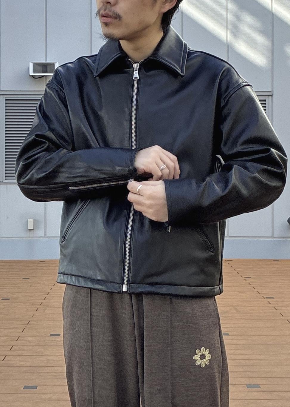 ADAM ET ROPÉ HOMMEラムレザー ジップアップ ブルゾンブラック / M¥64,900レビュー身幅や腕周りはやや余裕があり、僕の体型でMを着用し、インナーに厚手のニットを着用しても窮屈感はありませんでした。着丈自体はスッキリなので、着た時の野暮ったさもありませんでした。