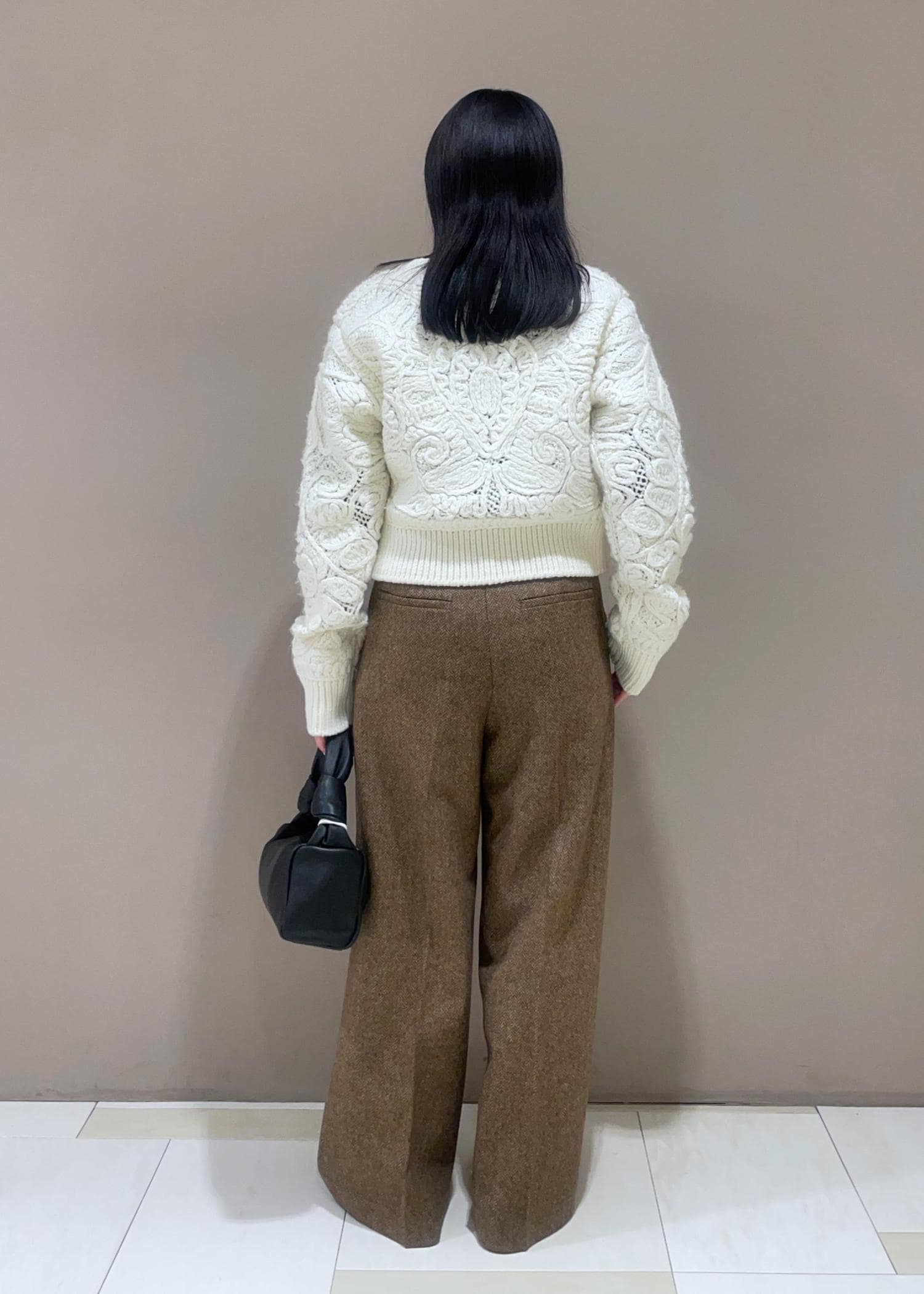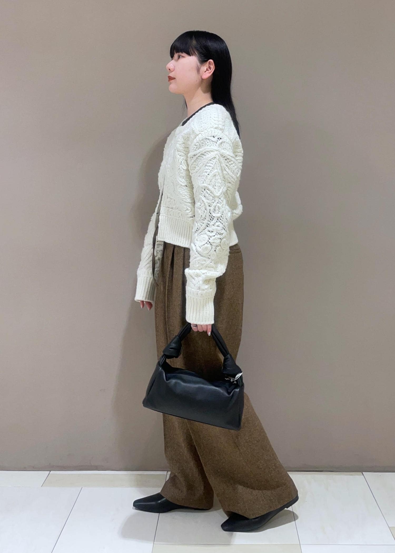 ありがちな色の組み合わせですが、珍しい編み柄のカーディガンと存在感のあるメンズライクなパンツで、個性的にまとめてしました〜◎
