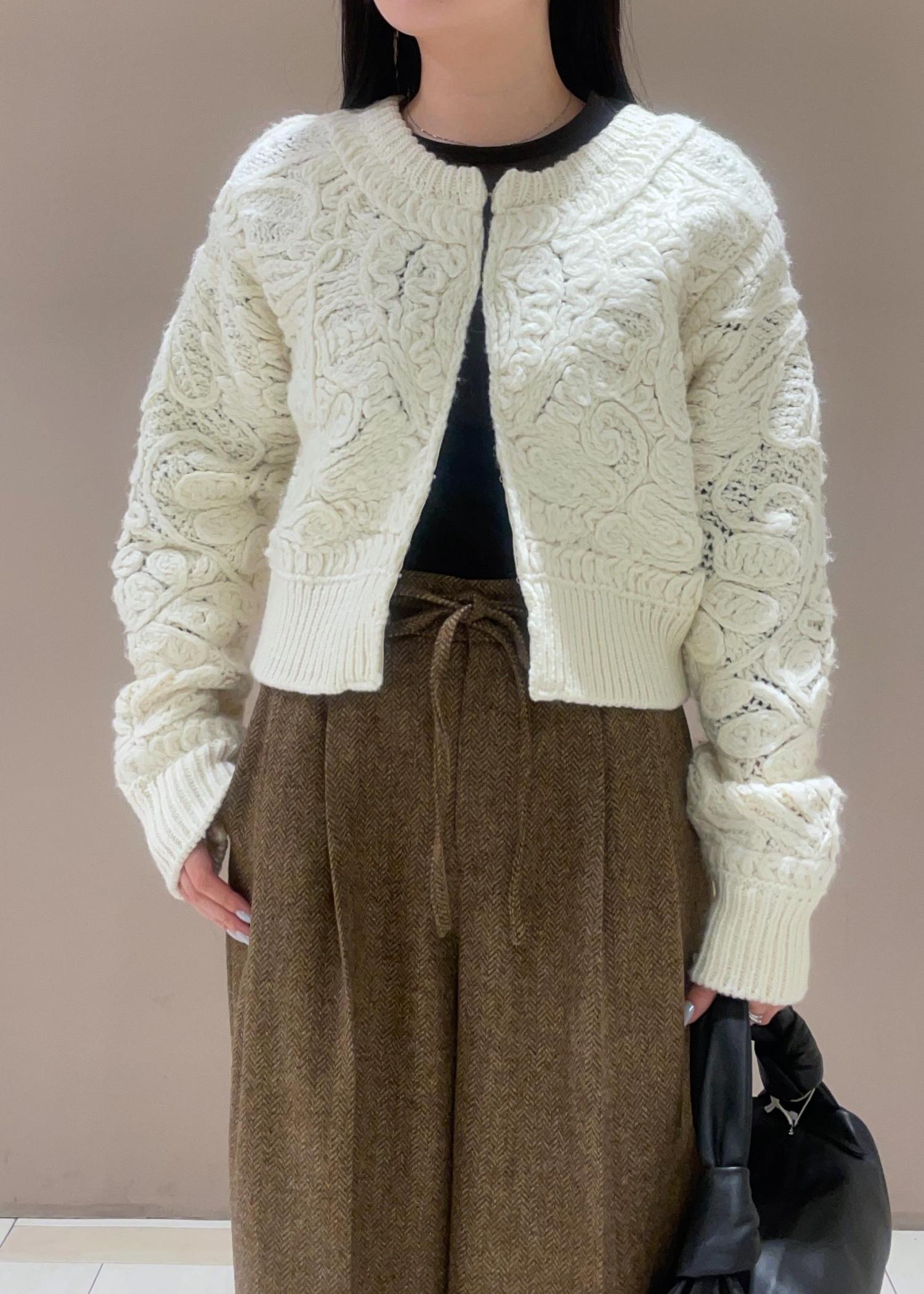 ADAM ET ROPÉ FEMMEコードレースパターンニットカーディガンオフホワイト / F¥23,100レビュー一枚で保温性ばっちりなカーディガン◎ボトムスに困らない短すぎず長すぎずな着丈も便利なポイント◎
