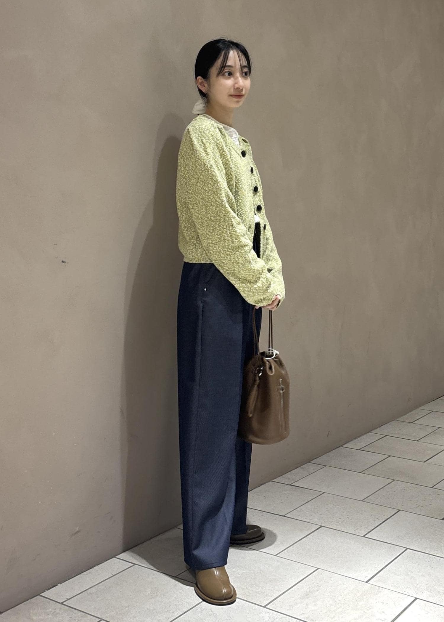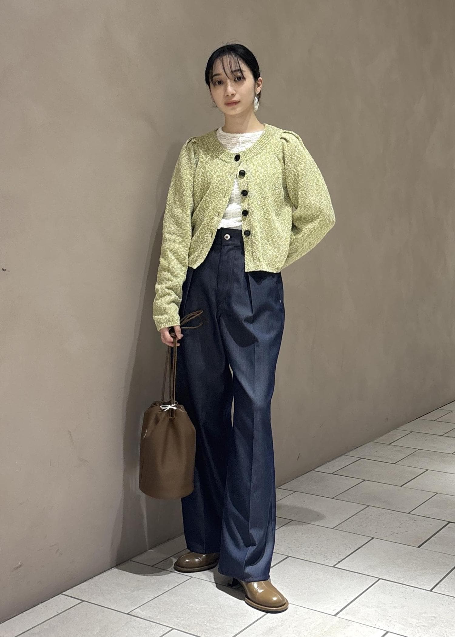 トップスに明るいグリーン系、