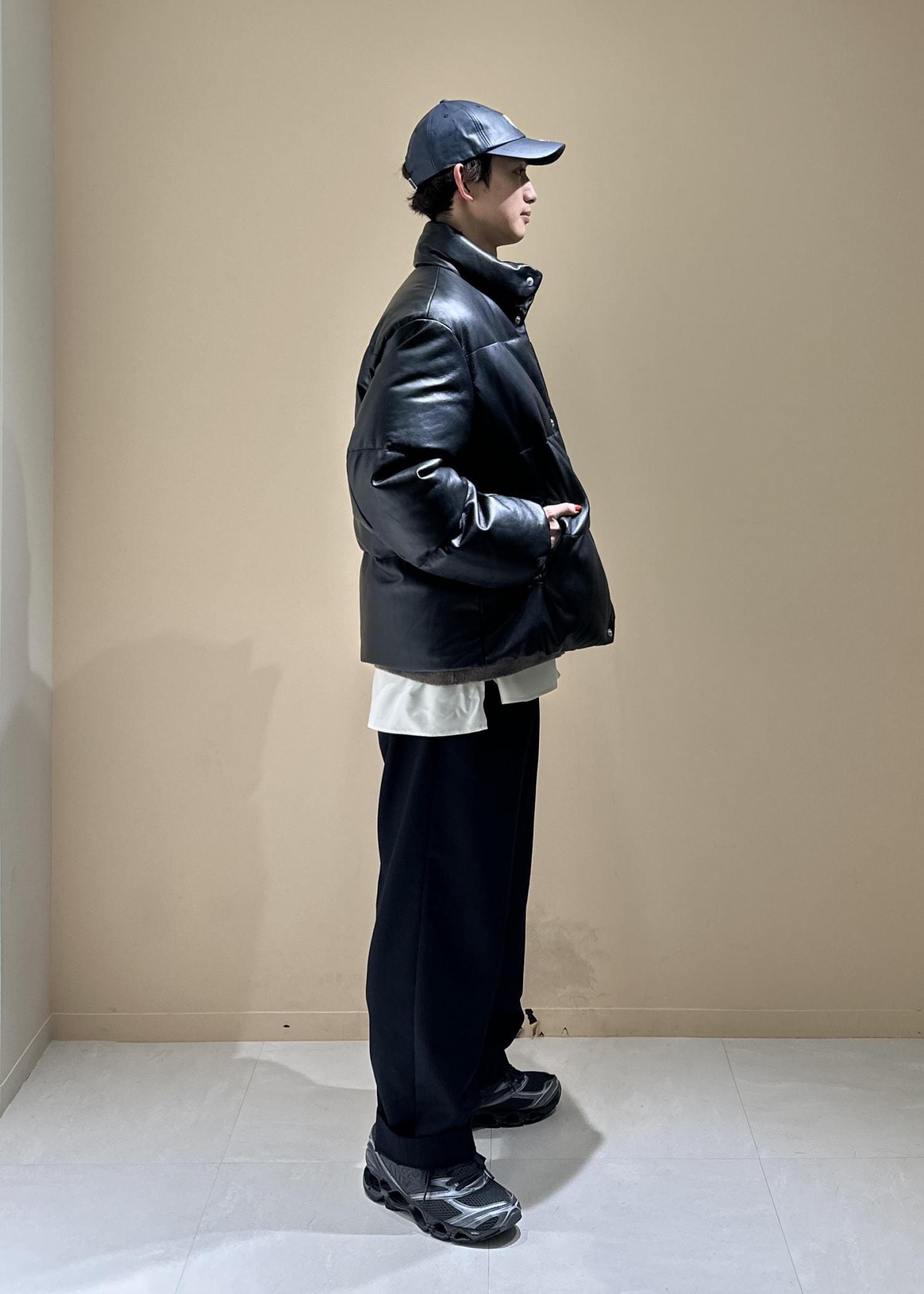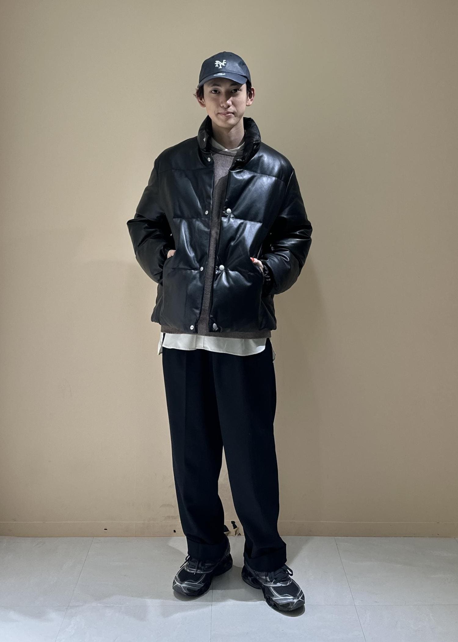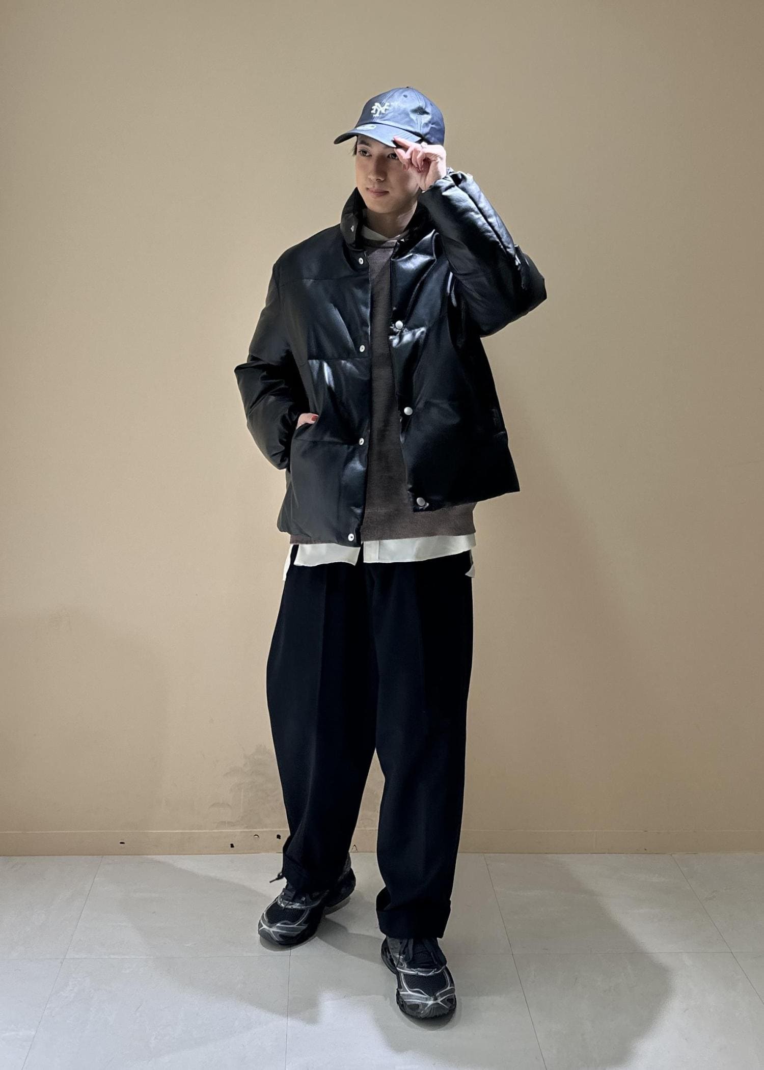 レザーダウンジャケットを主役にスラックス、シャツ×ニットを組み合わせたシンプルなコーデ。レザーダウンをゴツく、いかつく見せないように、スタイリッシュに、程よいラフさを残しつつキレイに合わせてみました。優しいベージュをインナーに差し込んだのもポイントです。