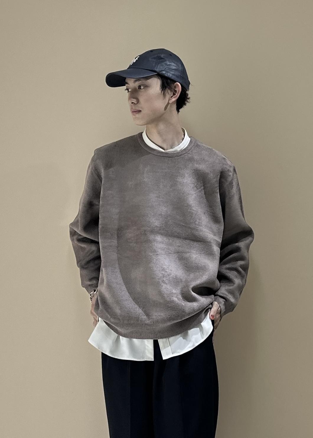 軽やかな着心地、ルーズでリラックス感のある形のニット。毛玉になりにくく、ベロアのような滑らかな肌触りです。無地で合わせても生地感のおかげて殺風景に見えないような汎用性の高いニットです。 -