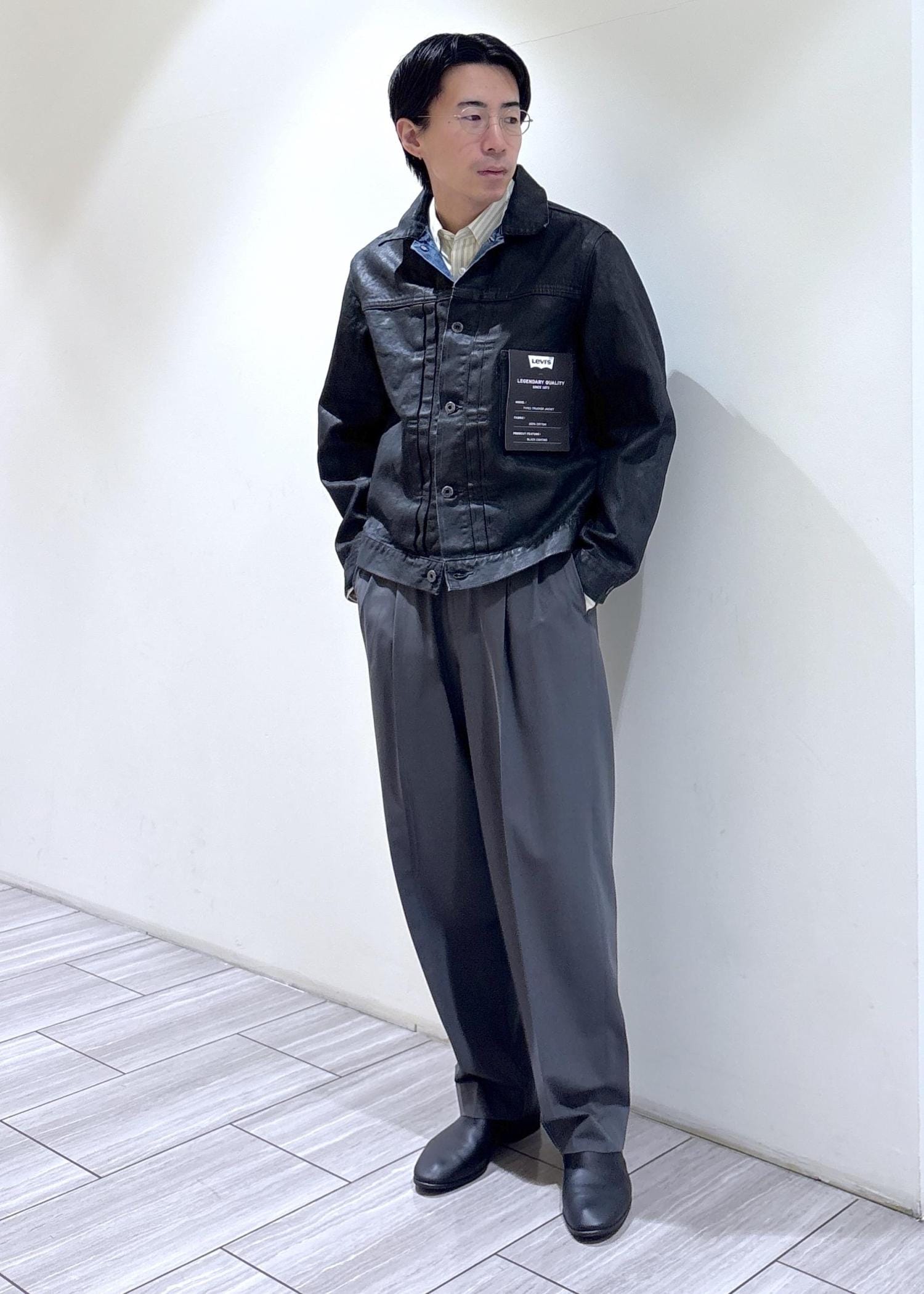 本日は、NIKKE素材のシャツブルゾン×センタープレスパンツをセットアップでスタイリングしました。