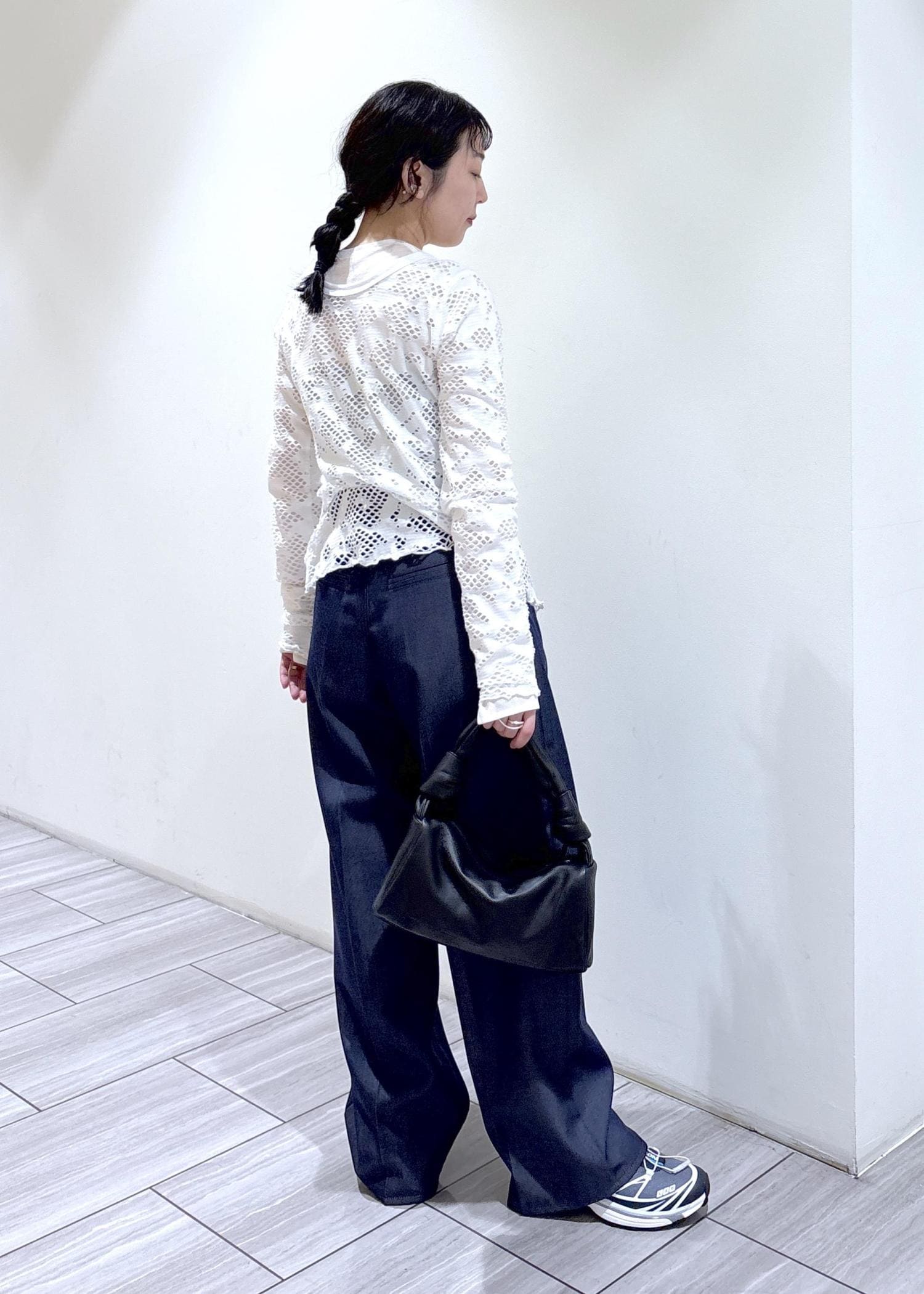 ジャガードの上品な透け感のトップスに、綺麗なシルエットと素材のデニムスラックス合わせ^ ^
