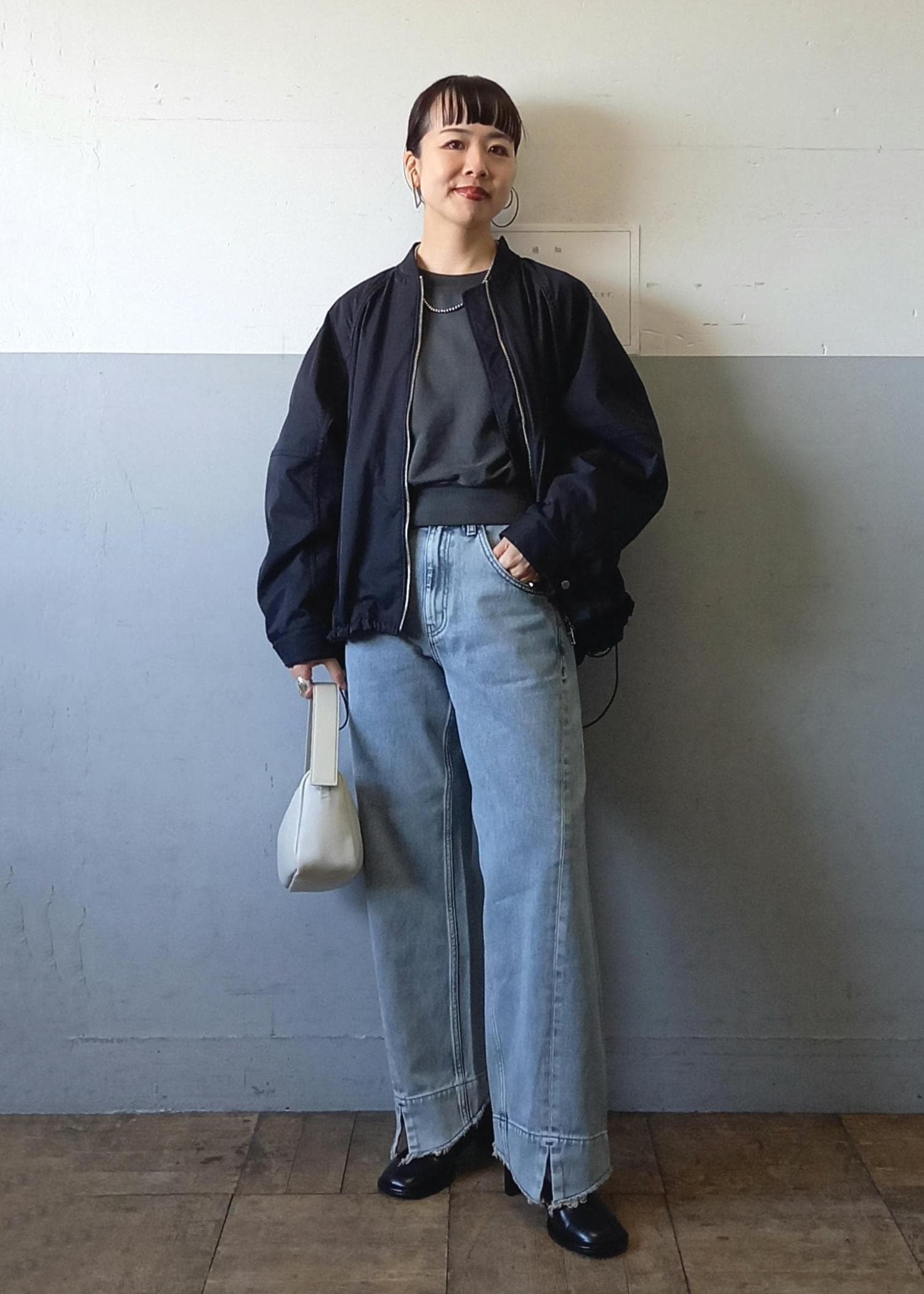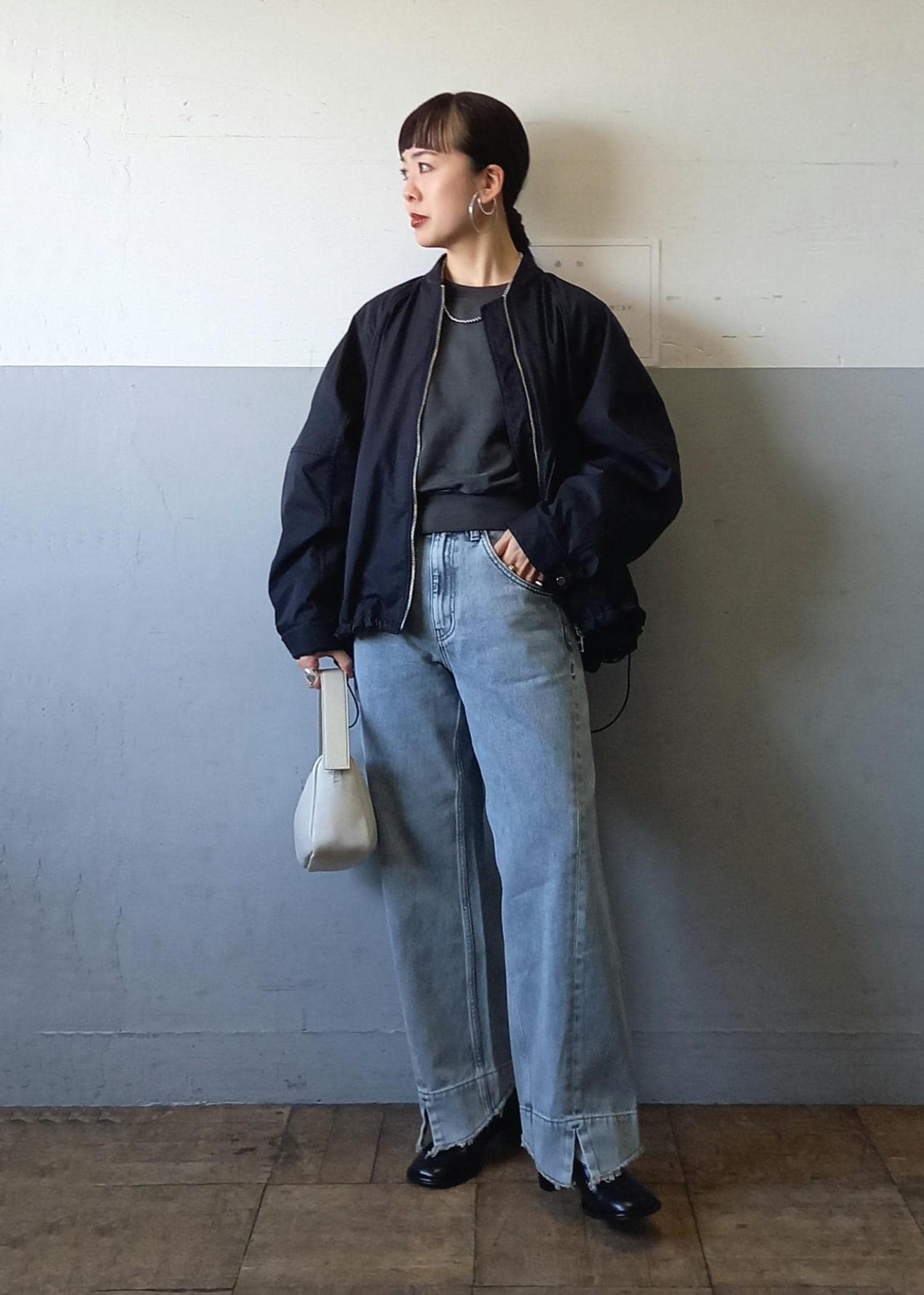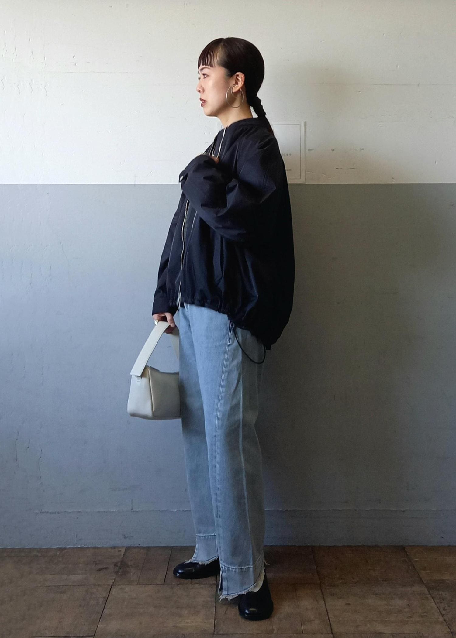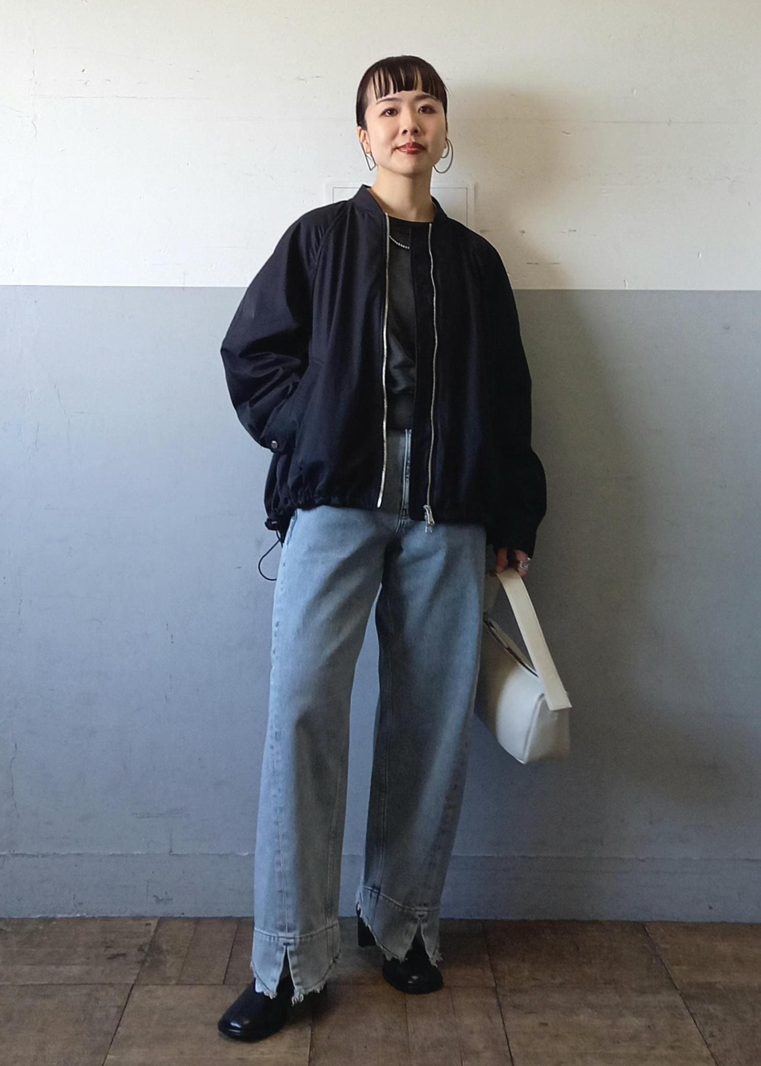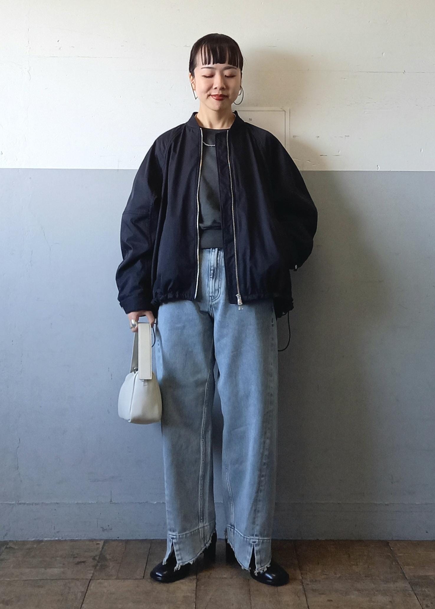 ブルゾンと言っても袖口や裾はリブ仕様ではないのでカジュアルすぎずきれい目にも合わせていただきやすいです☺️テントラインでも、裾のドローコードを絞って丸みのあるフォルムでも着れるのでシルエットの変化を楽しんでいただけますよ✨ -