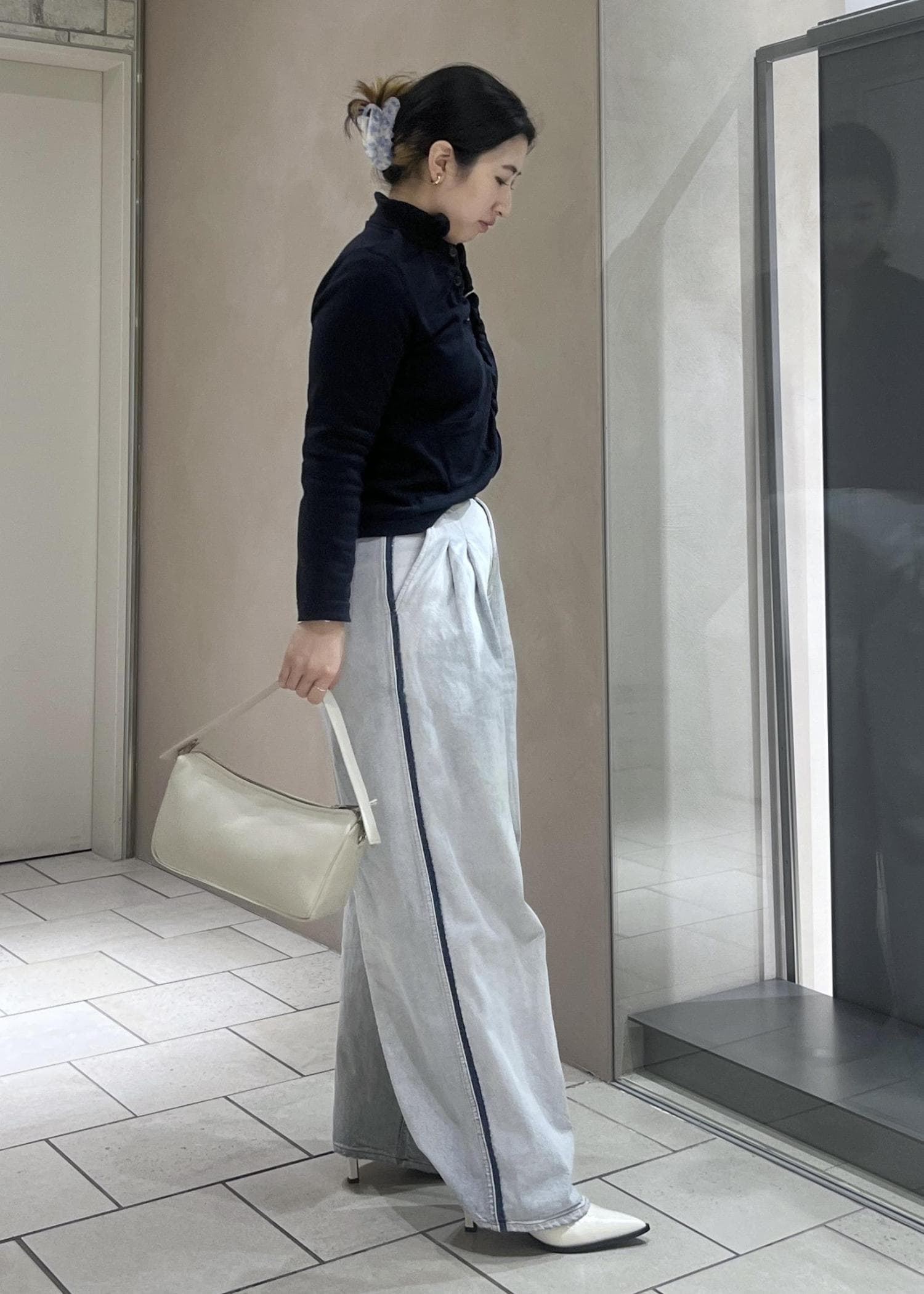 EMOELLE【EMOELLE】・【サステナブル】ドレスデニムパンツサックス / 38¥22,000レビューワイドパンツですが、綺麗めな感じもあるので使いやすいです!下半身のボリュームが気になる私も38でゆるっと履けます。サイドのラインがスタイルもよく見せてくれて、スポーツミックスな感じも出せます。ジャケット合わせやTシャツなんでも合うので1本は持っておきたいアイテムです!