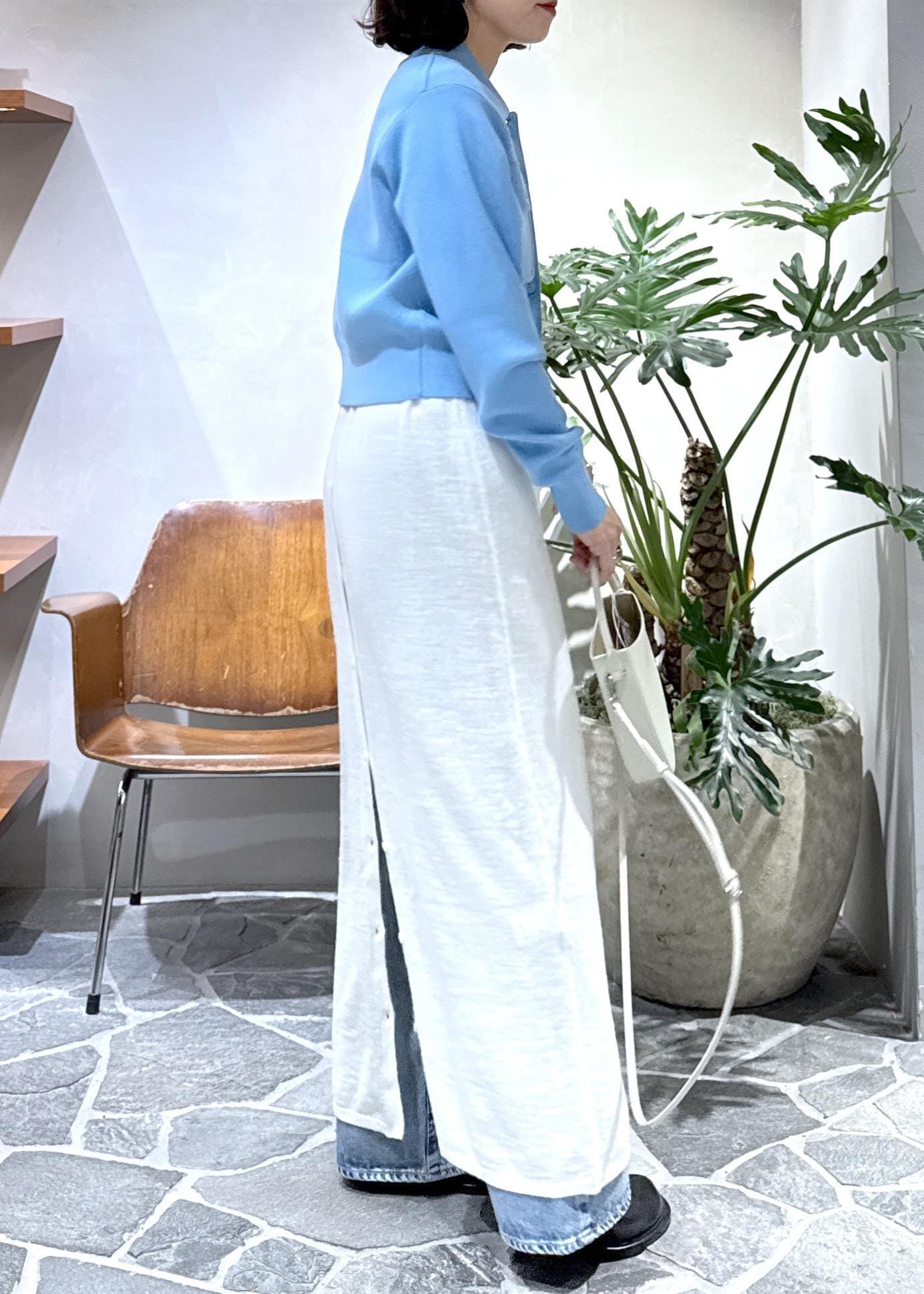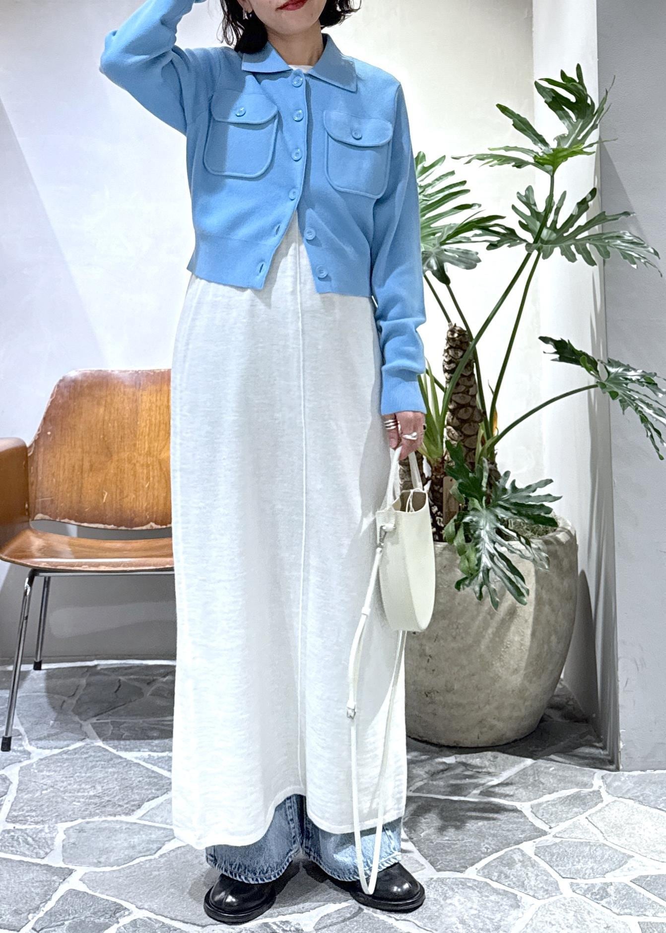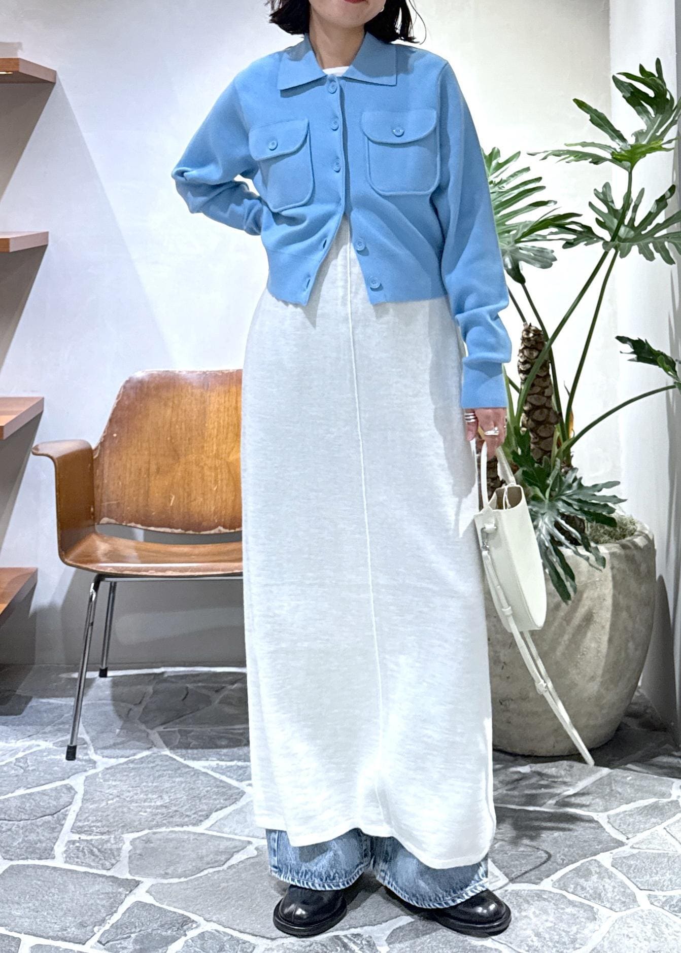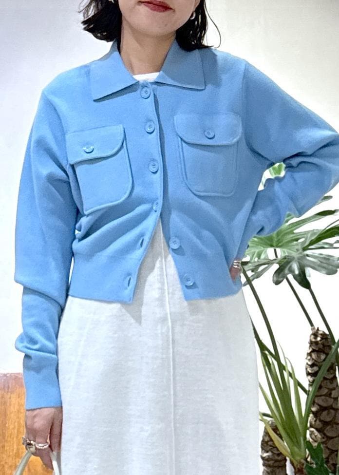 鮮やかなブルーが可愛いコットンカシミヤのカーディガンは、短丈なのでロングスカートとの相性抜群!