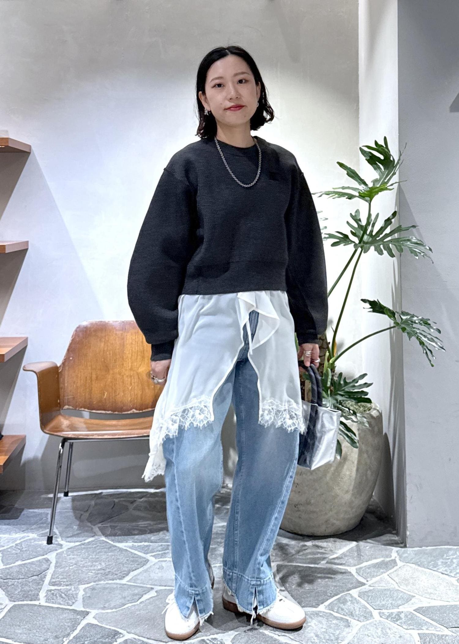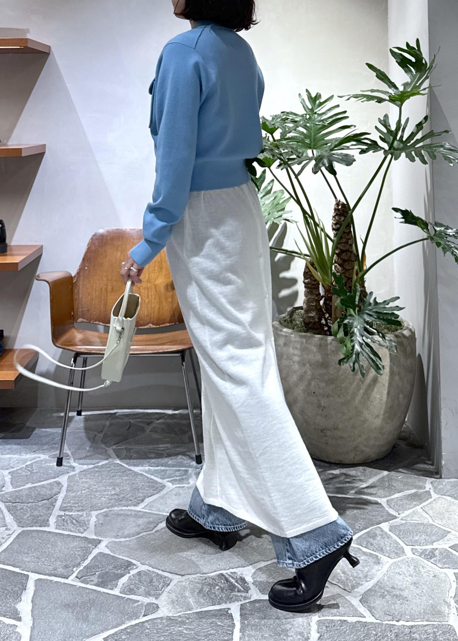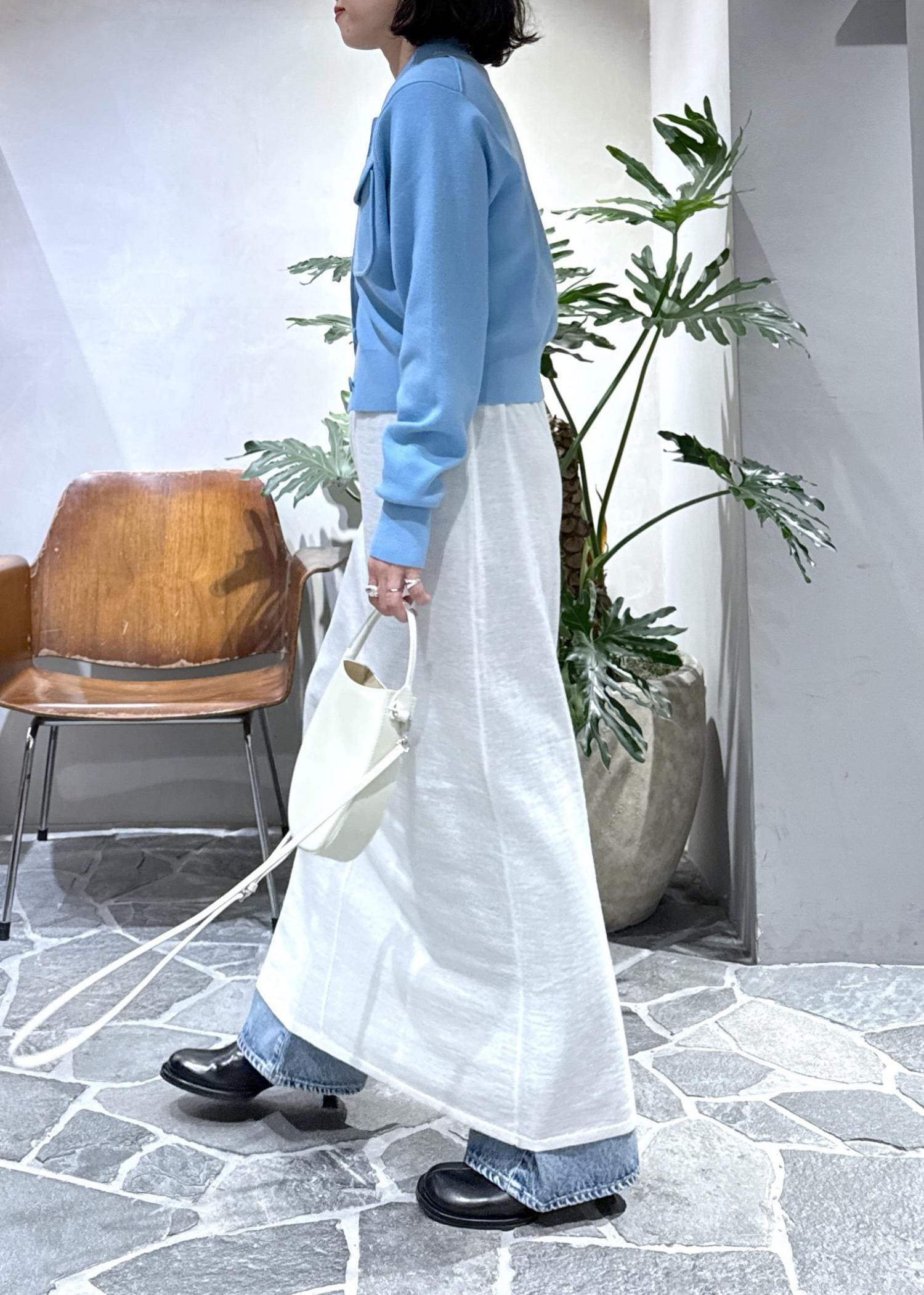 インナーにブルーデニムを合わせて、ブルー×ホワイトの爽やかなカラーで、春を先取りコーデです!