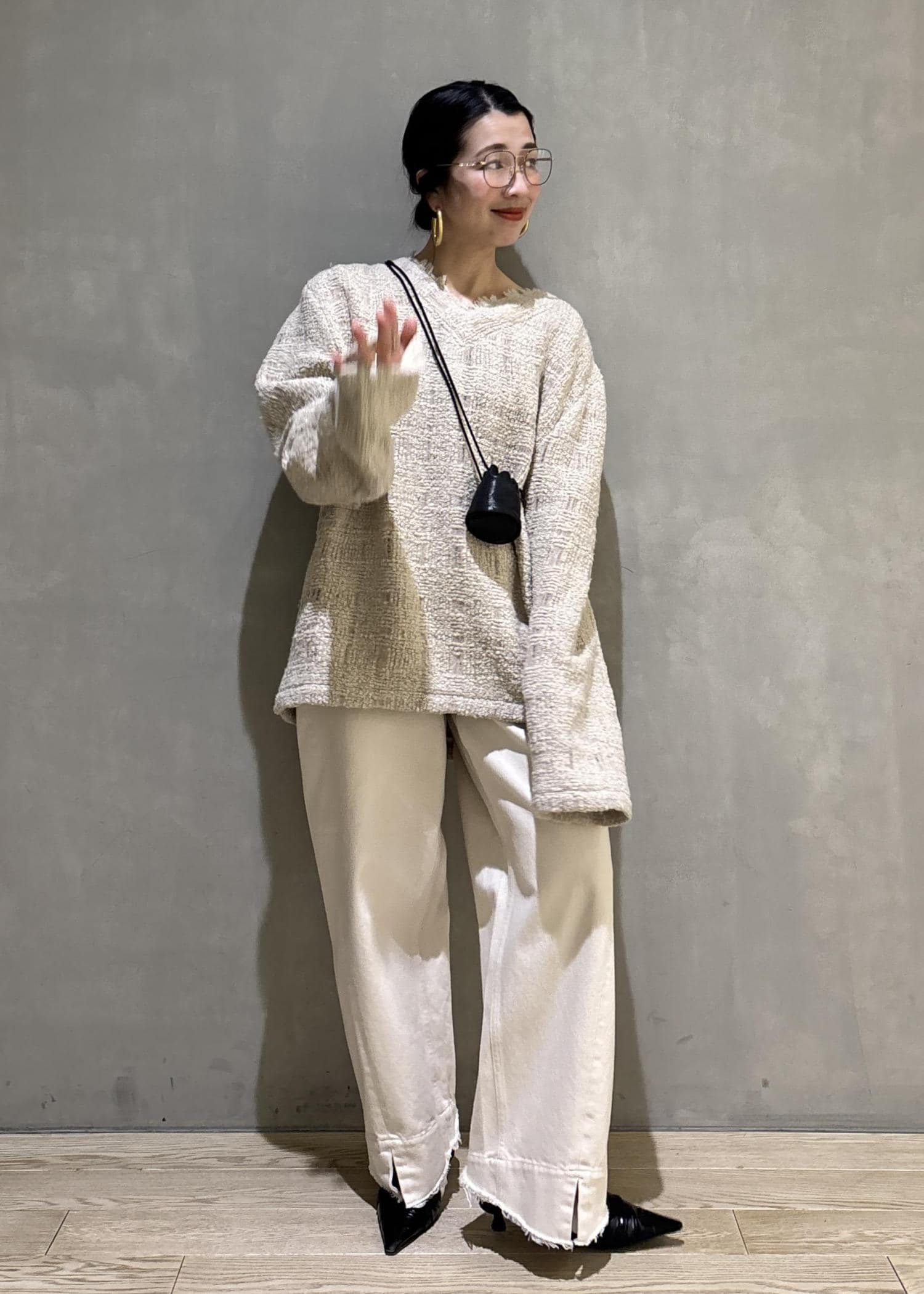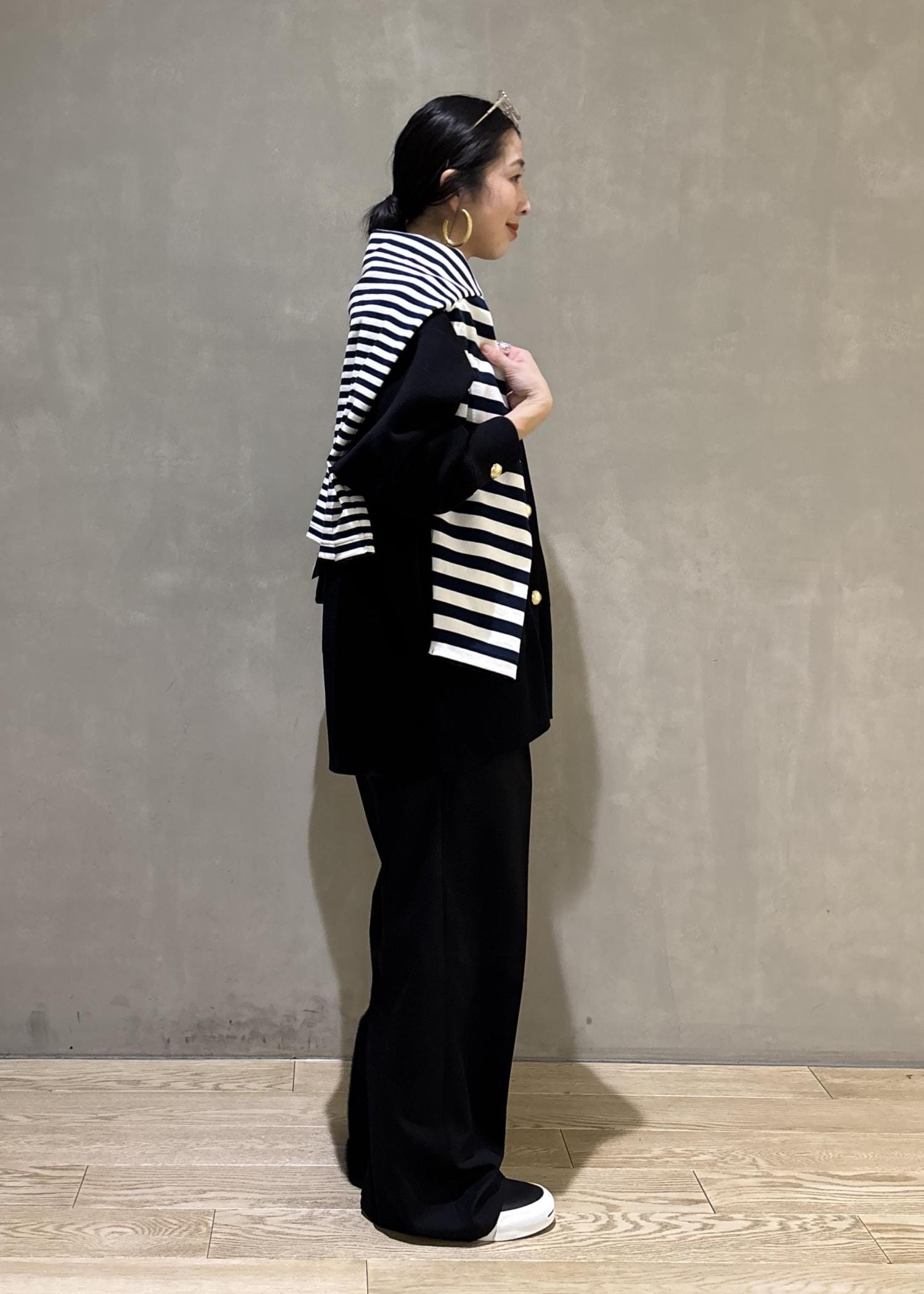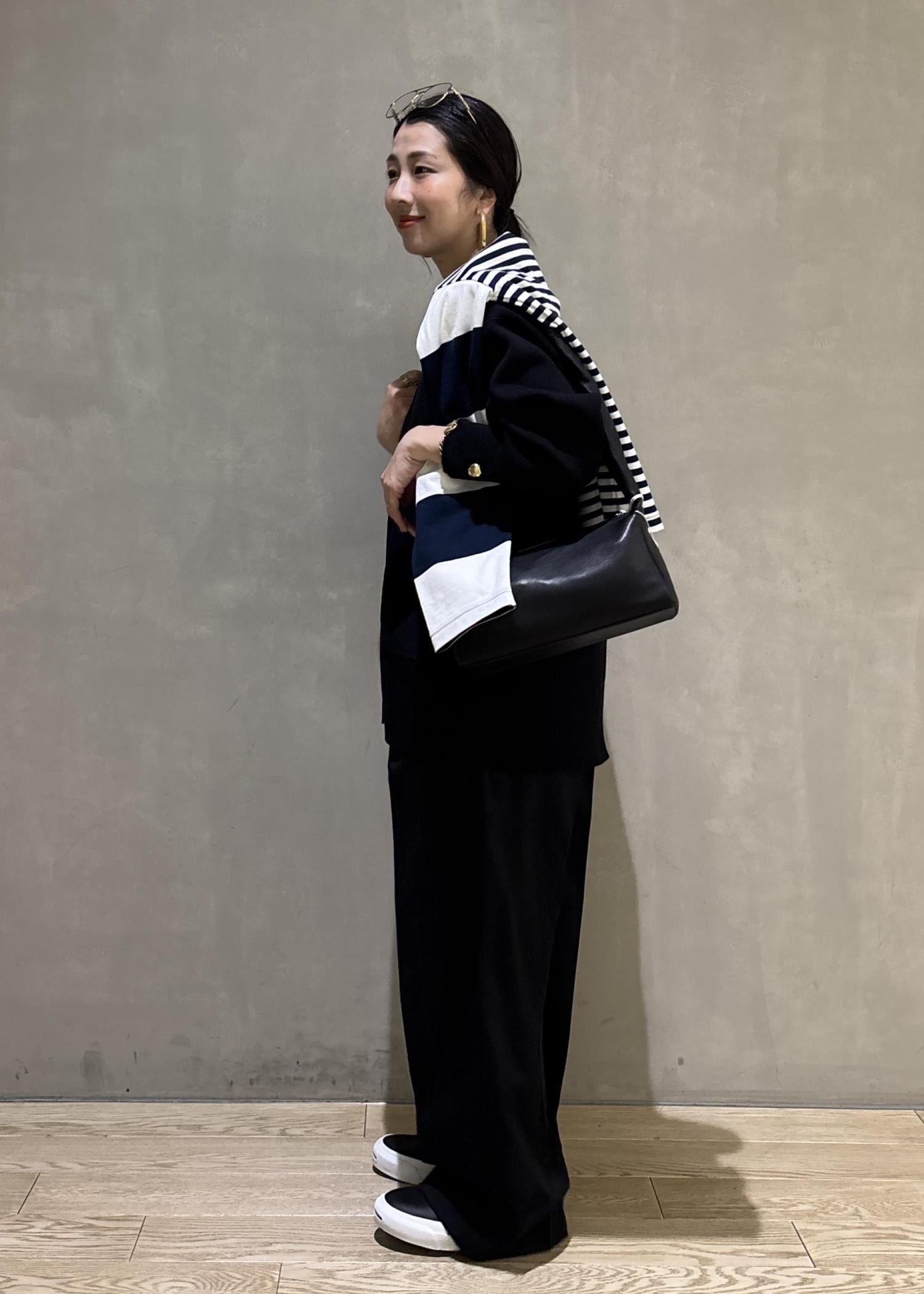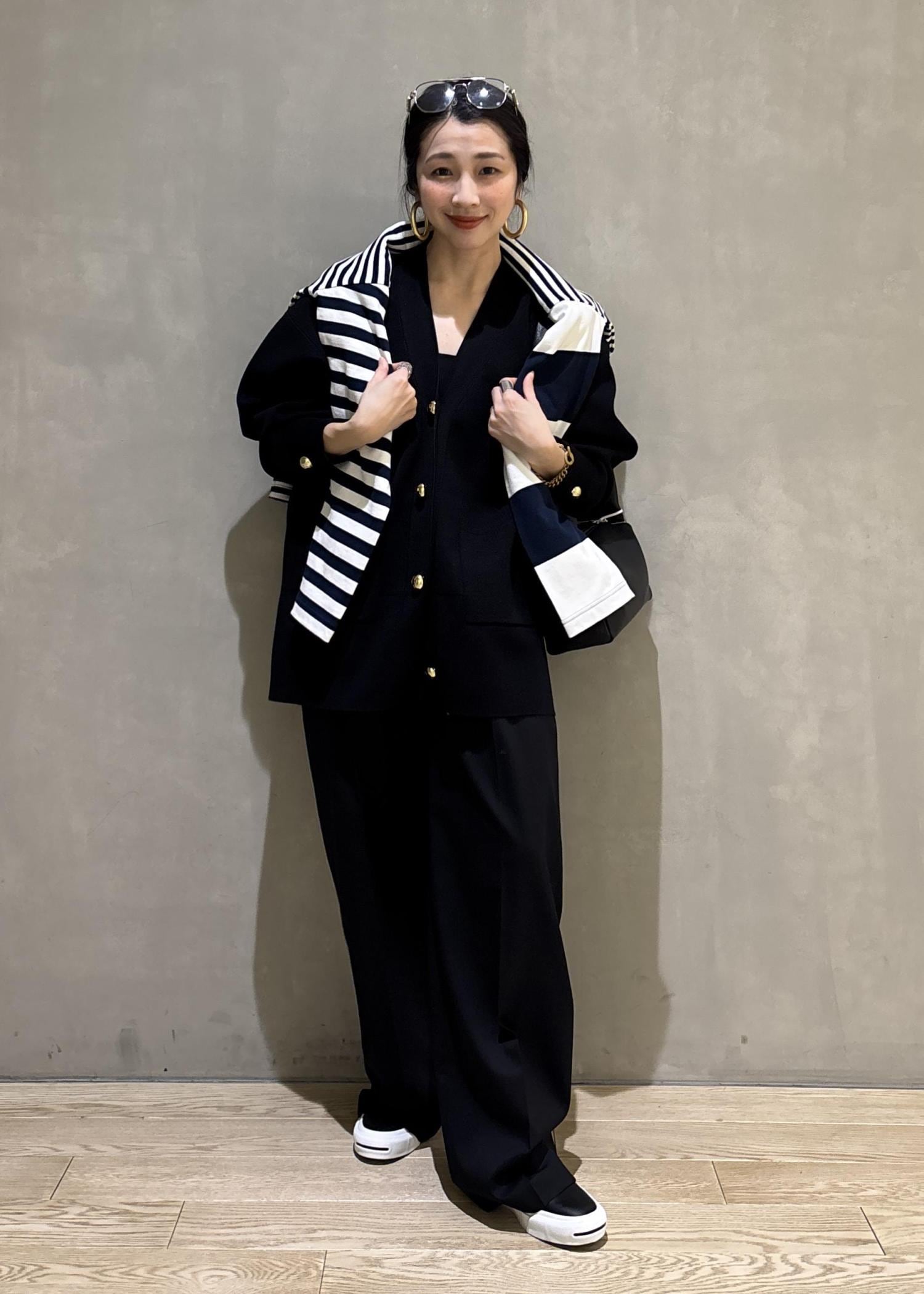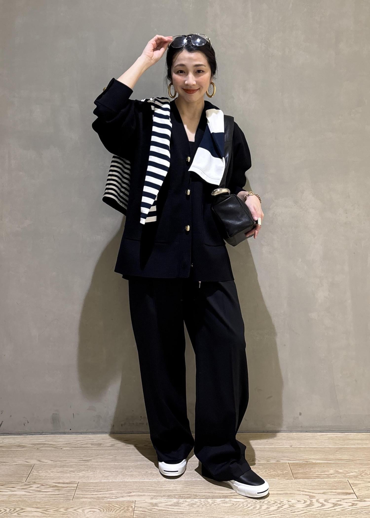 ゴールドボタンやシルエットがとても上品なカーディガンですが、あえて小物やシューズはカジュアルダウンし、綺麗めなスタイリングをカジュアルに落とし込んだ大人なスタイルです。