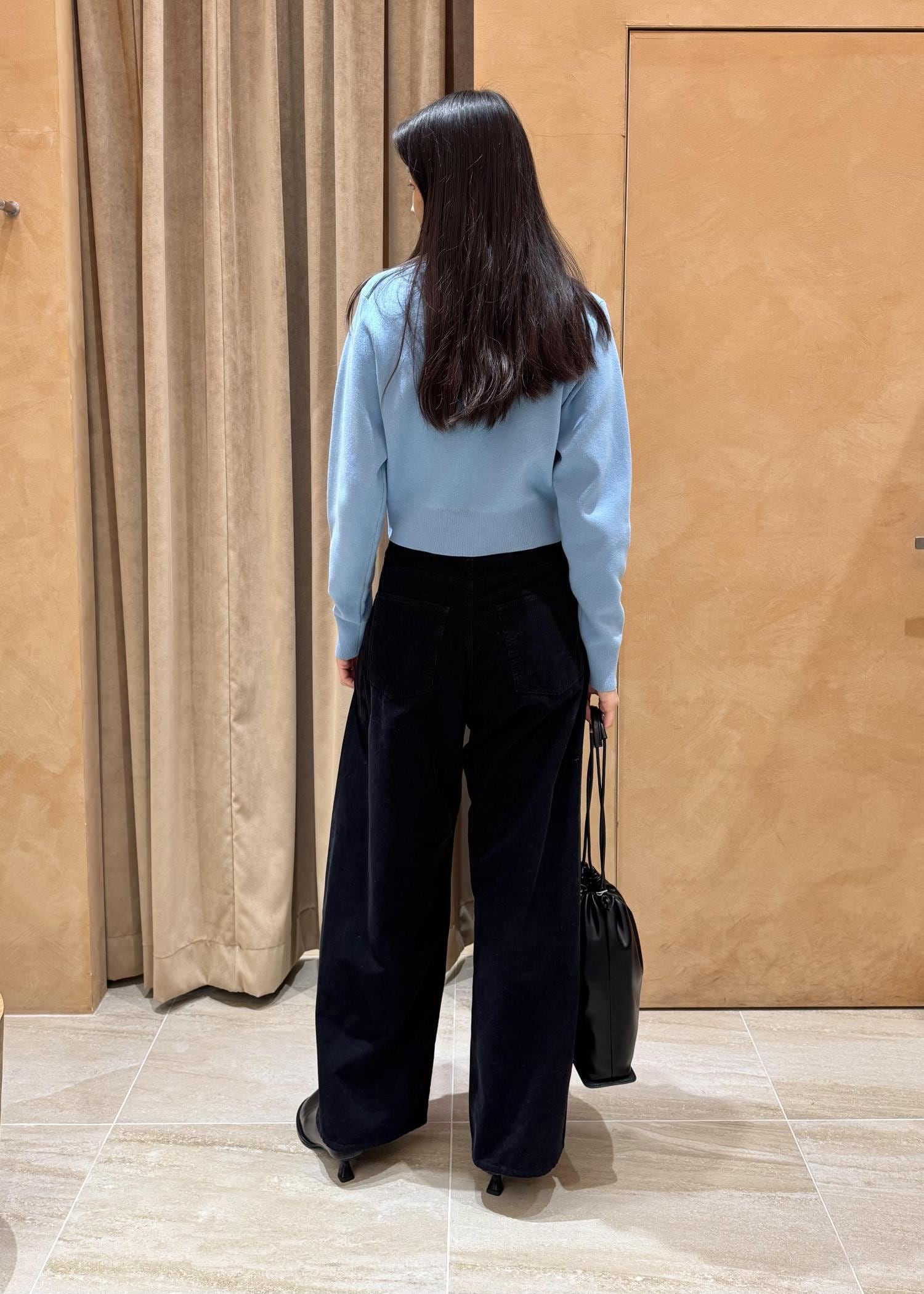 コットンカシミヤポケットカーディガンを使用したスタイリングです。