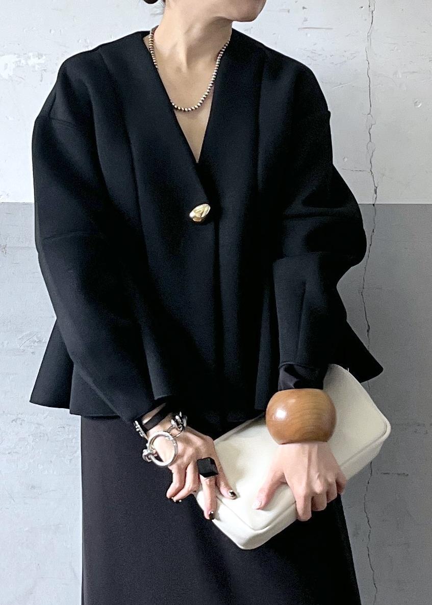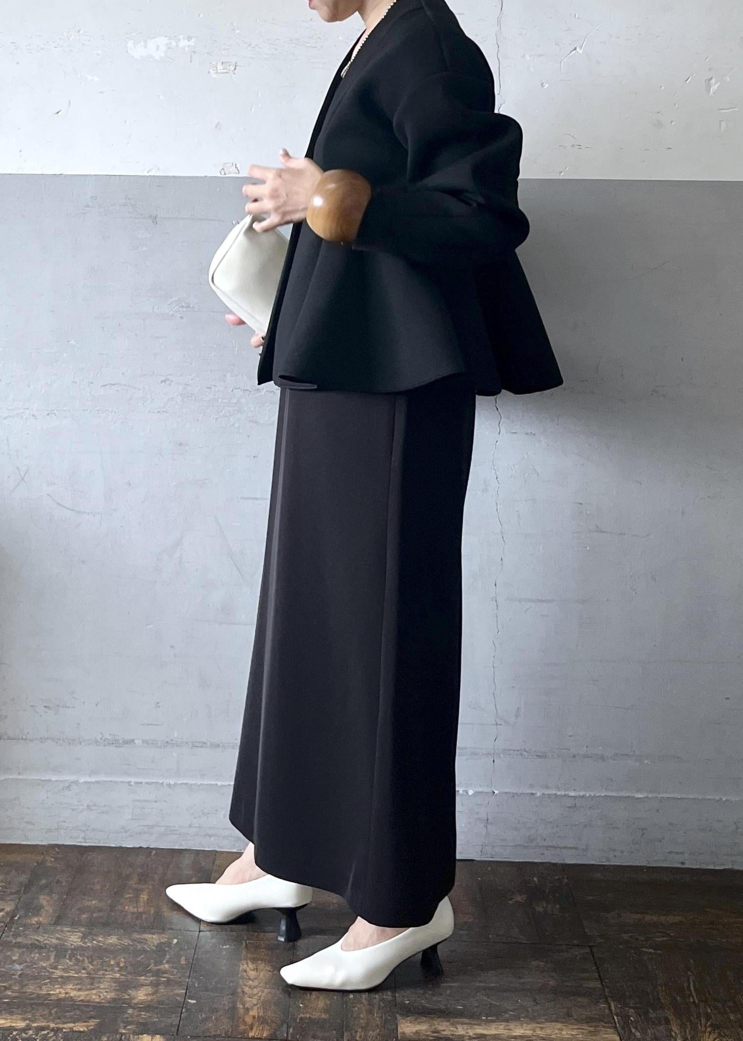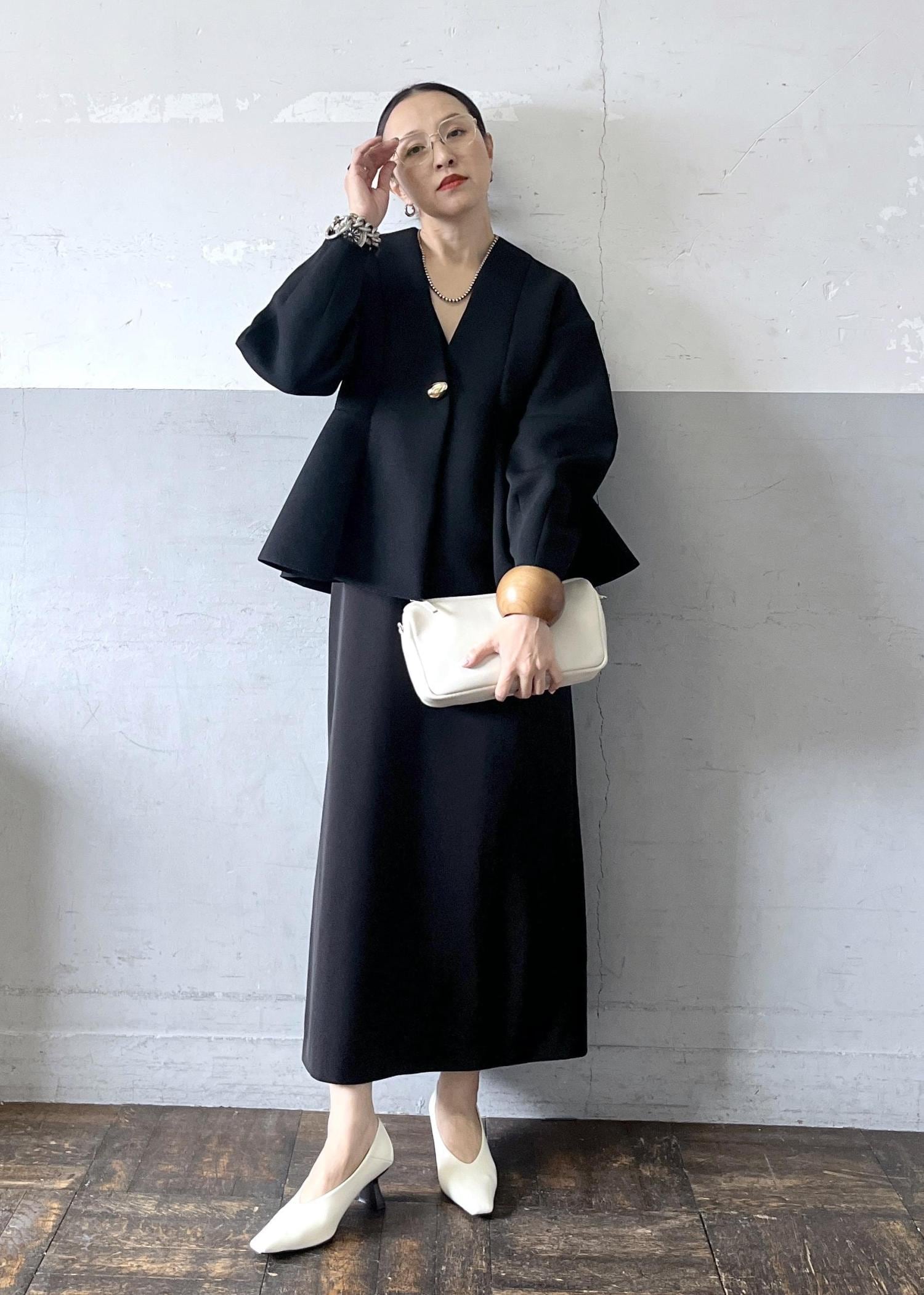ペプラムシルエットのカーディガンを主役にしたオケージョン提案。