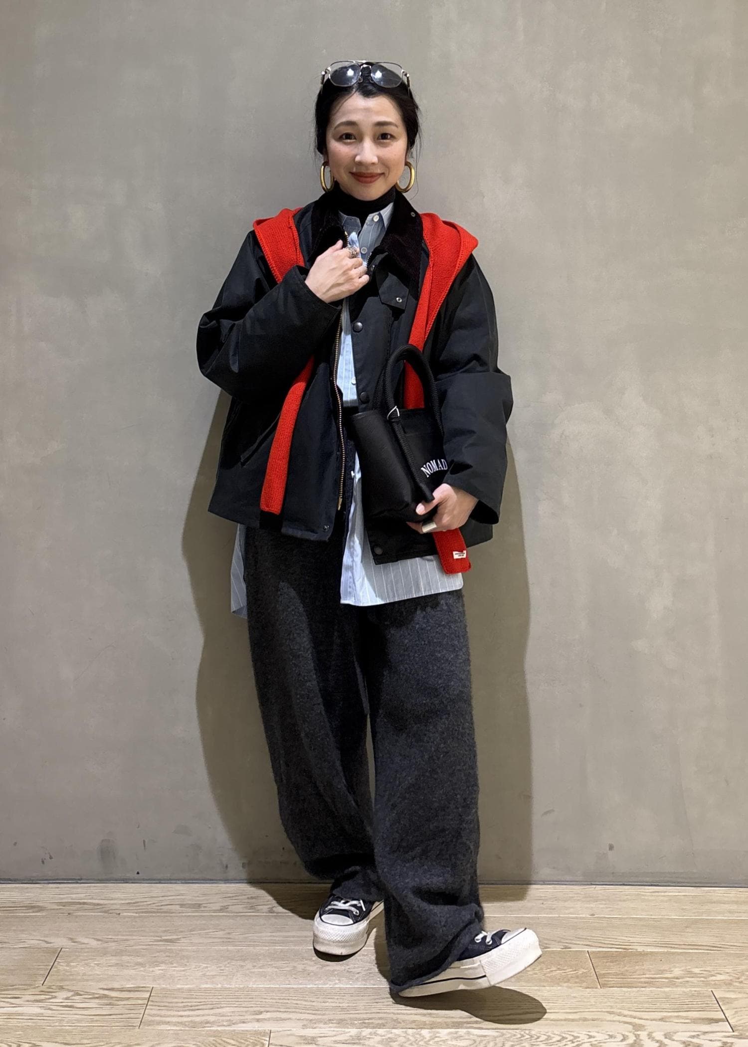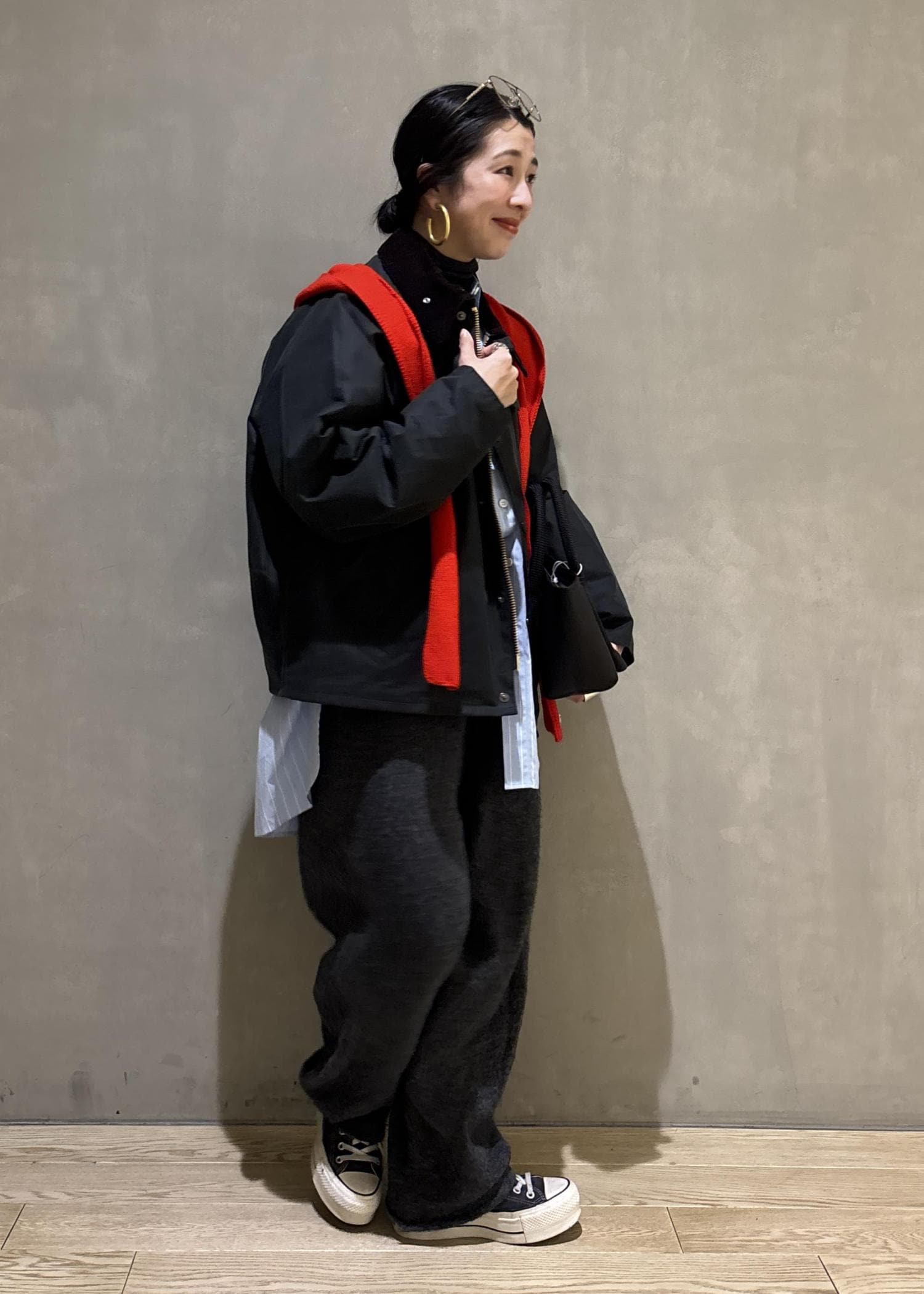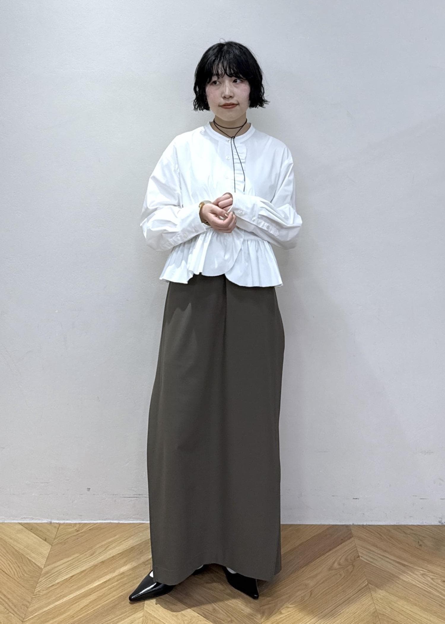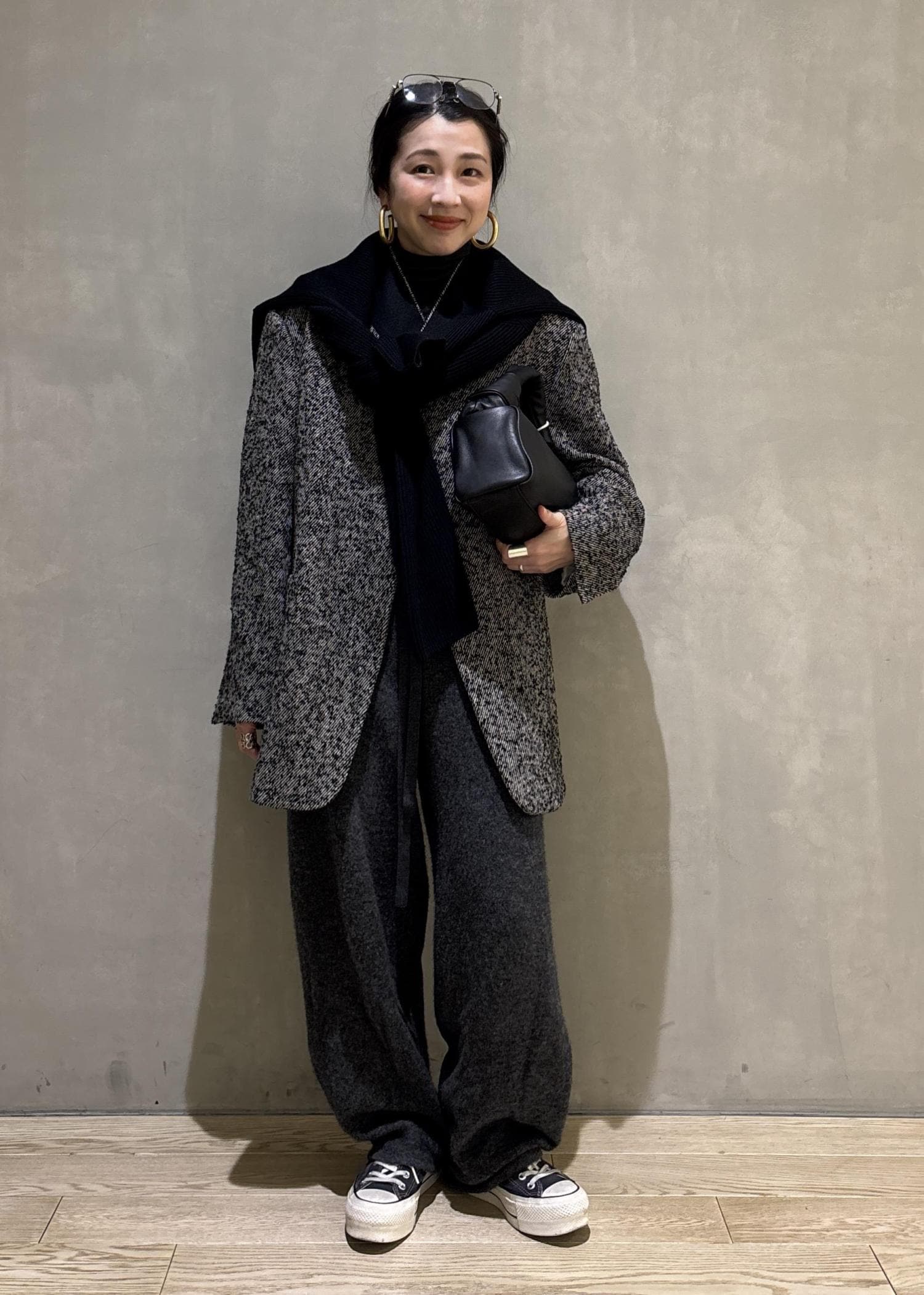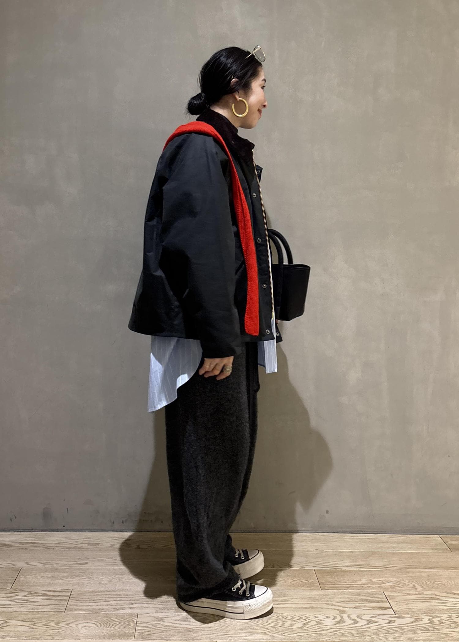 クラシカルなシャツとニットパンツのカジュアルなボトムとの組み合わせで少しメンズライクな雰囲気でまとめてます。