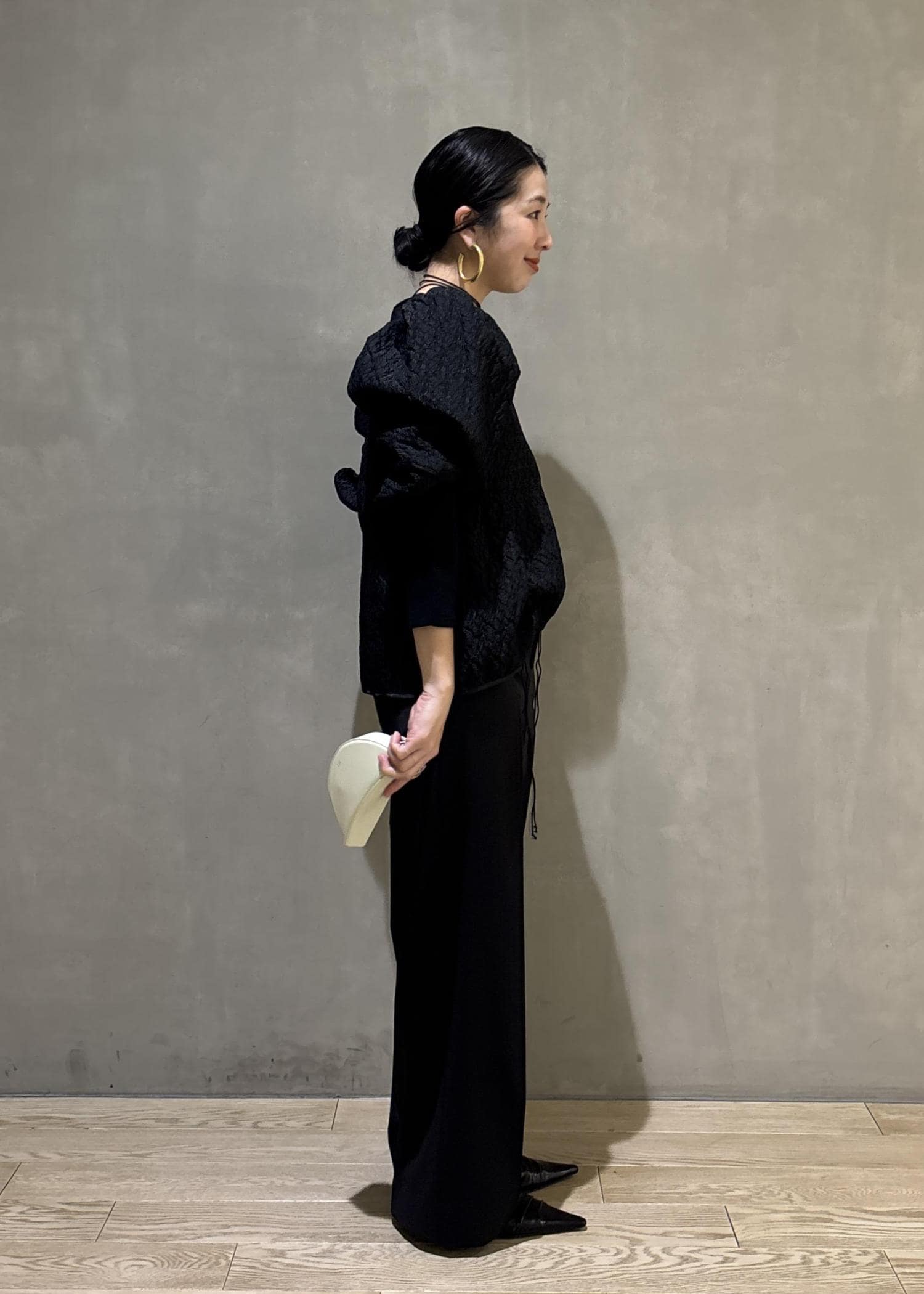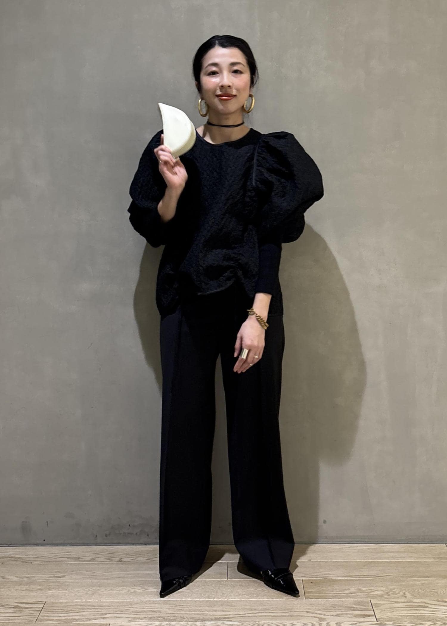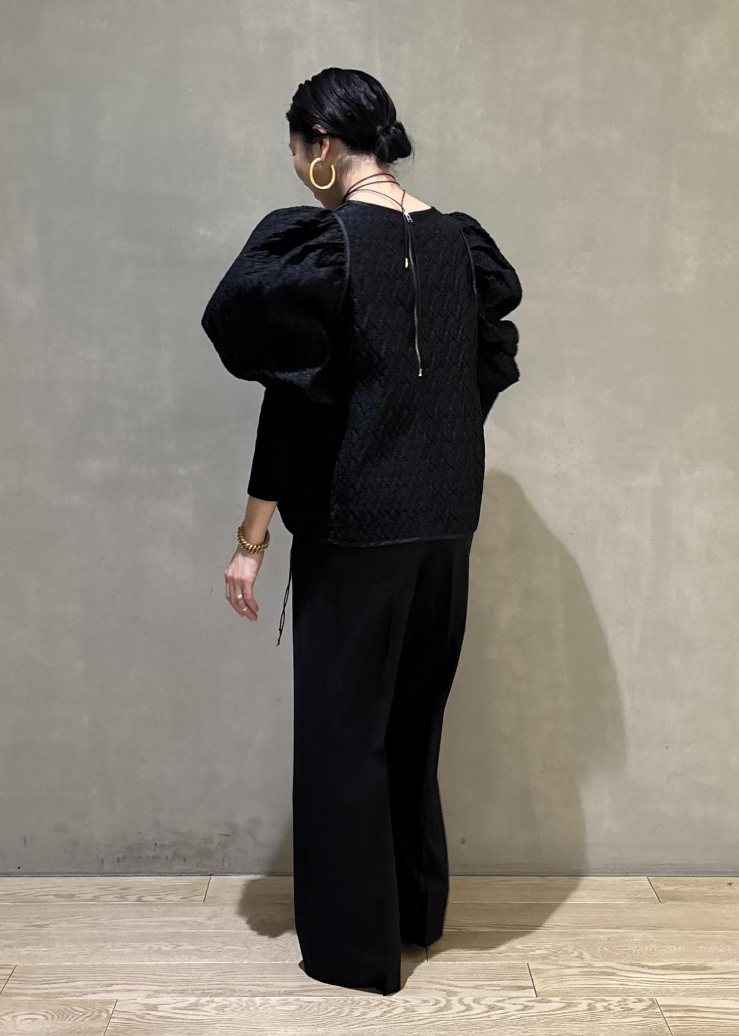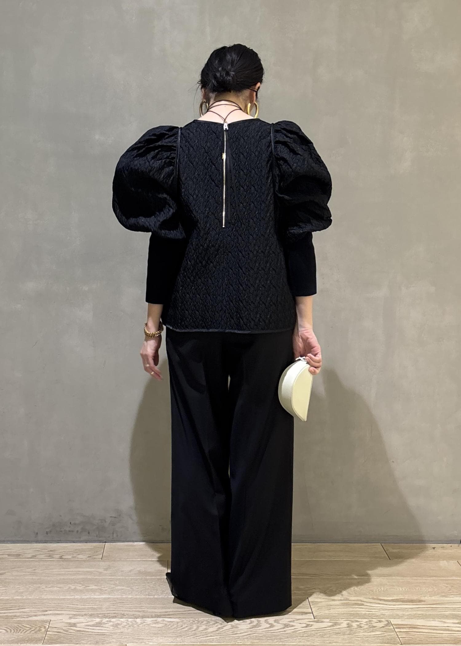 かたまわりにボリューム感のあるブラウスをあえてパンツでカッコよくてコーディネートし、甘さを中和してみました。