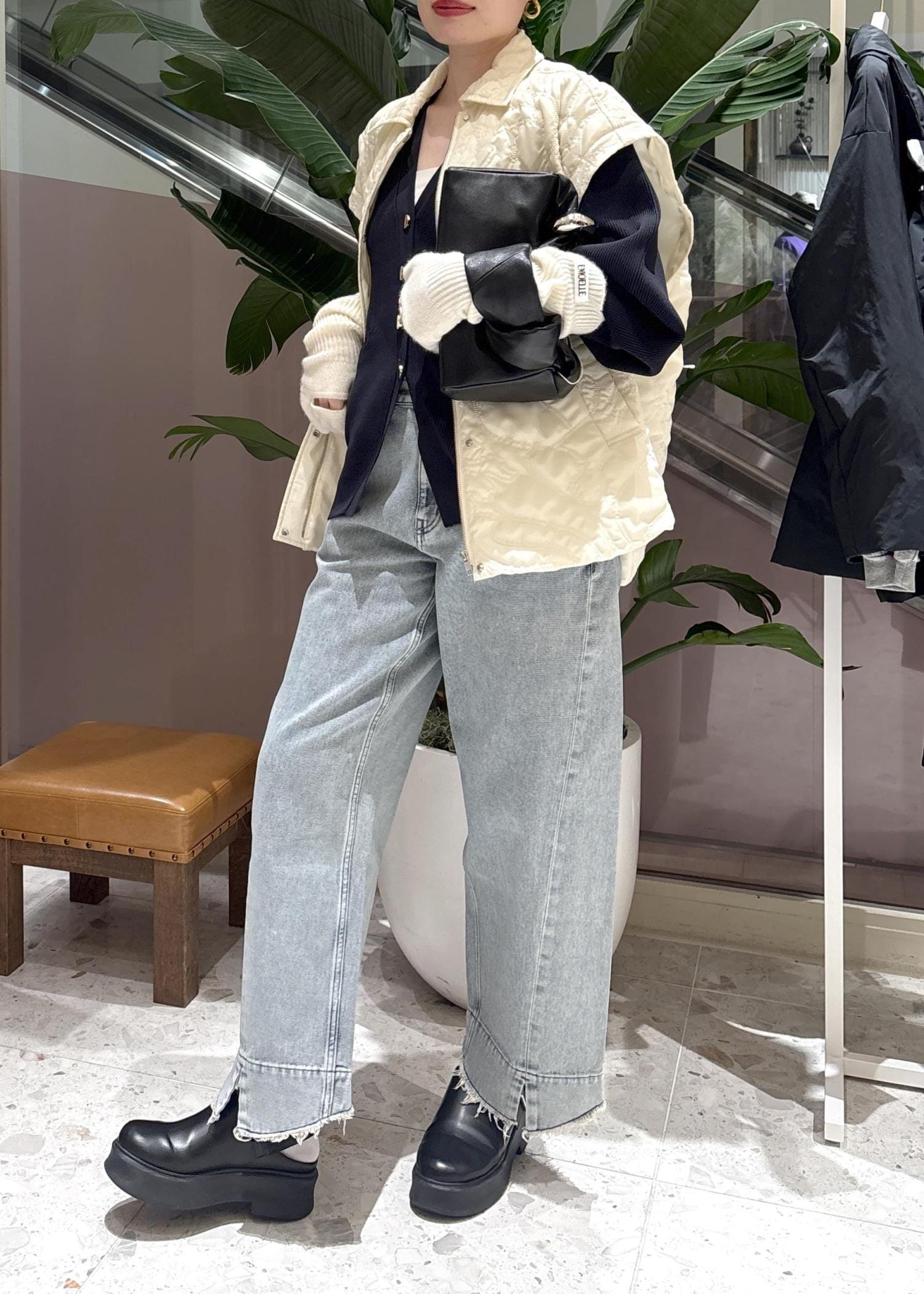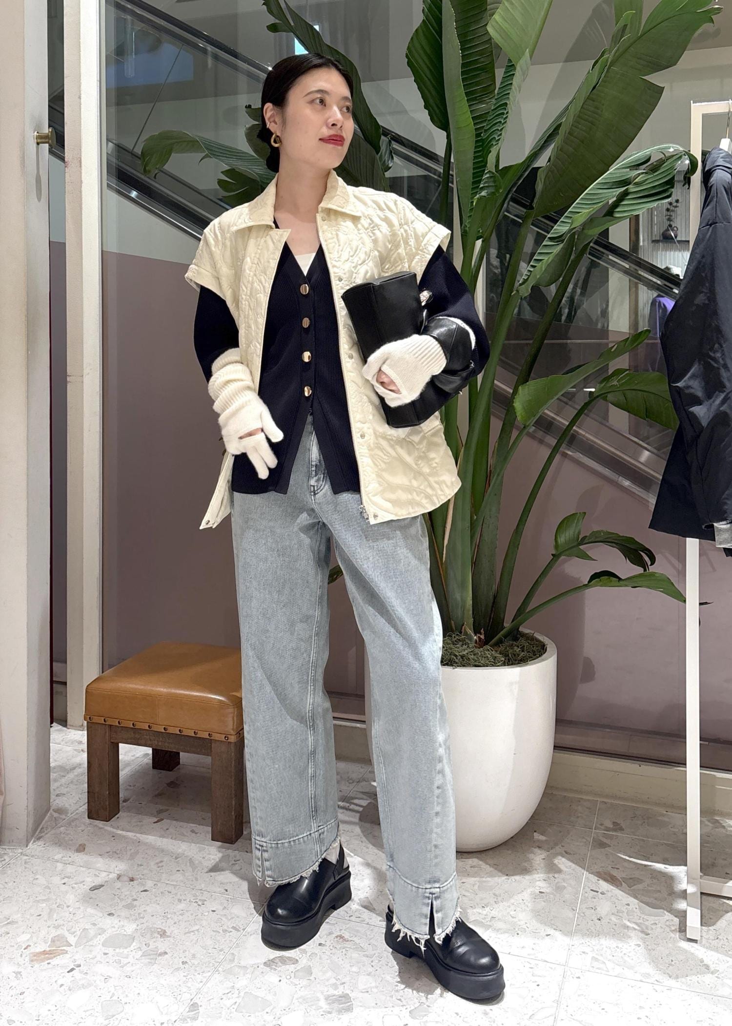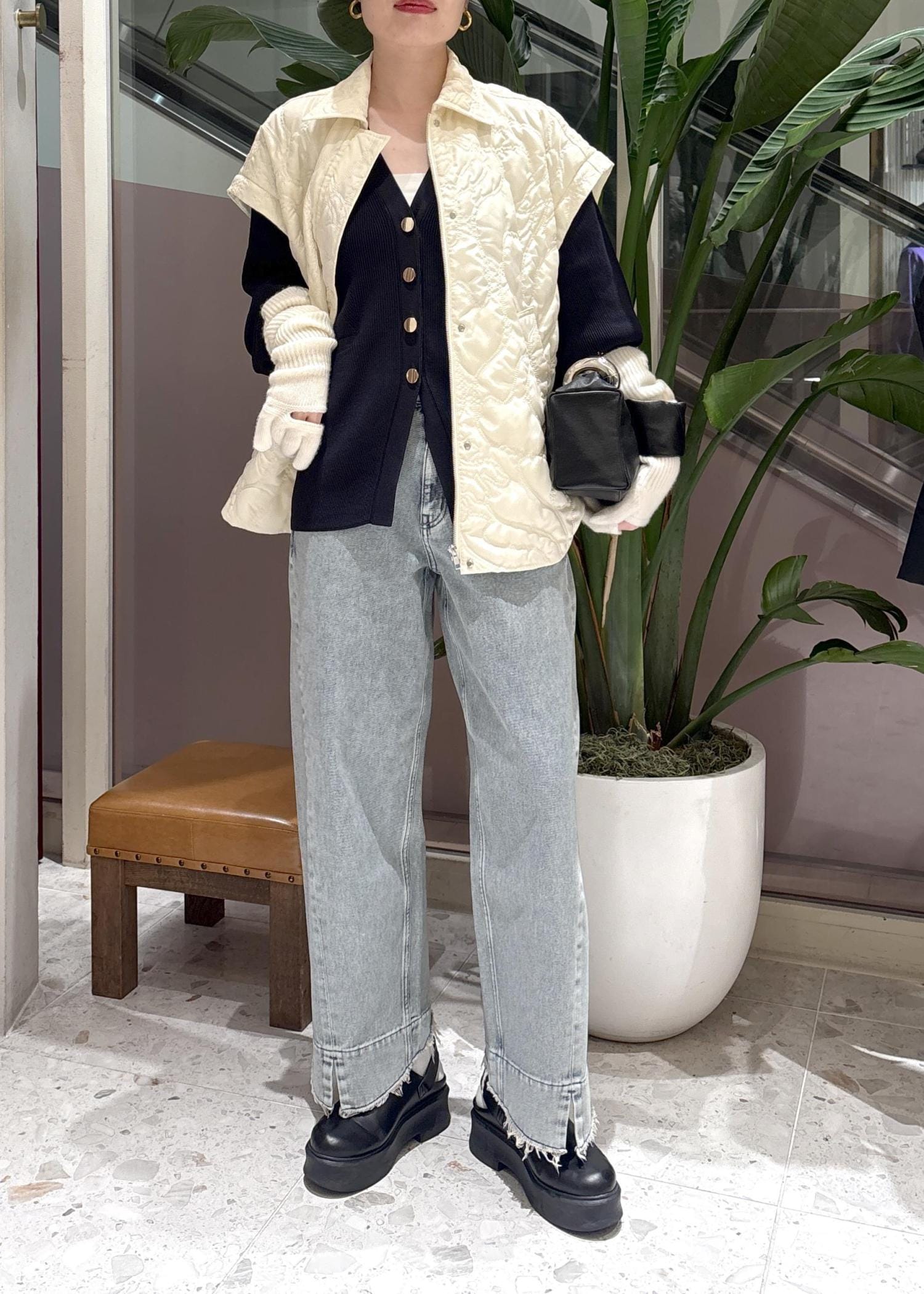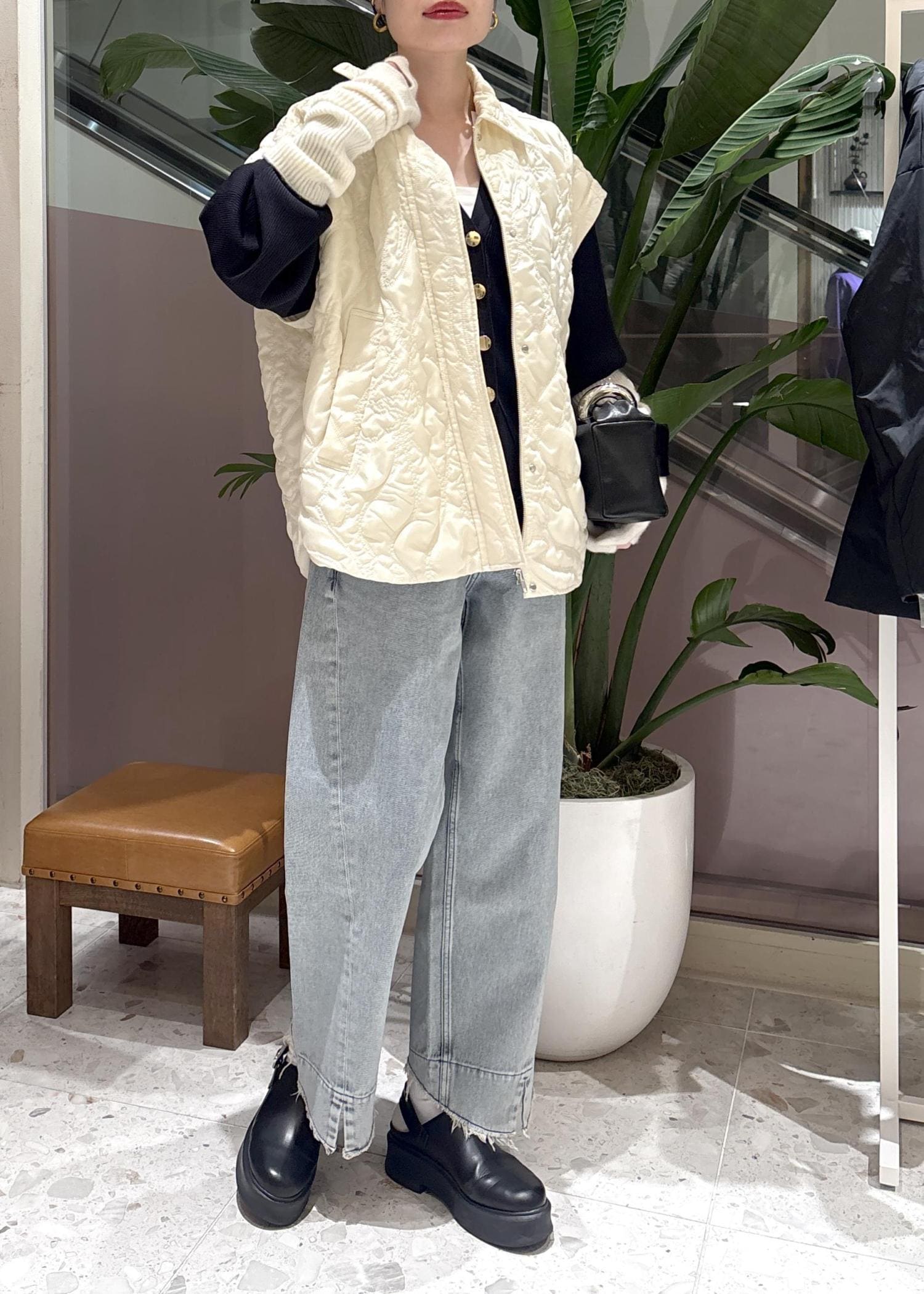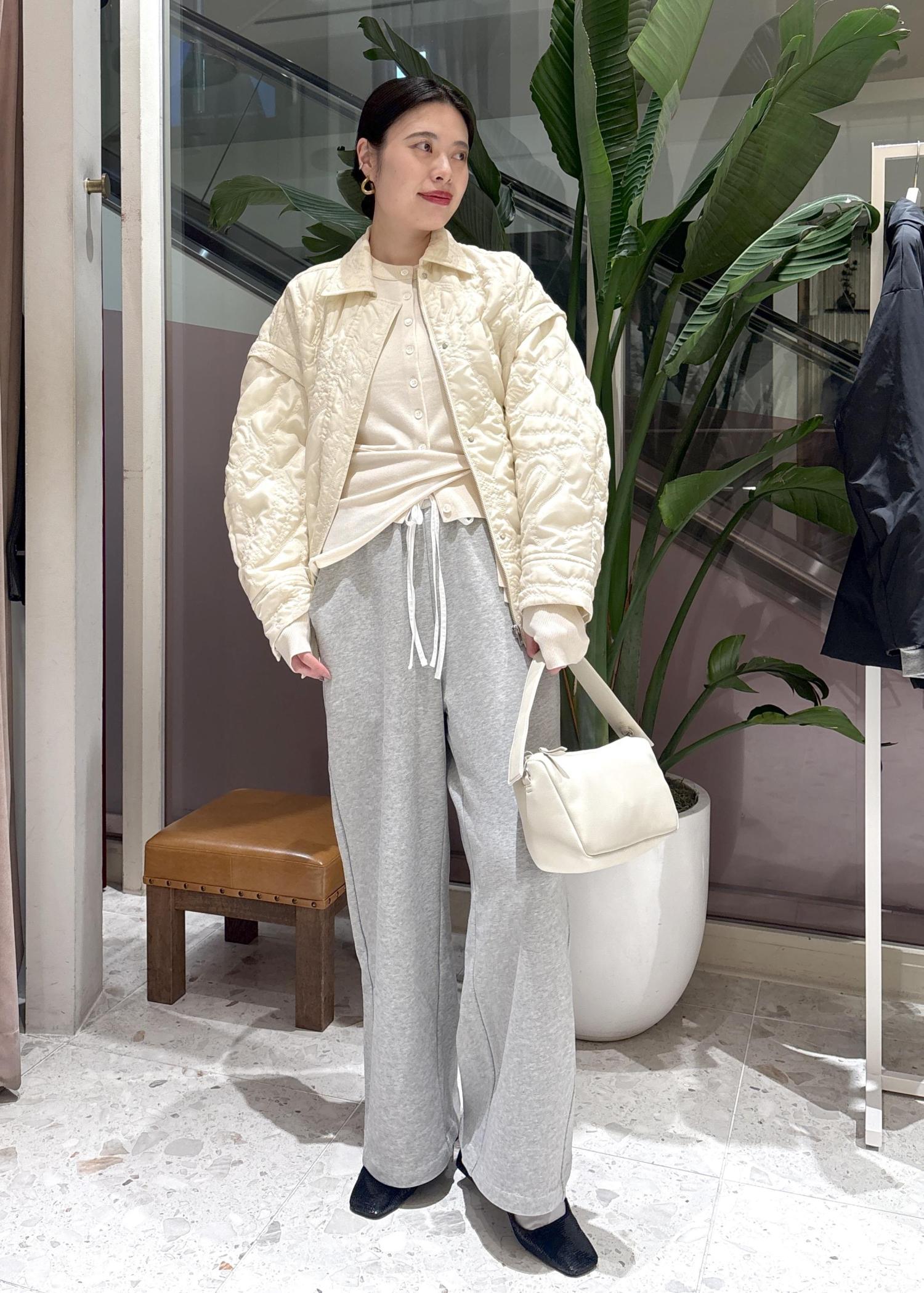上に羽織ったキルティングベストは、袖をつけるとキルティングジャケットとして使えます◎