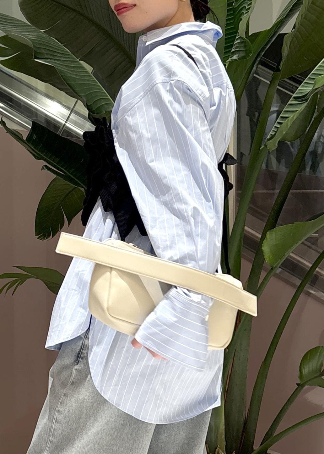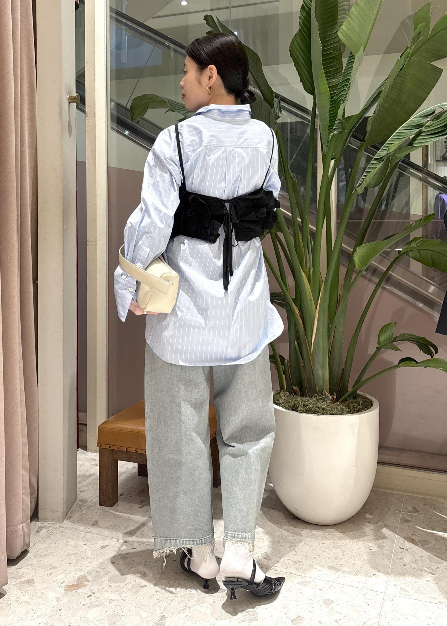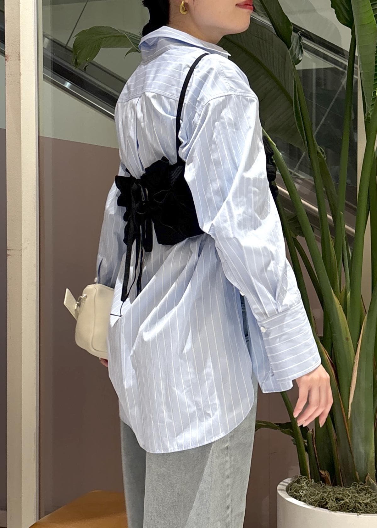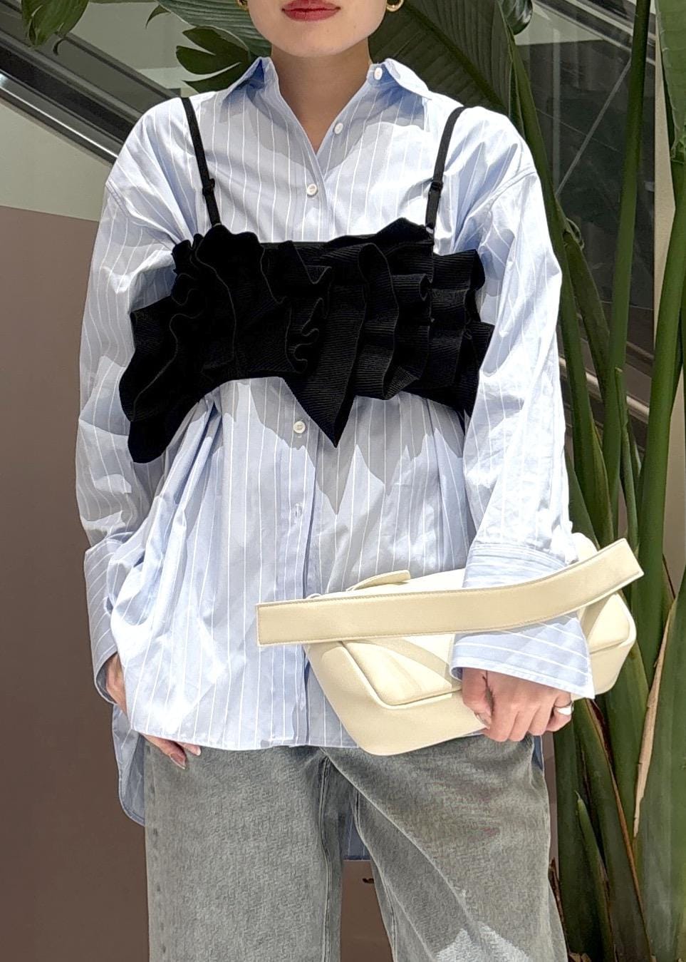 ラフなオーバーシャツの上にデザインビスチェを重ねるだけで可愛いですよね♡