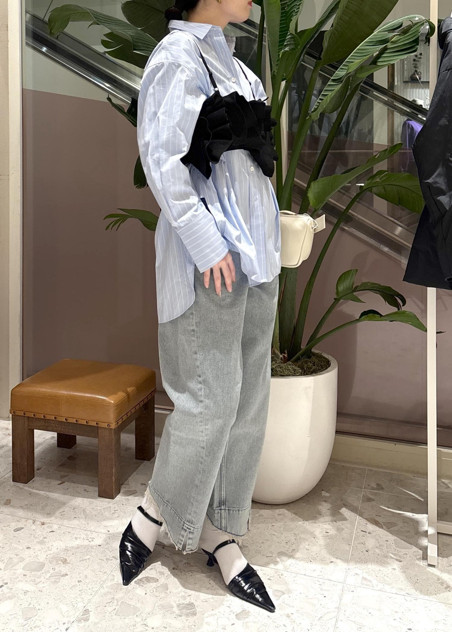 胸元のフリルで若干ボリュームが出るので、合わせるお洋服の生地感は厚手すぎないものをお勧めします! -