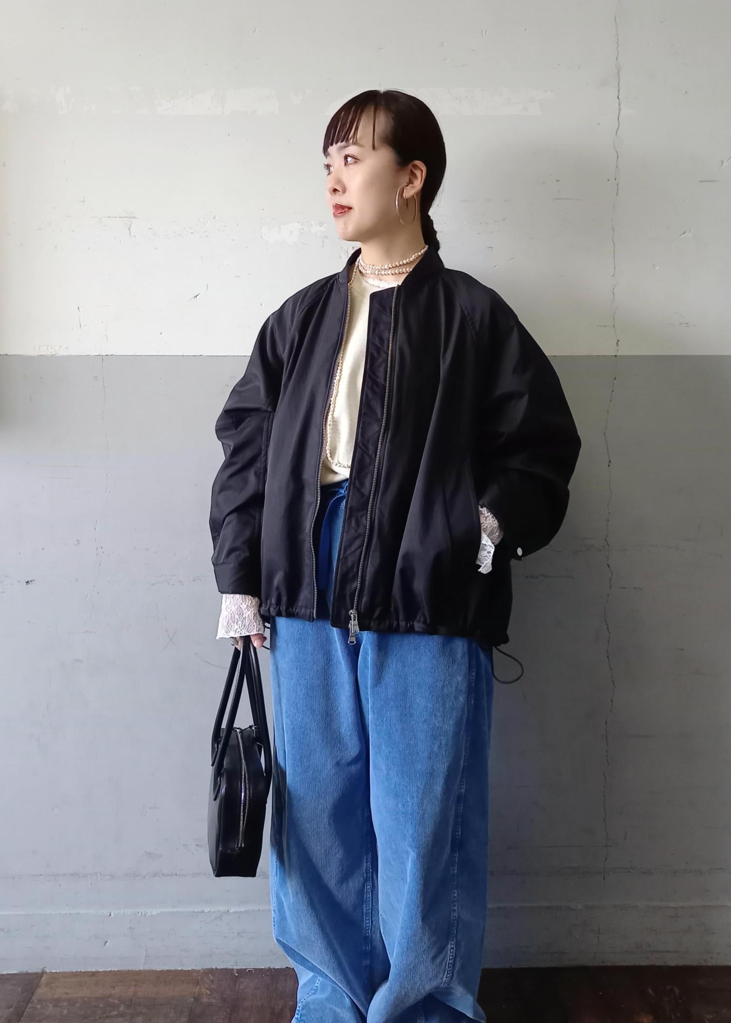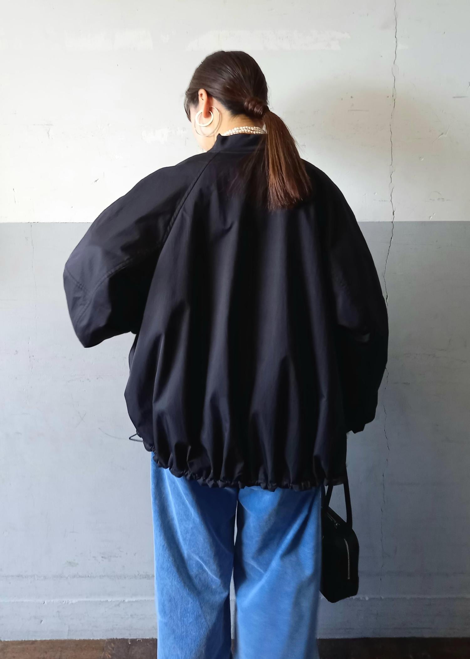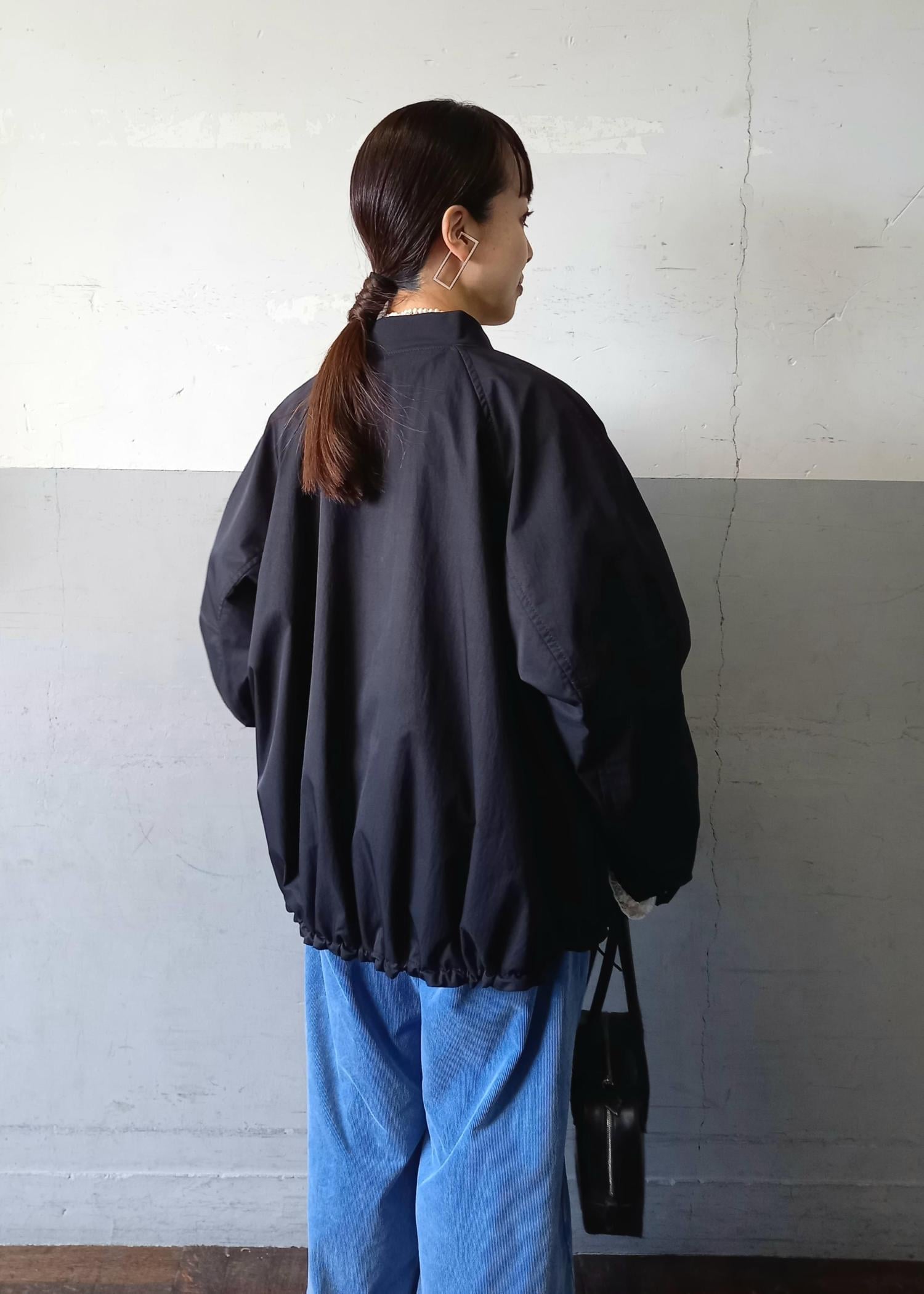 ブルゾンと言っても袖口や裾はリブ仕様ではないのでカジュアルすぎずきれい目にも合わせていただきやすいです☺️テントラインでも、裾のドローコードを絞って丸みのあるフォルムでも着れるのでシルエットの変化を楽しんでいただけますよ✨ -