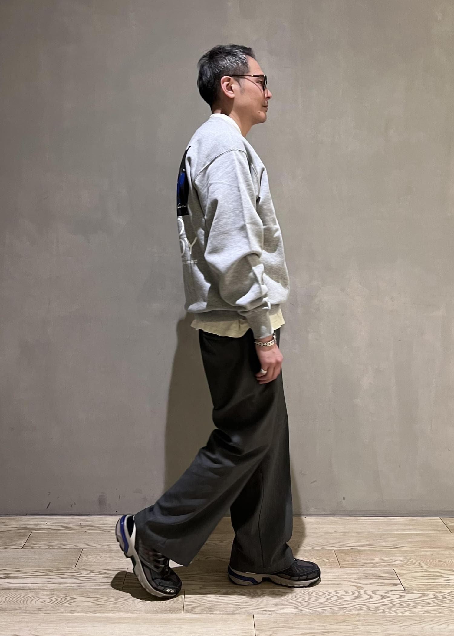グレーのスラックスの1トーン、大きめのサイズ感でスタイリングしました!