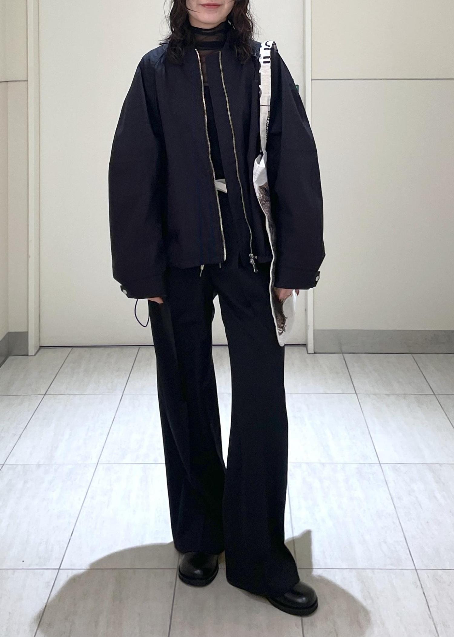 重たくなりすぎない様にインナーはシアーのトップス、ジャケットは程よく艶感があるアイテムにしてみました。
