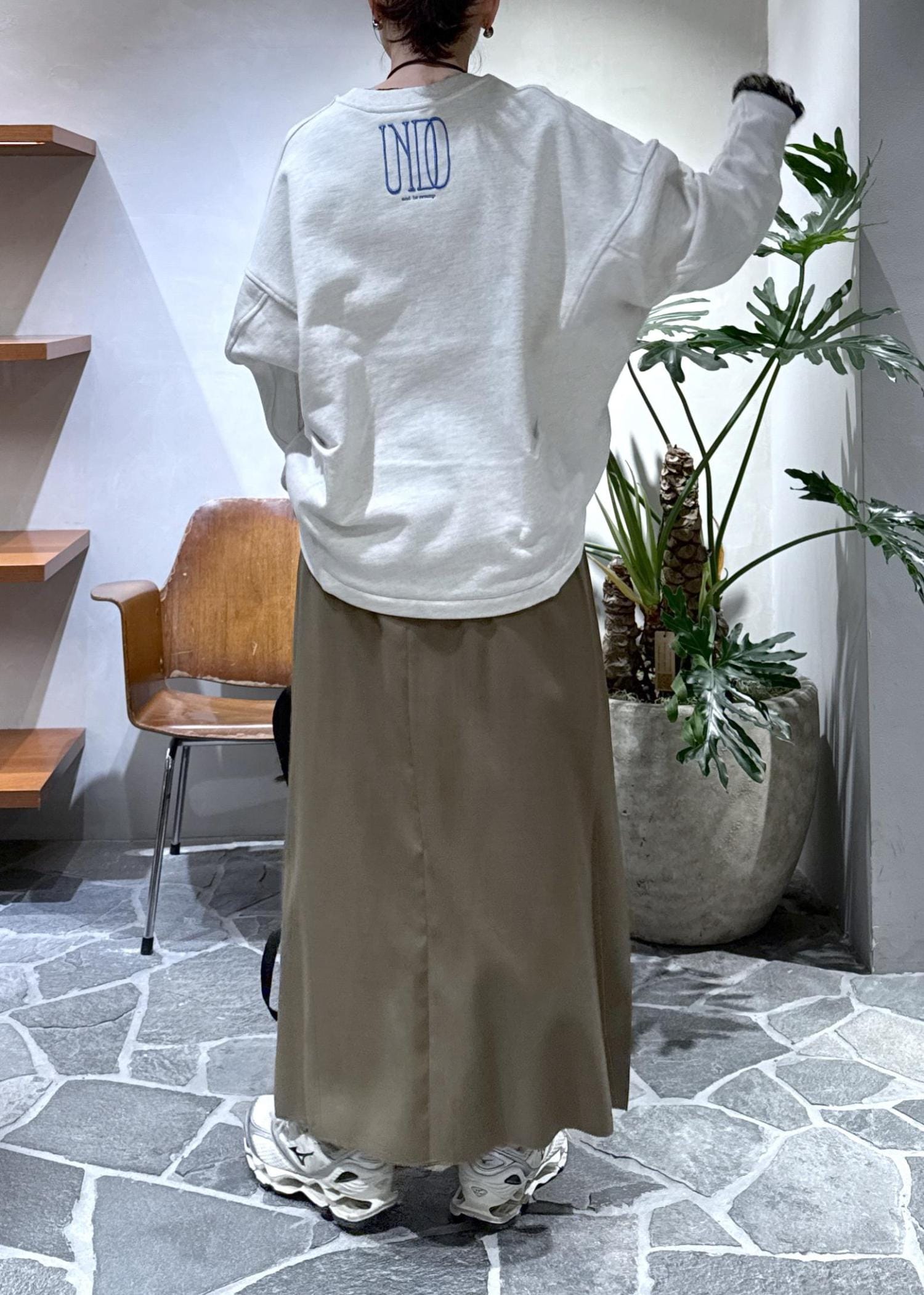 前後差のある着丈でスッキリ見えもするスウェットです。