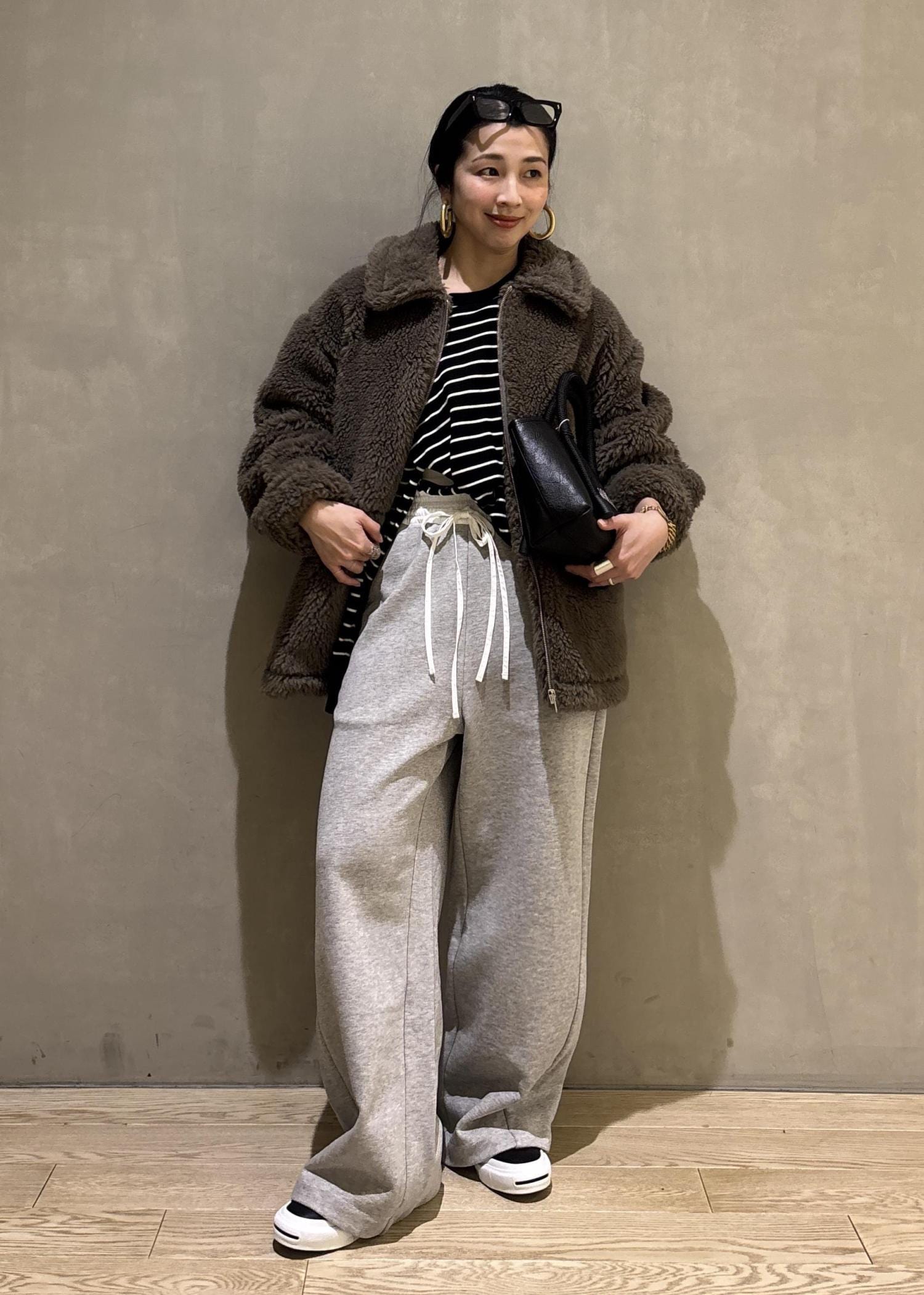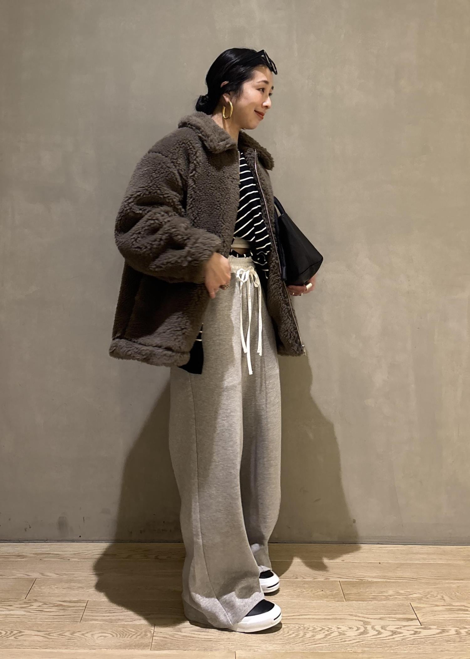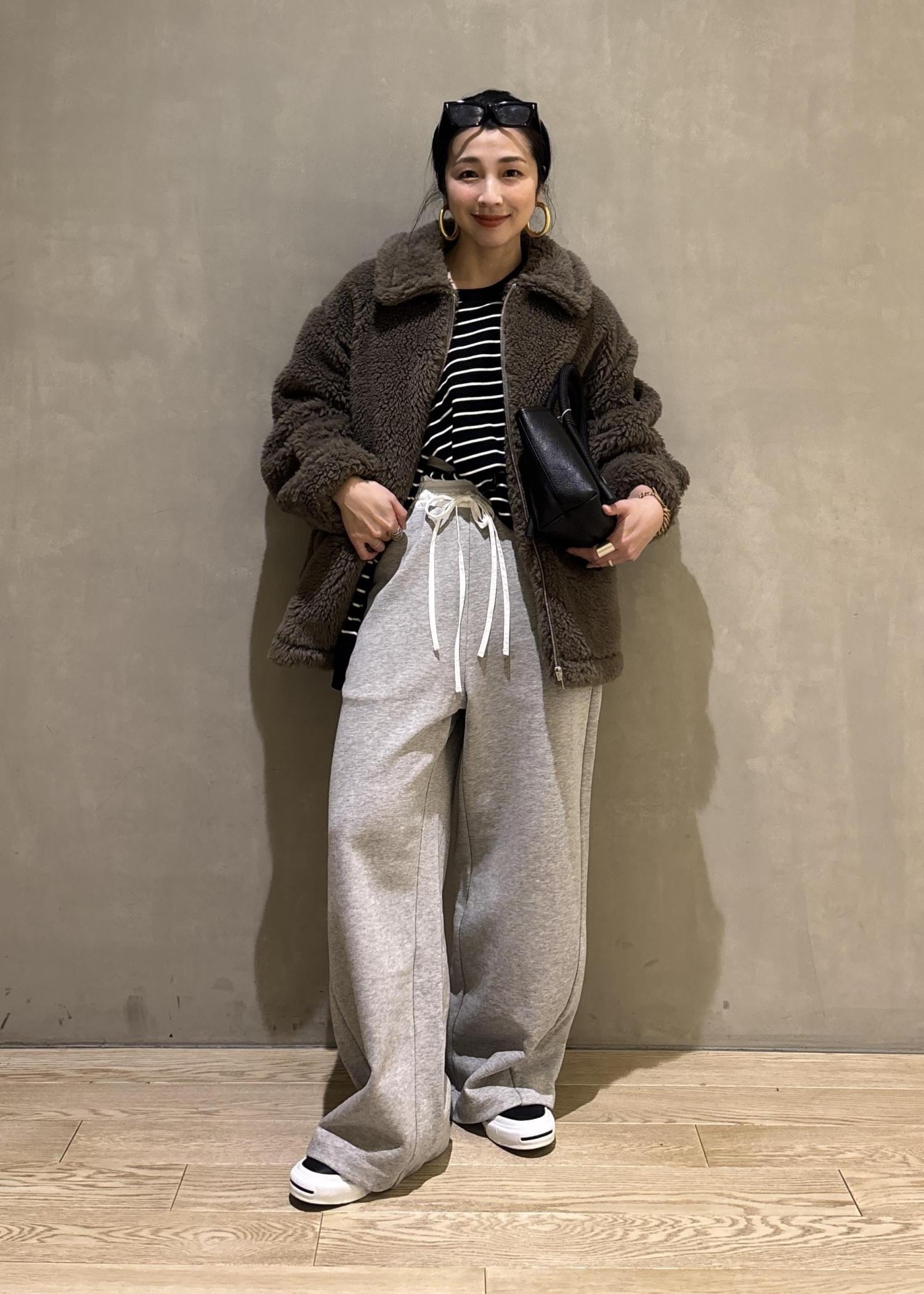 ボリューム感のあるボアブルゾンをスウェットでカジュアルダウンしたスタイリング。