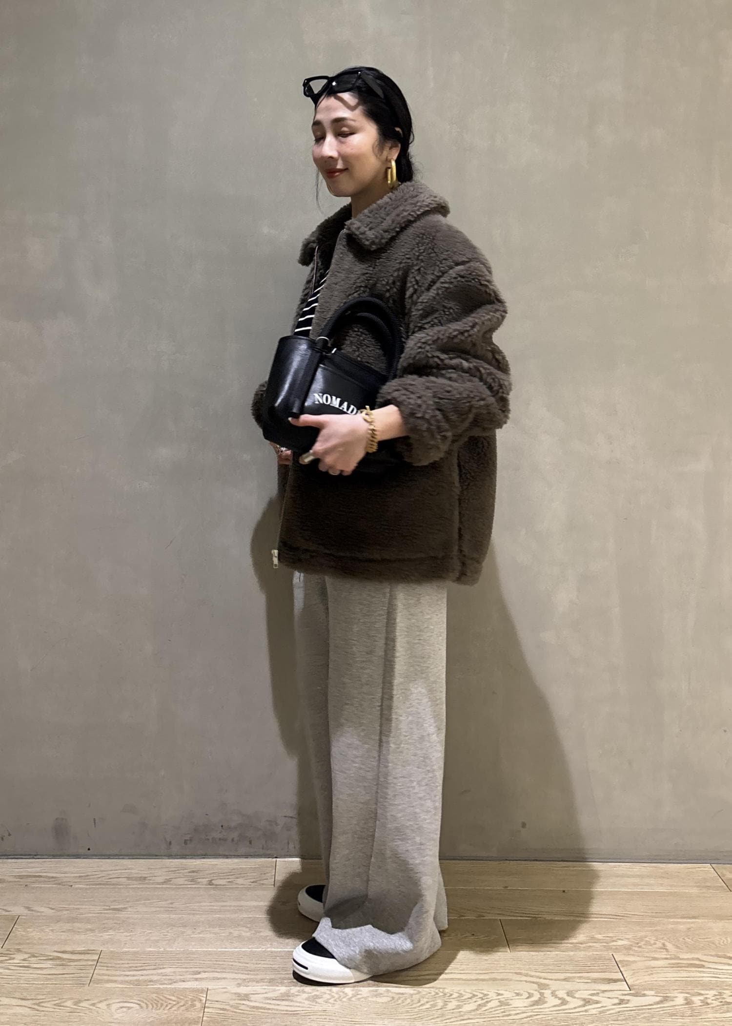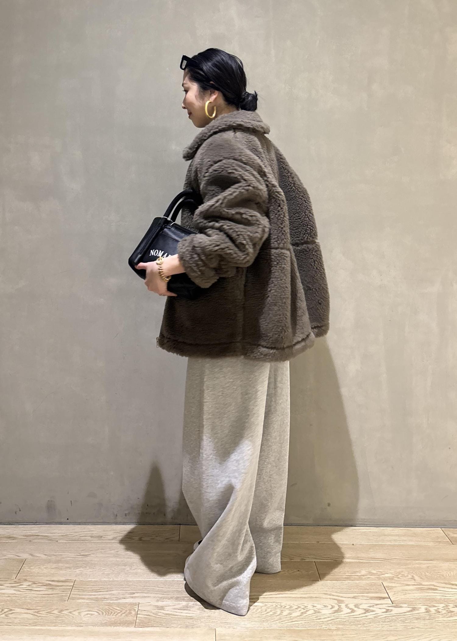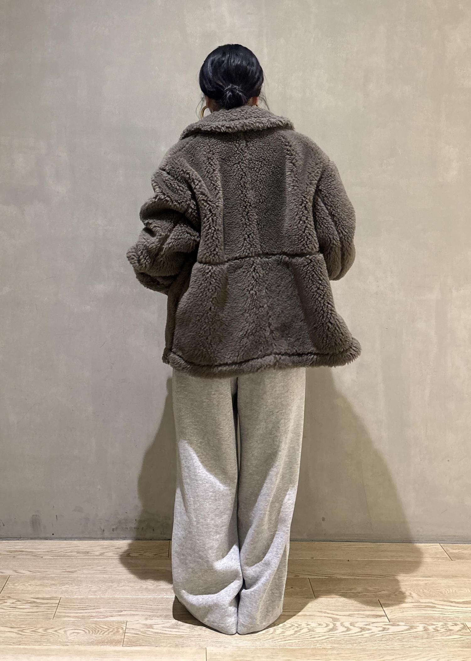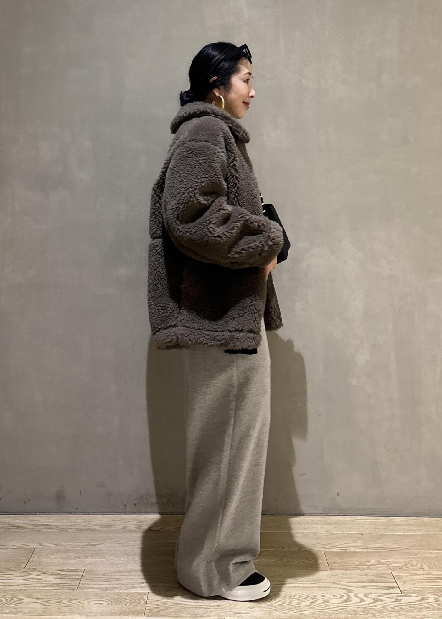 ボリューム感のあるボアブルゾンをスウェットでカジュアルダウンしたスタイリング。