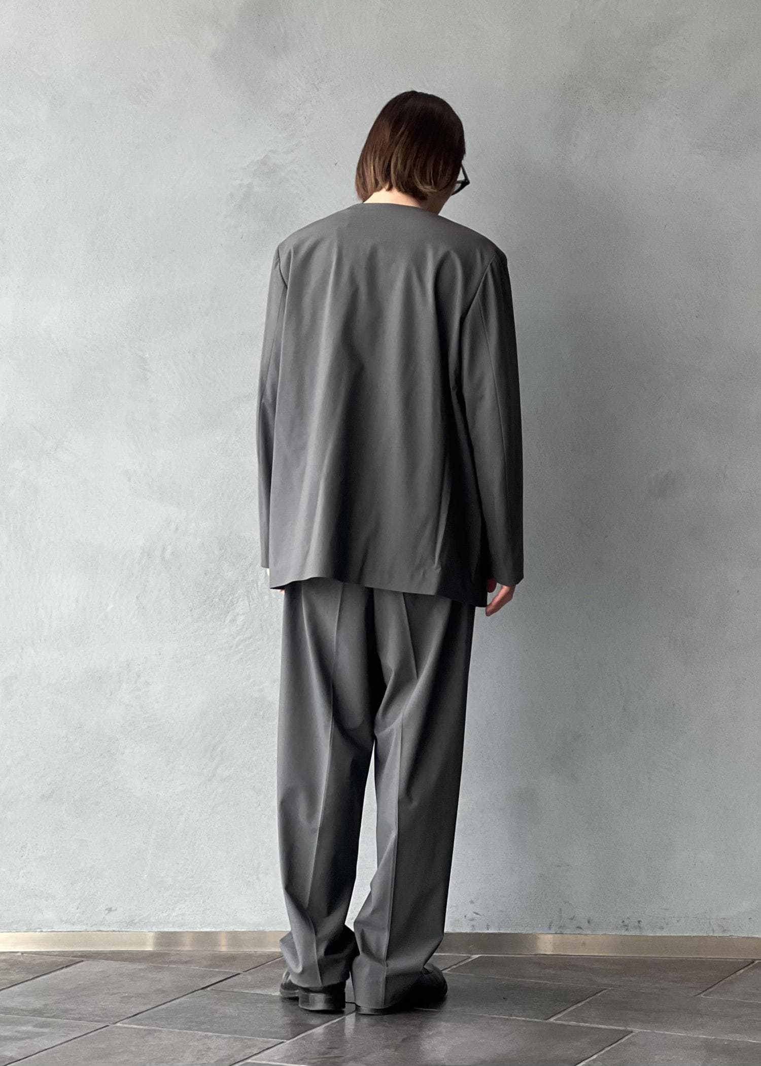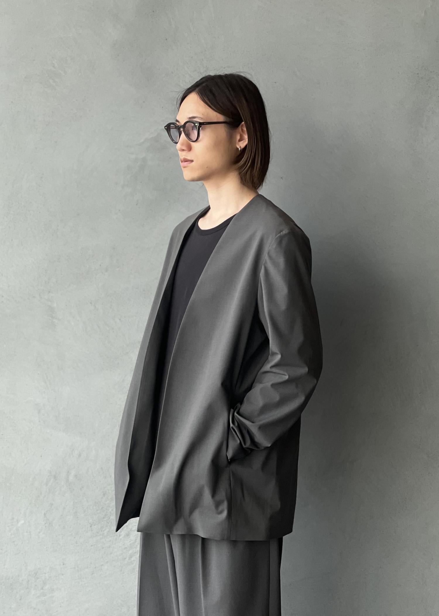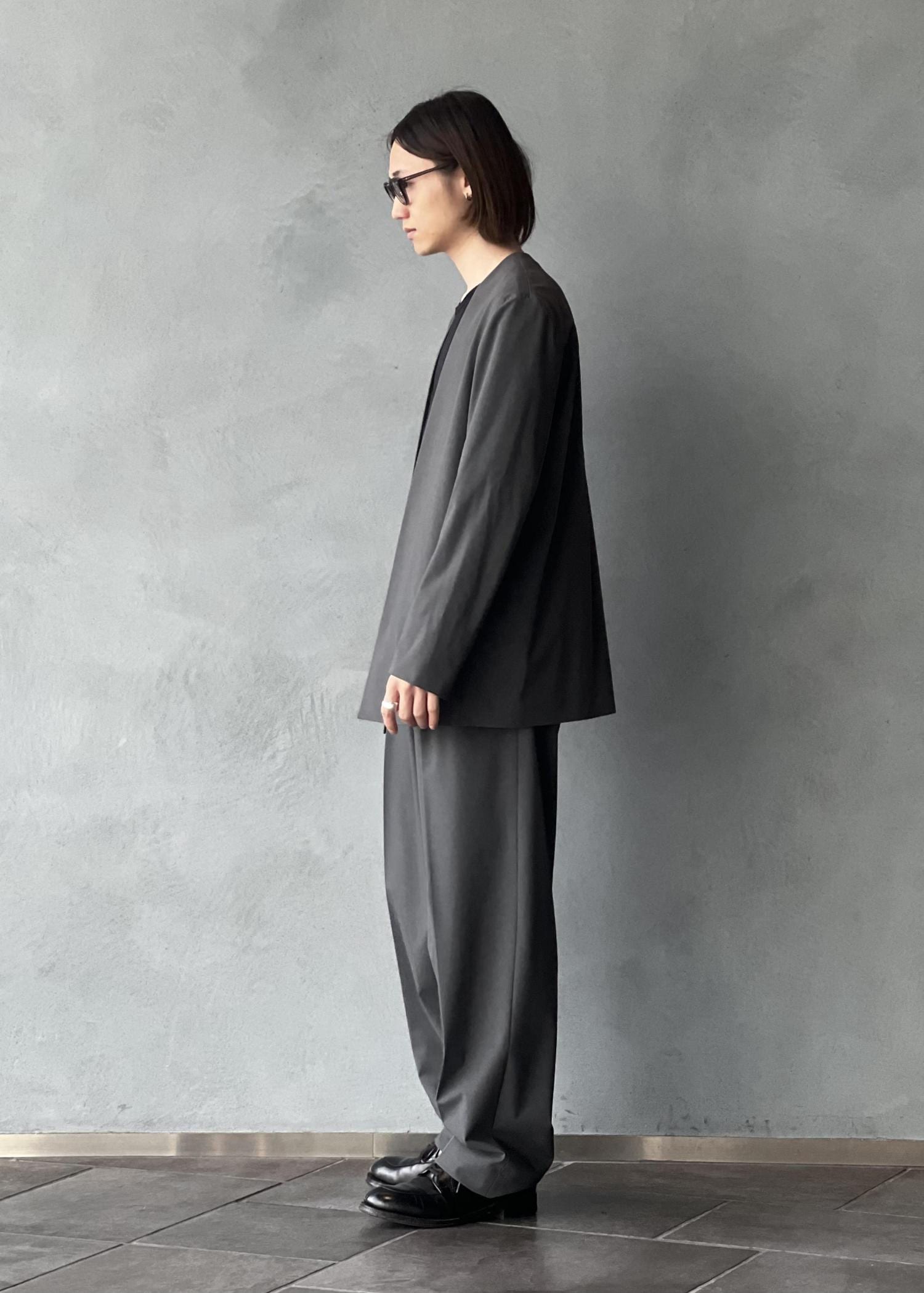 ノーカラージャケットとワイドスラックスのセットアップ。