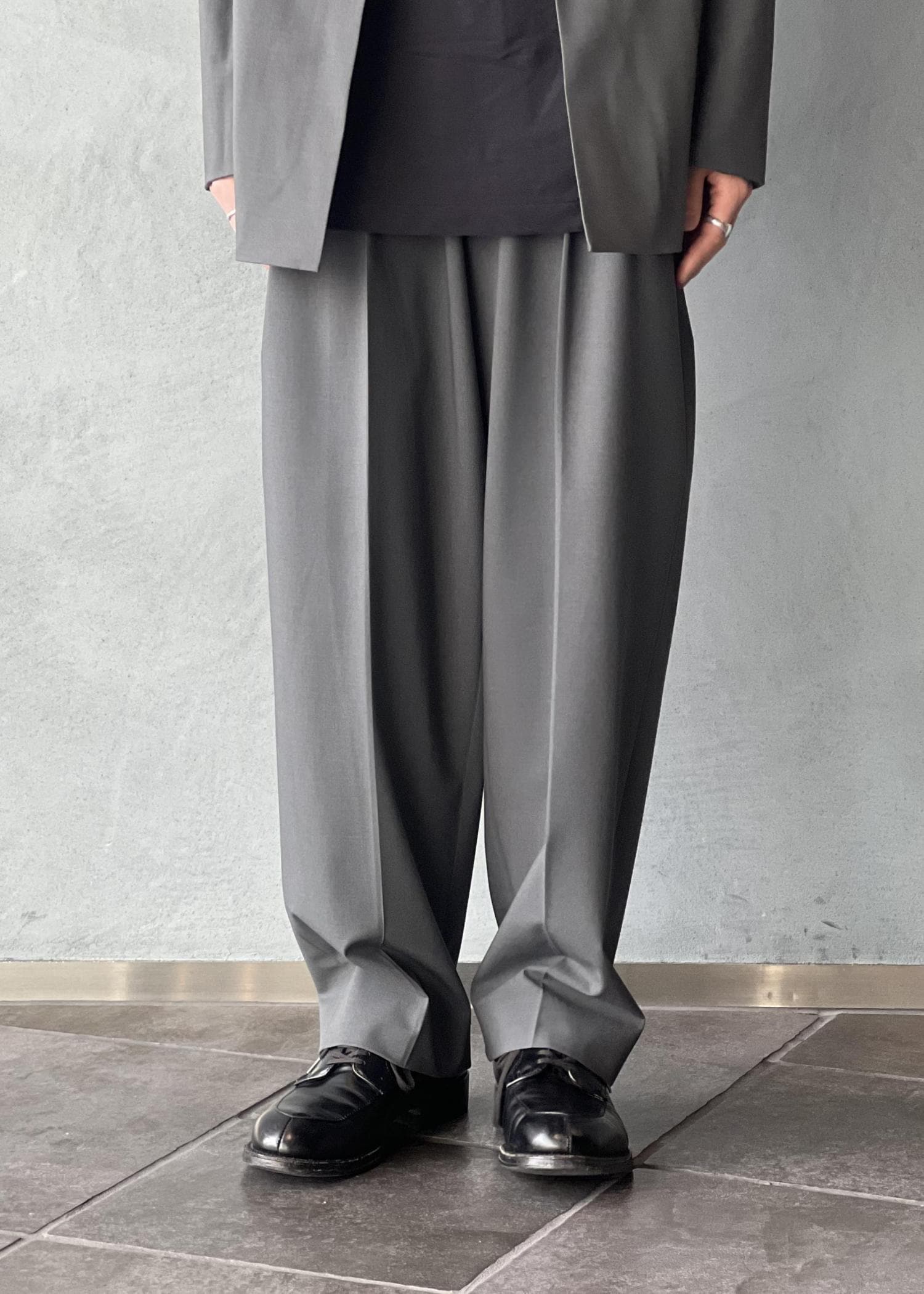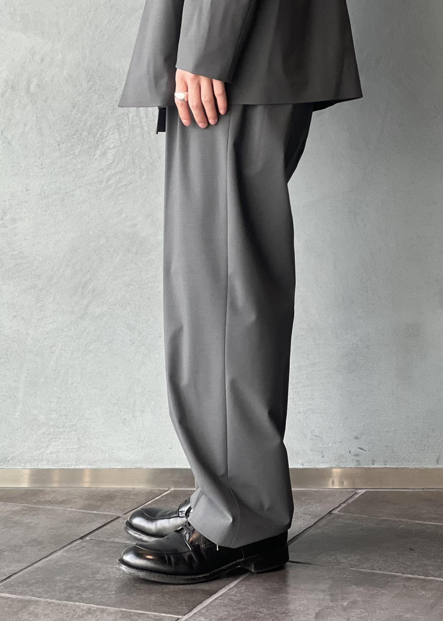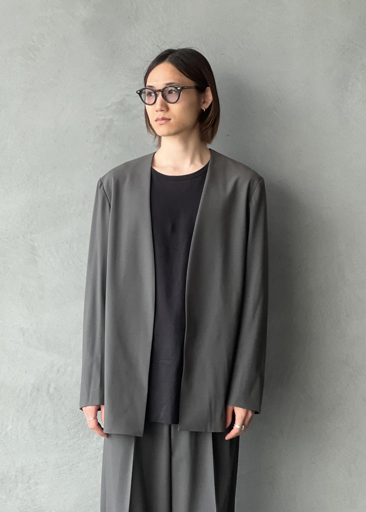 ノーカラージャケットとワイドスラックスのセットアップ。