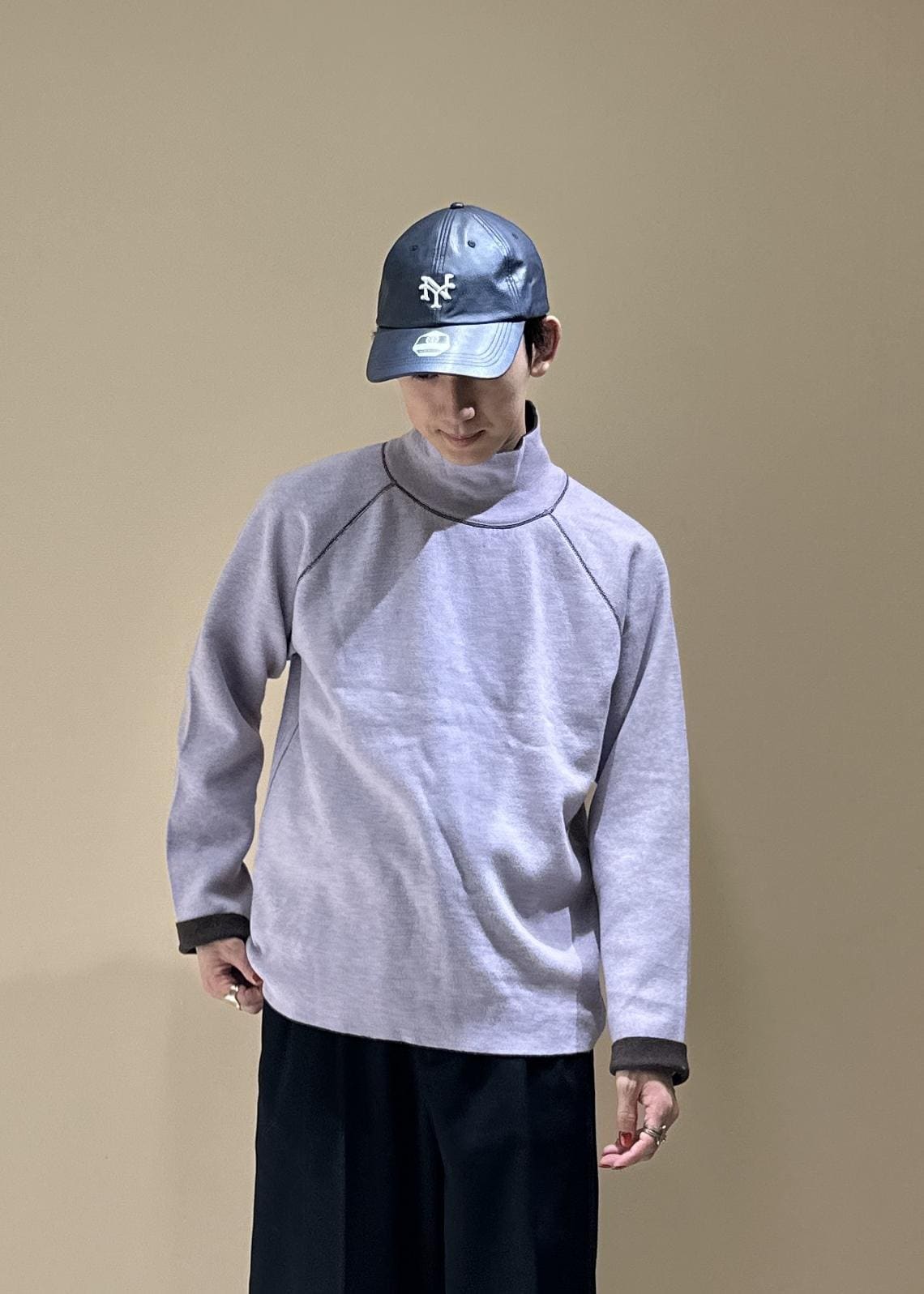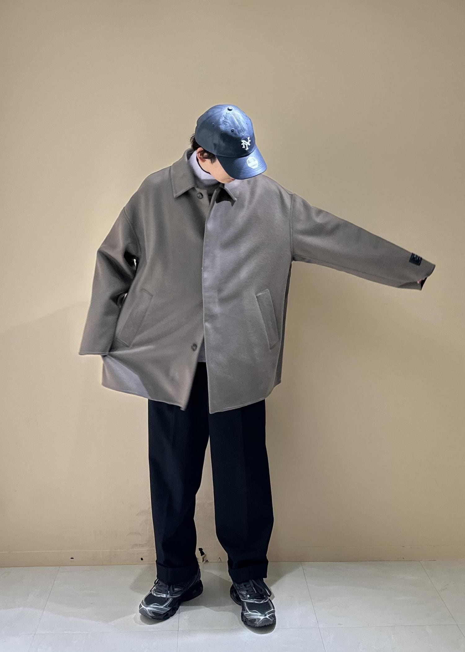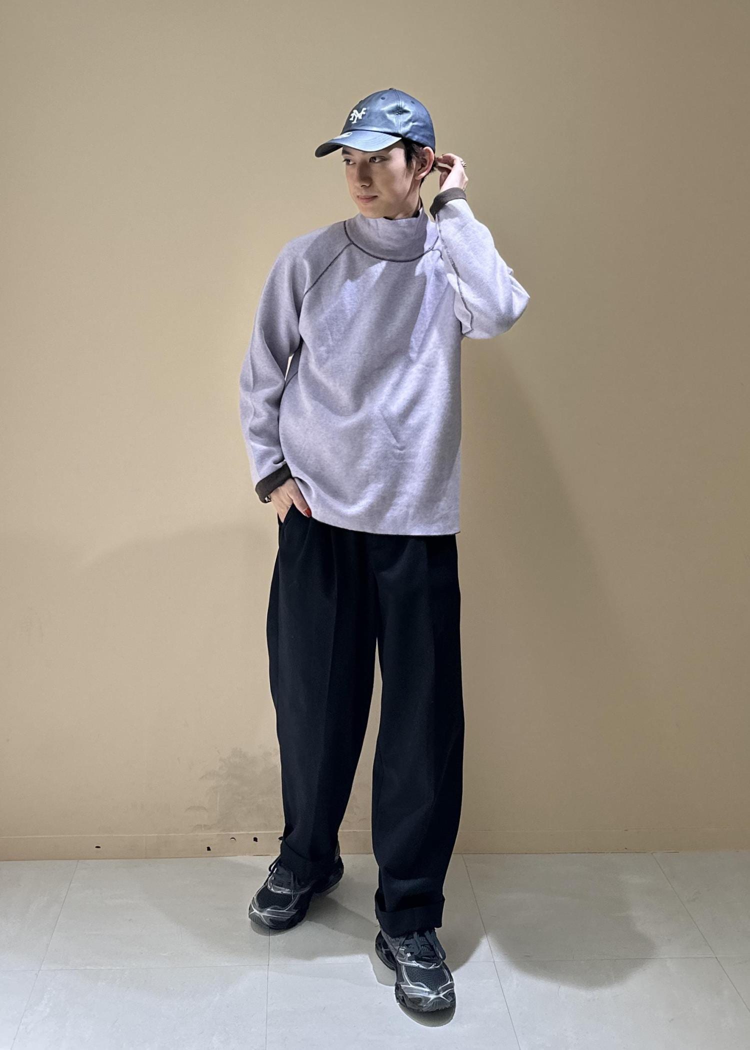 明るめのベージュのショートコートにラベンダー色のタートルネックを合わせた春カラーコーデです。パンツはシンプルに黒スラックス。スニーカーとキャップで少しカジュアルに、ラフに。細かい配色で遊び心を出してみました。