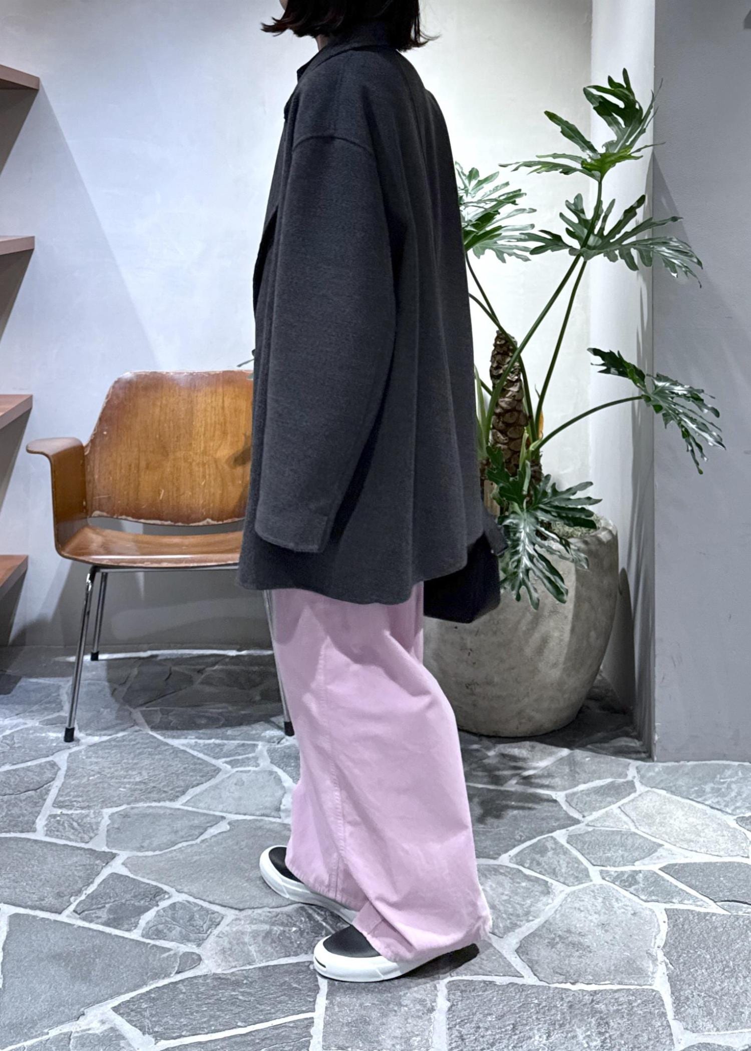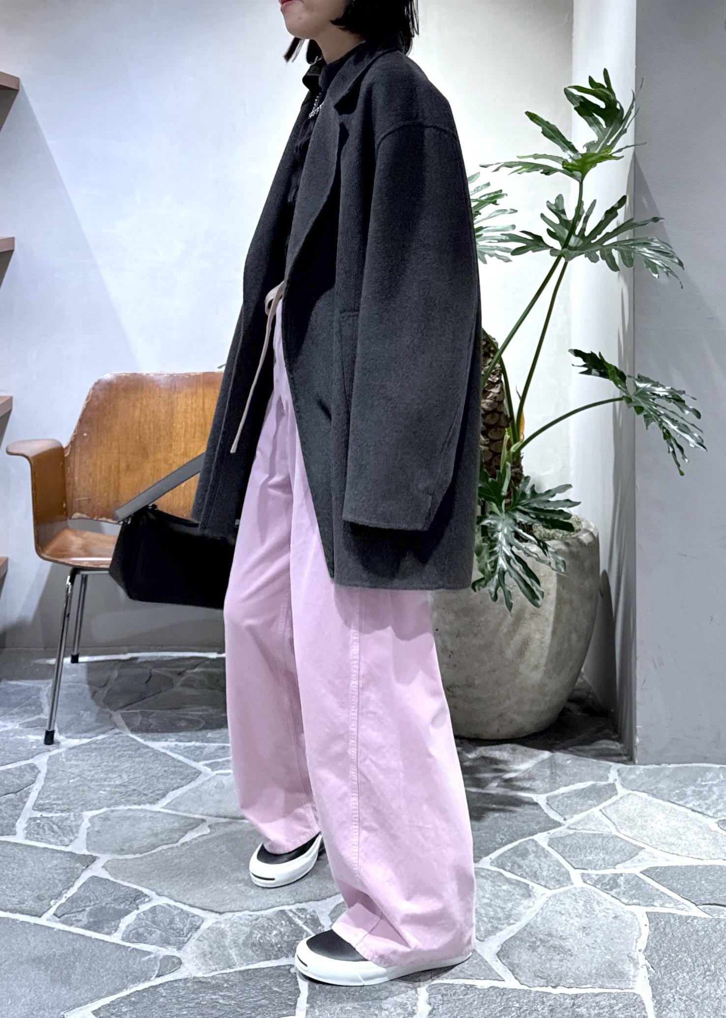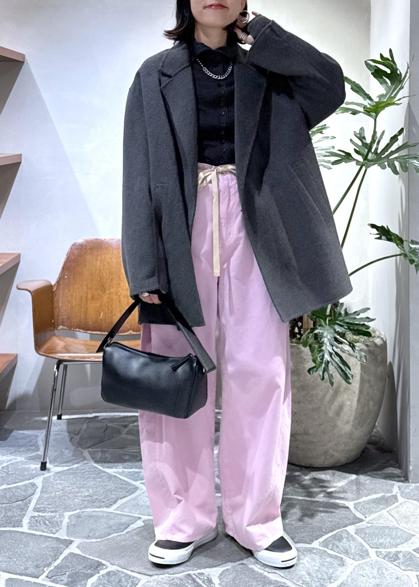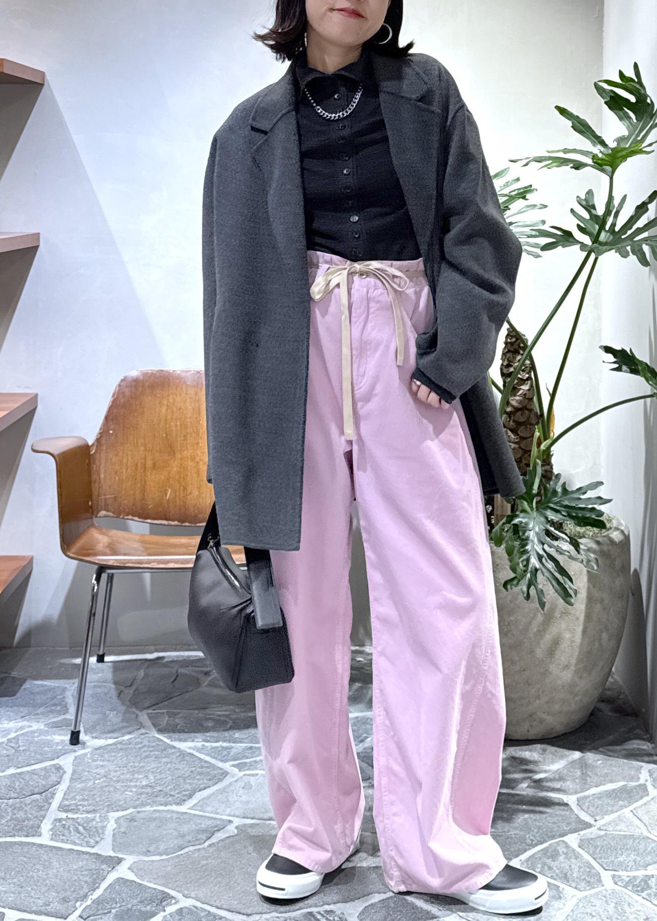 ウールコートに鮮やかなピンクのコーデュロイパンツをプラスしてスタイリングしました!