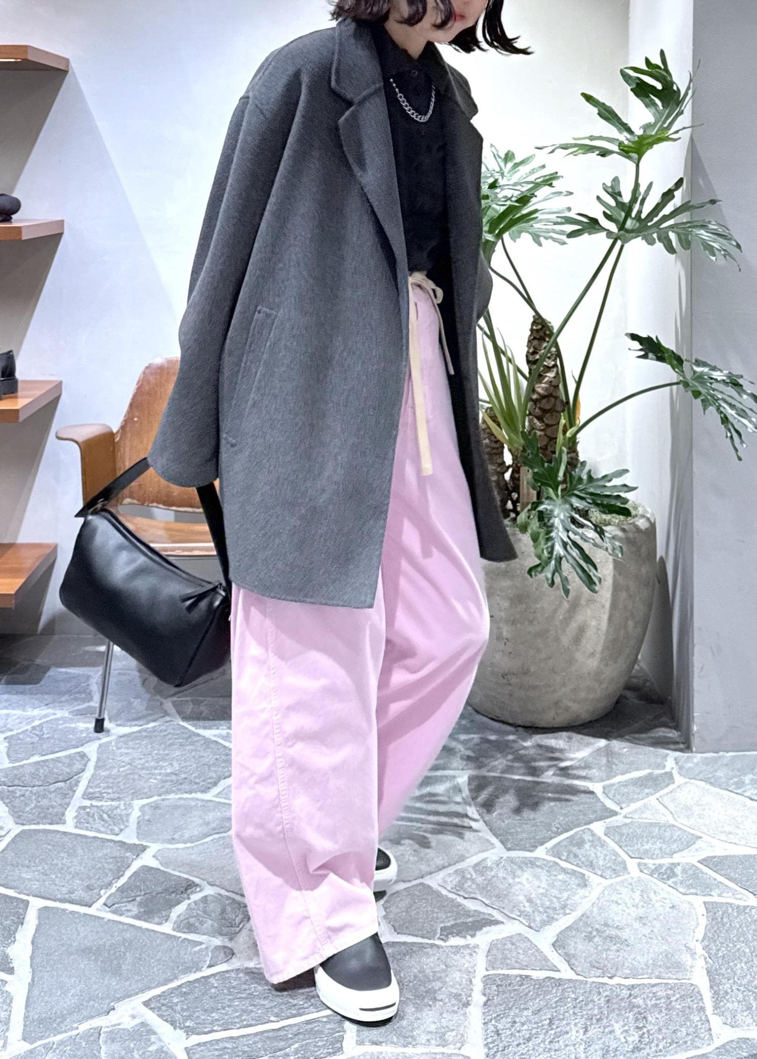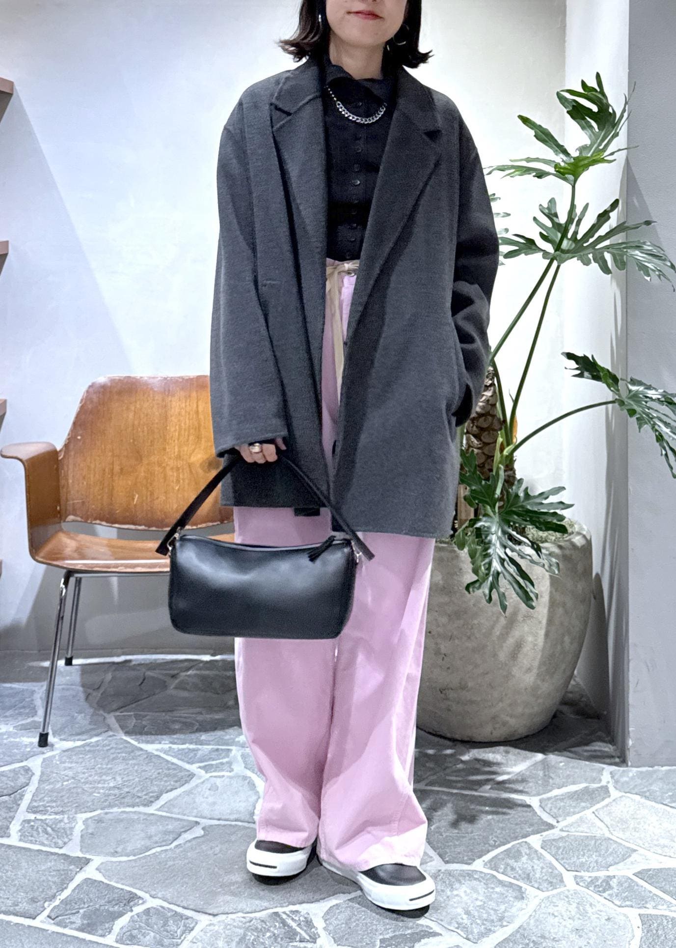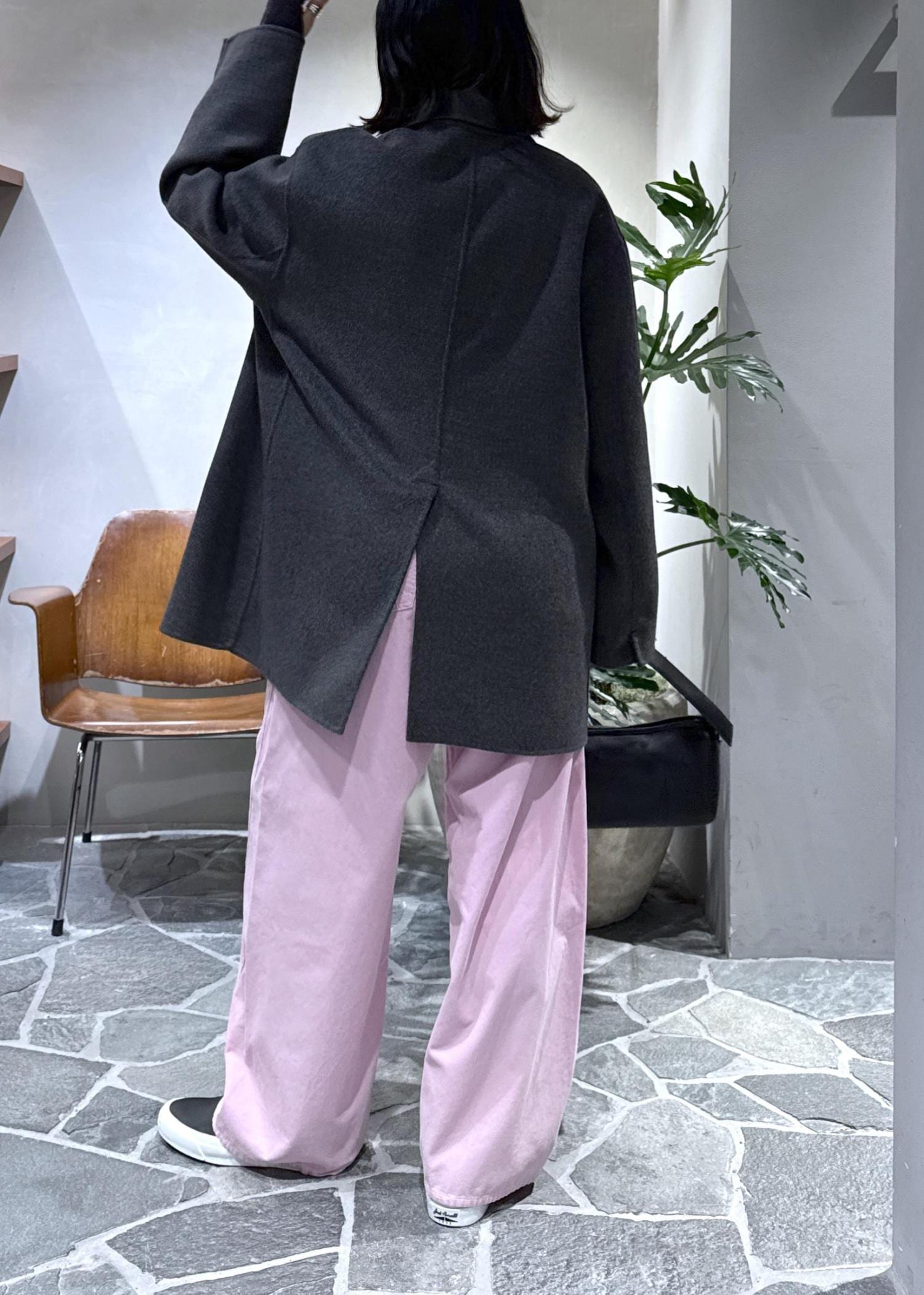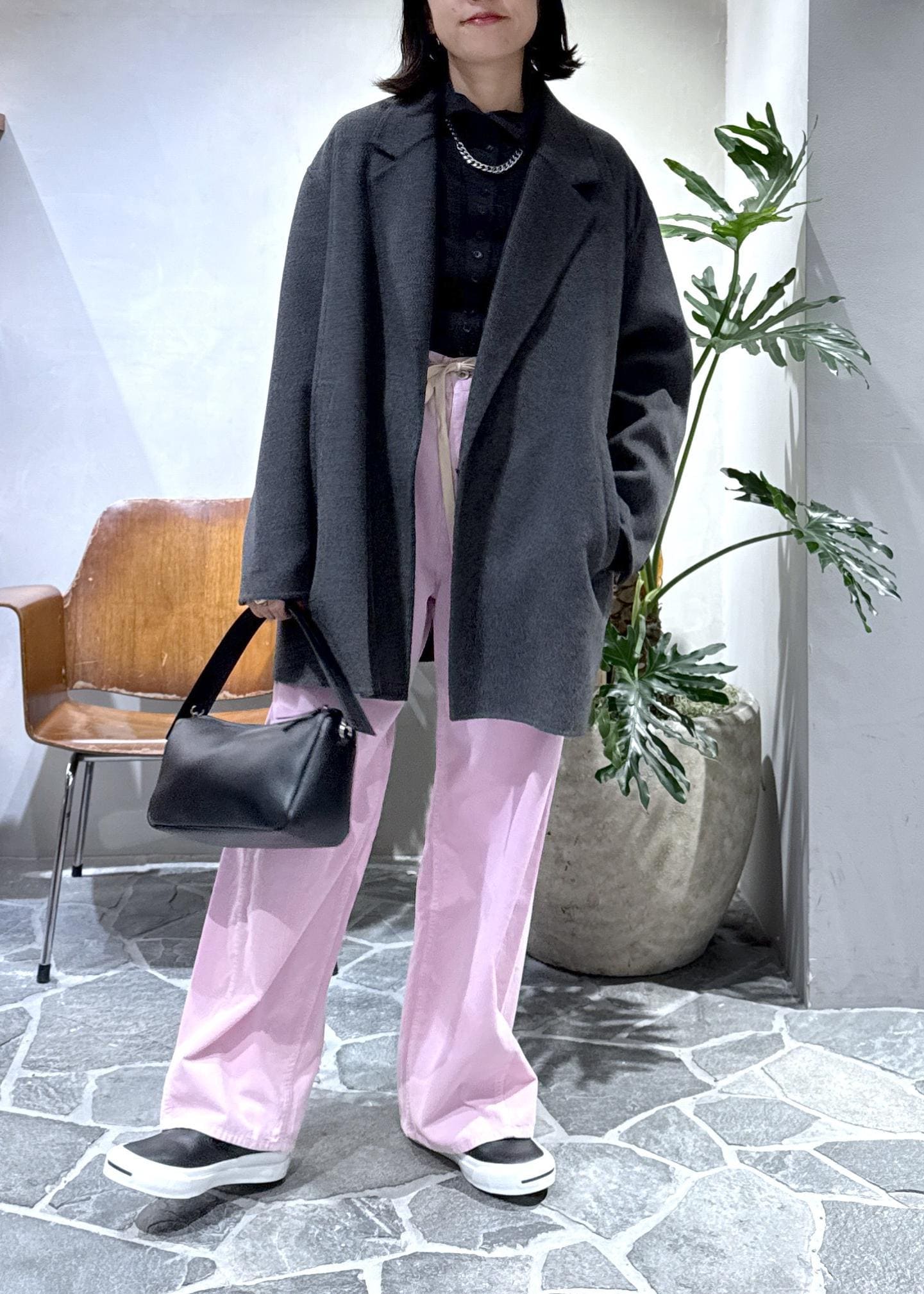 ウールコートに鮮やかなピンクのコーデュロイパンツをプラスしてスタイリングしました!