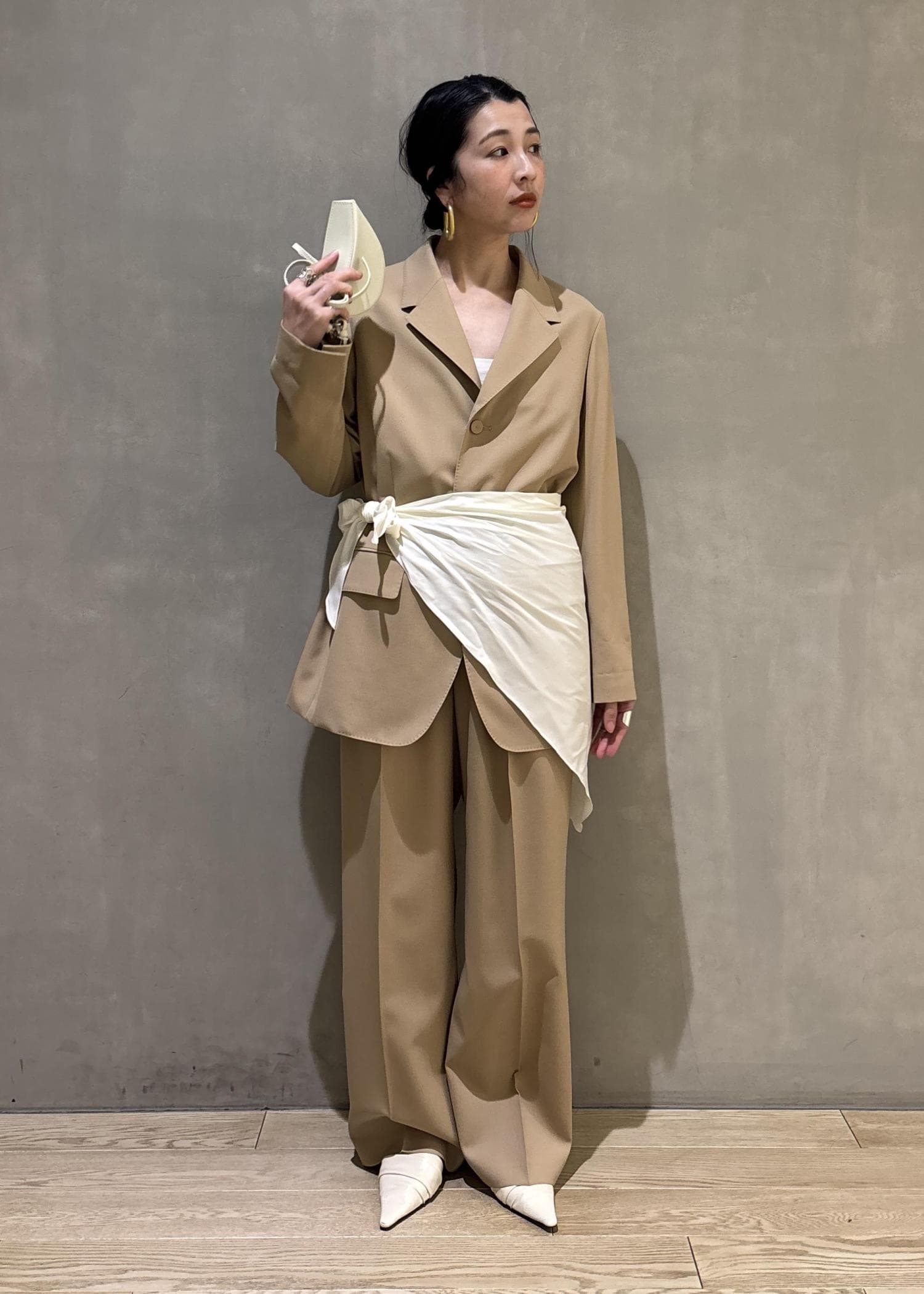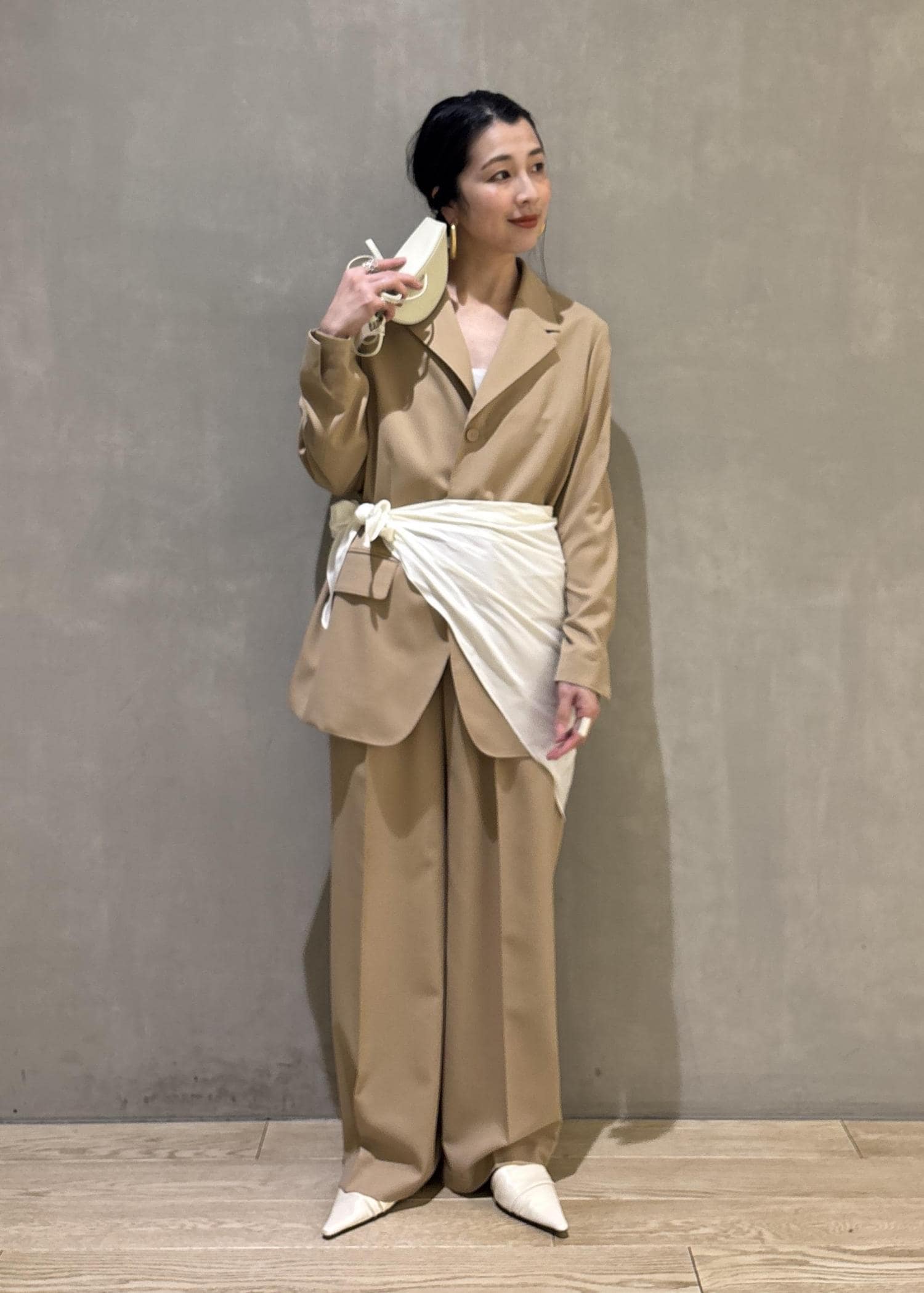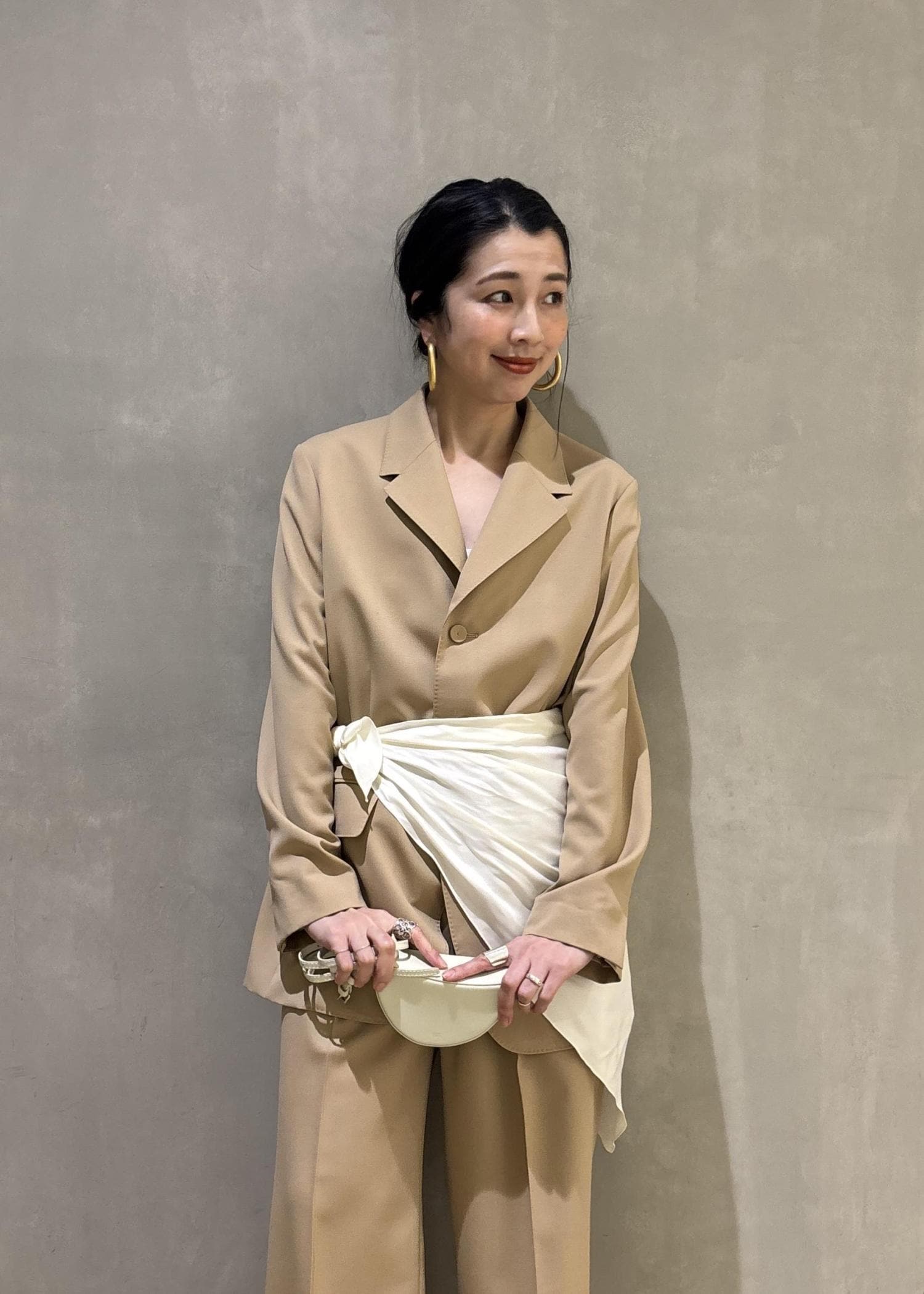 そしてあえてセットアップにスカーフでアレンジしたセレモニースタイリングもおすすめです!(こちらのスカーフ、実はブラウスに付属でついているスカーフで、色々アレンジできますよ!)