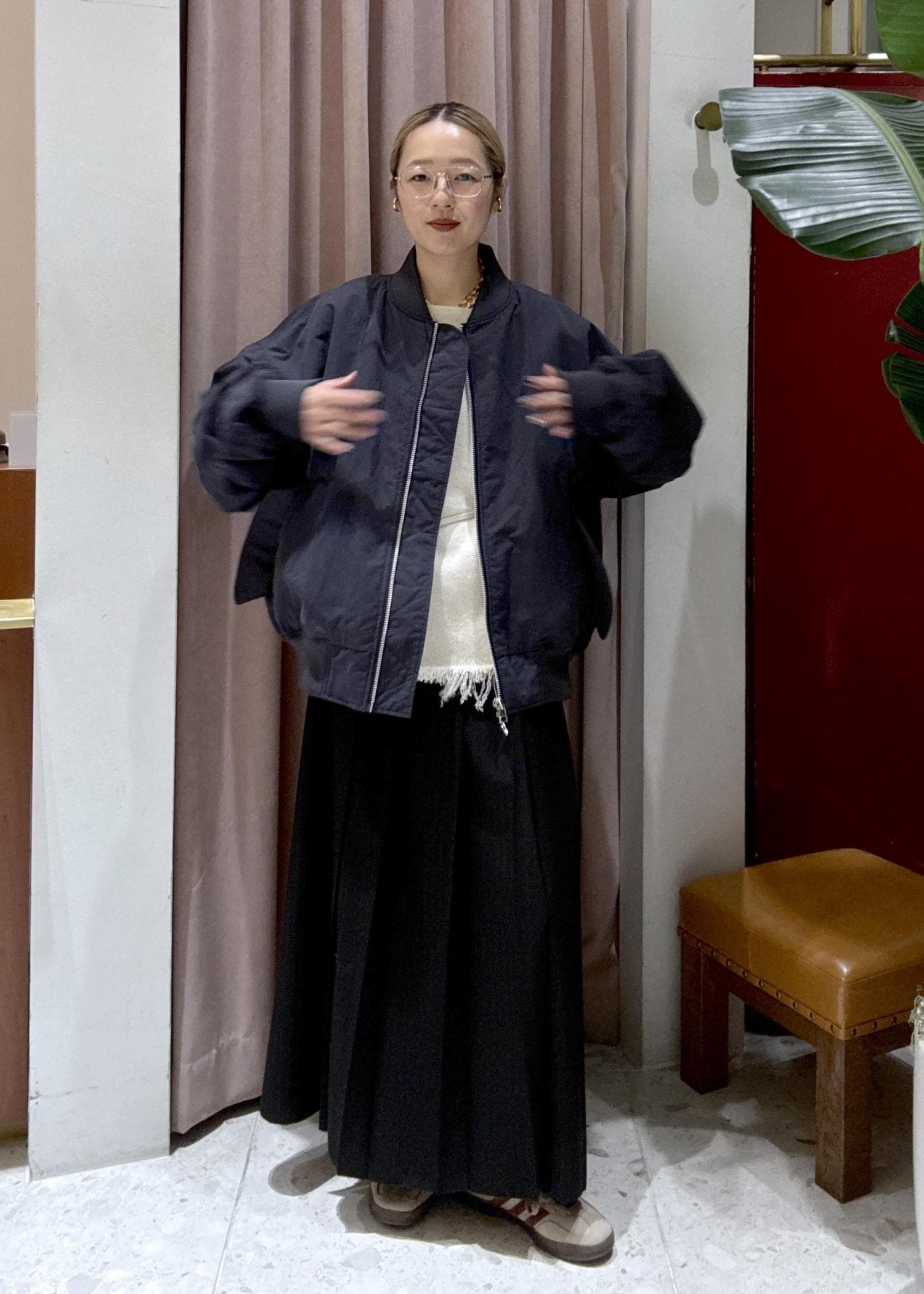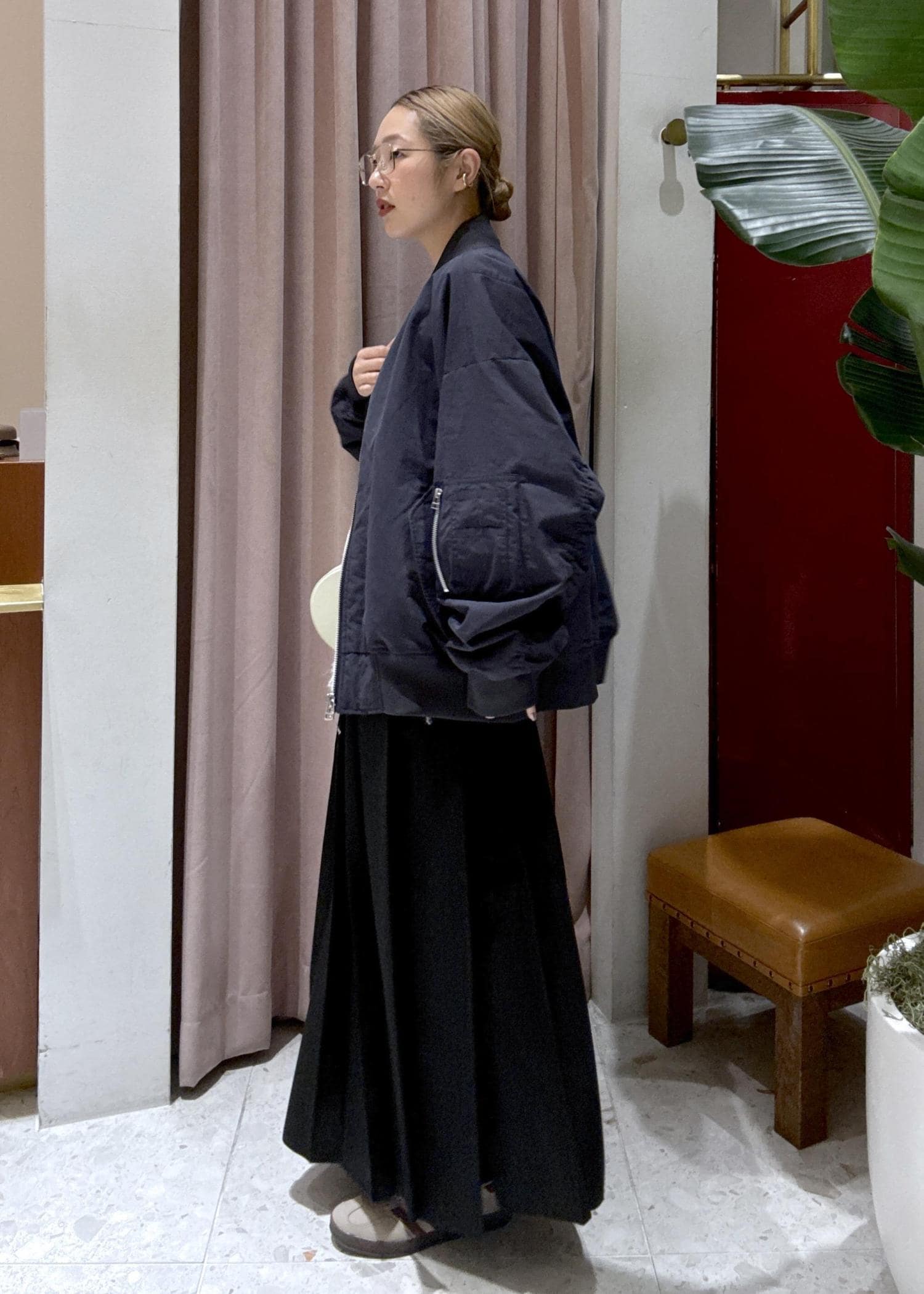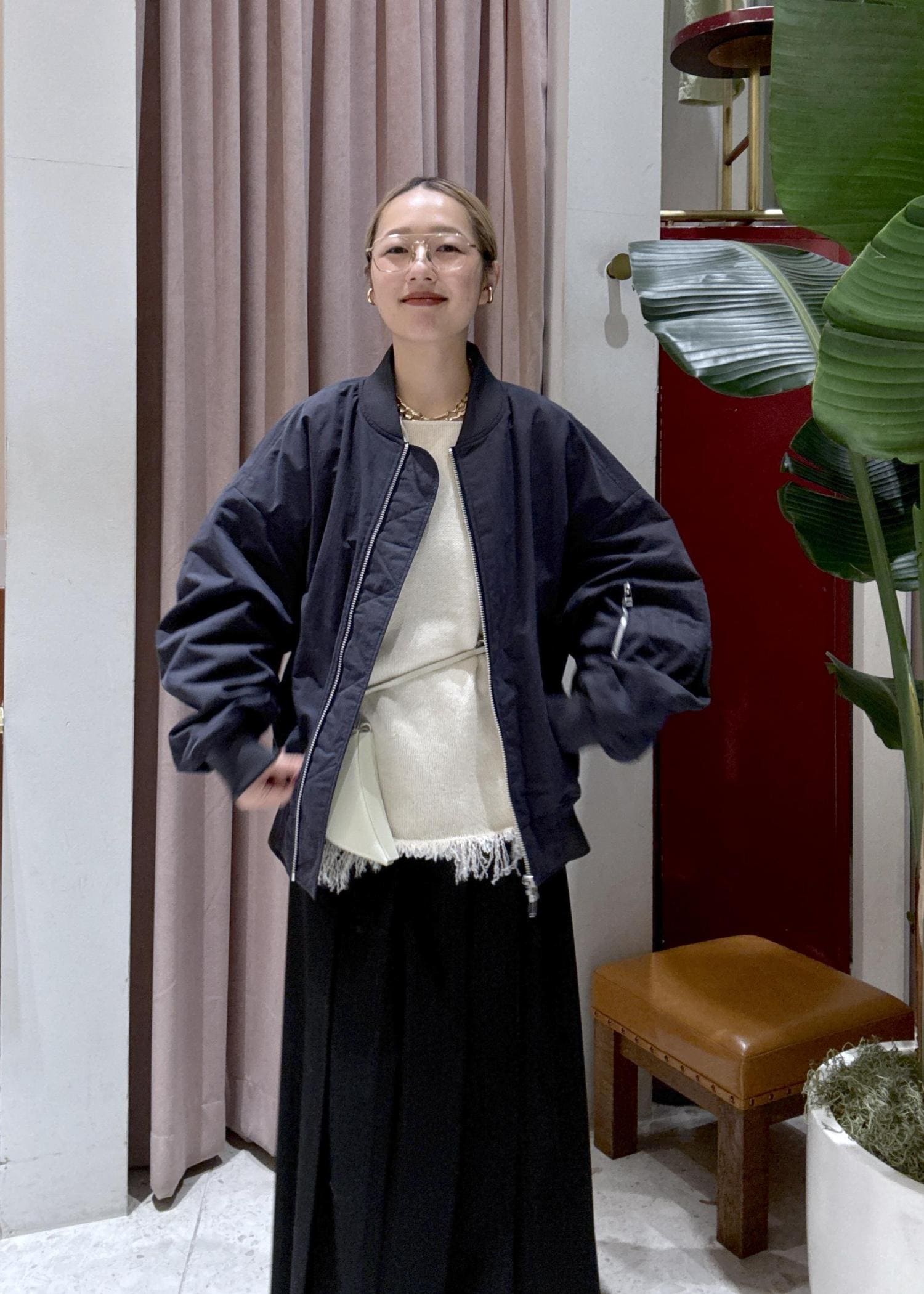 落ち感のあるロングスカートを合わせて、バランスよくまとめました。