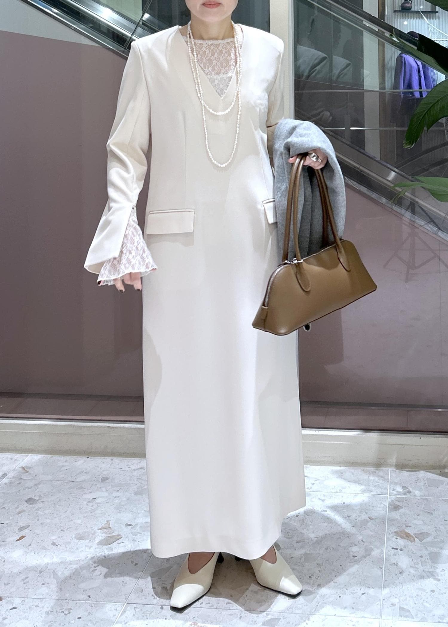 胸元のVネックは深めですが、インナーにレース系を合わせると華やかさもプラスされて素敵でした。上からジャケットを羽織ってもよいと思います。 -