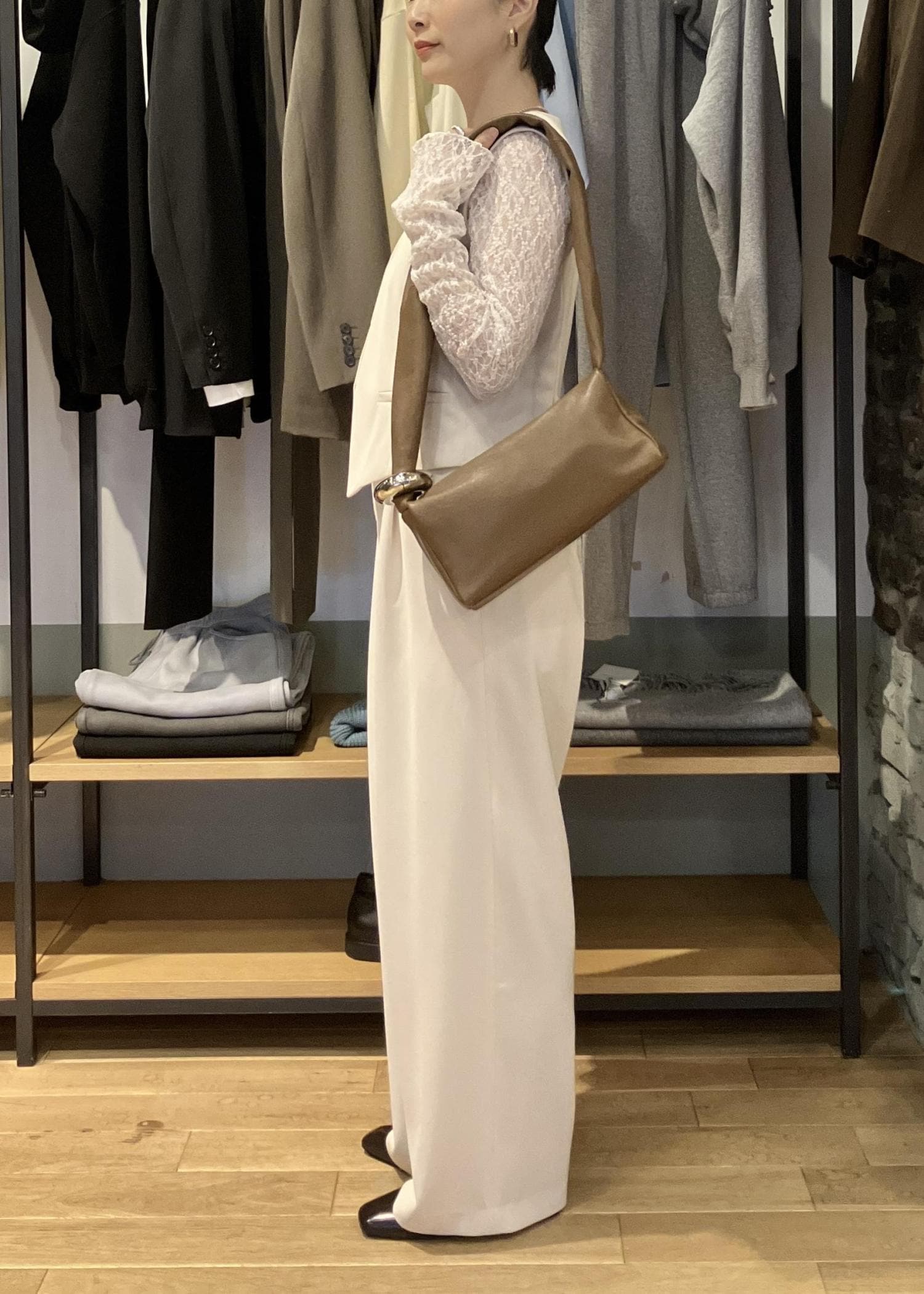 こういうかっこいいバッグがひとつあると、上下スウェットなどのリラックスコーデも華やかにまとまりますよ! -