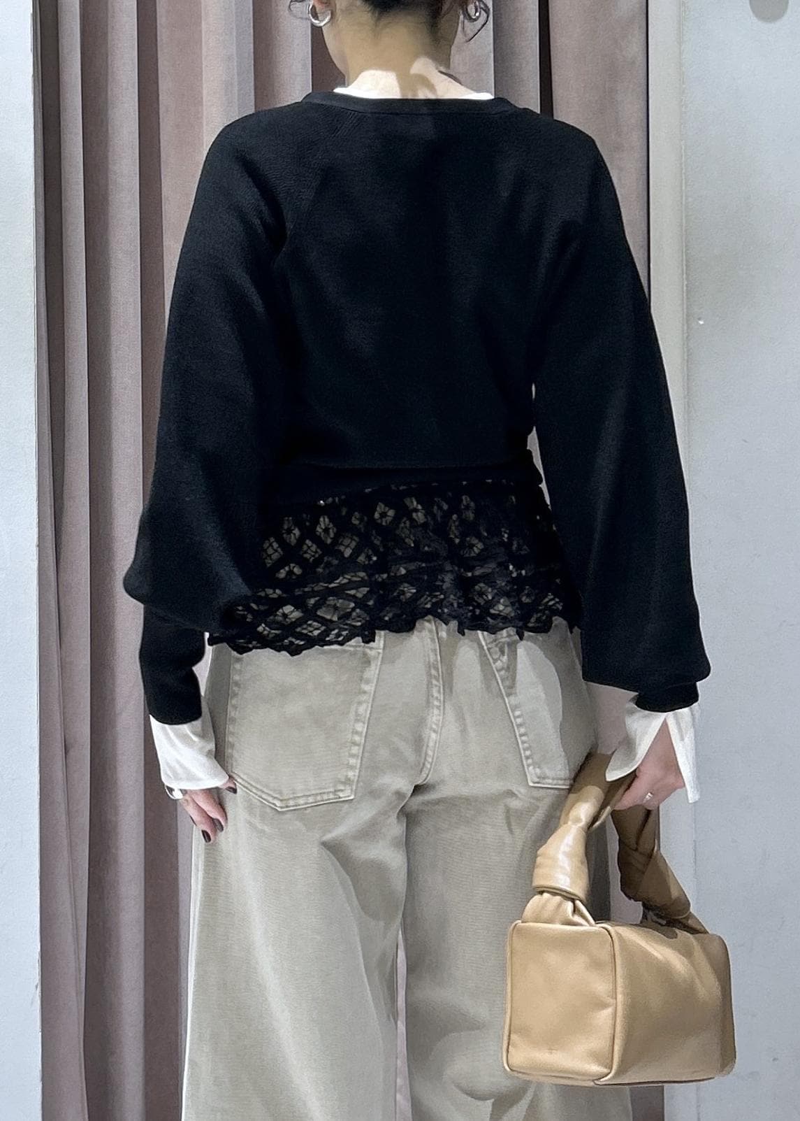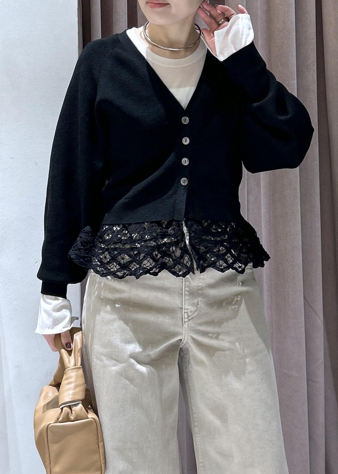 ADAM ET ROPÉ FEMMEバテンレースコンビニットカーディガンブラック / F¥12,705レビュー素材に落ち感があり、肩周りにボリュームが出ず、スッキリ見えます。裾のバテンレースの存在感が可愛く、ボトムの色によってはしっかり目立ちます!