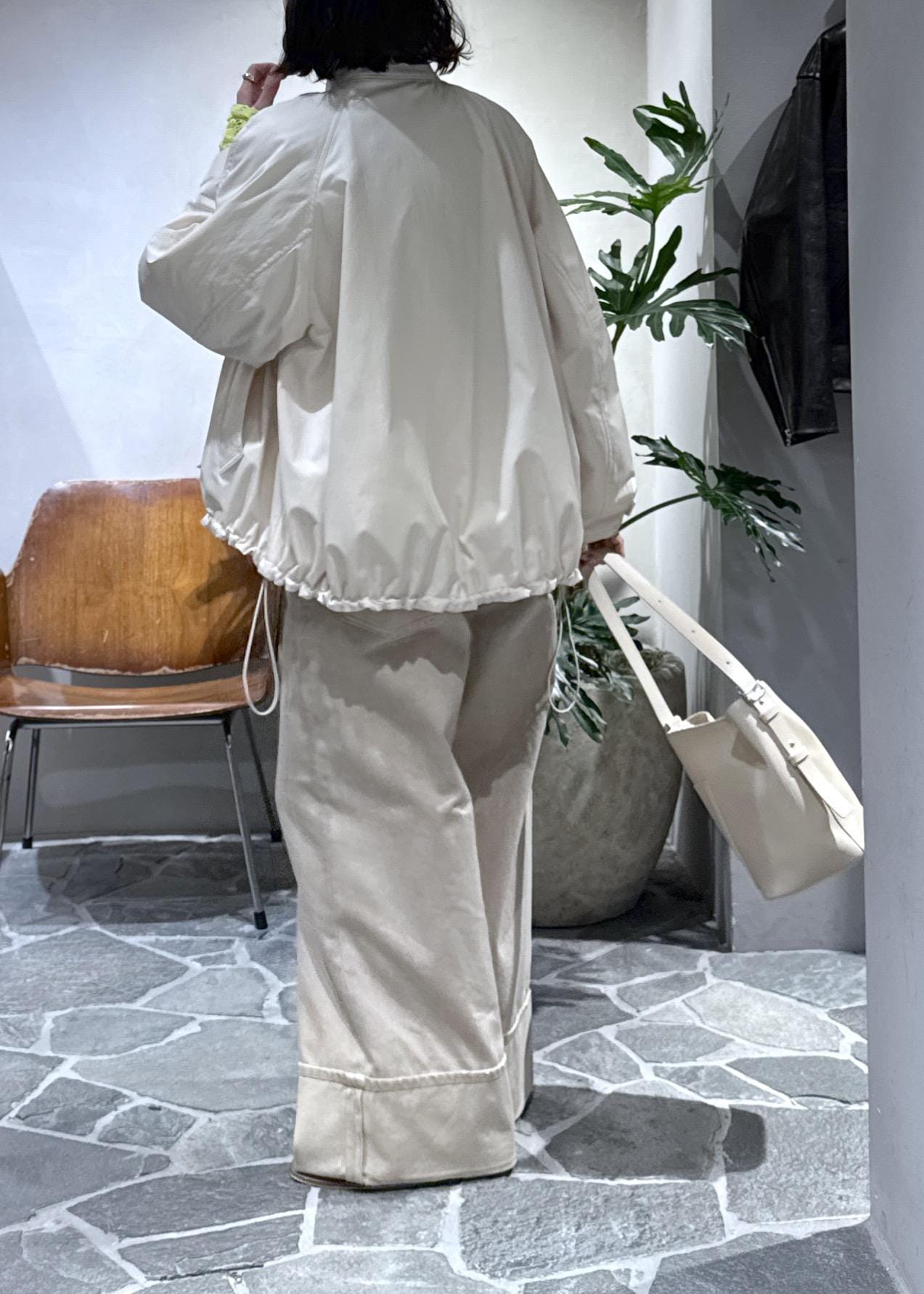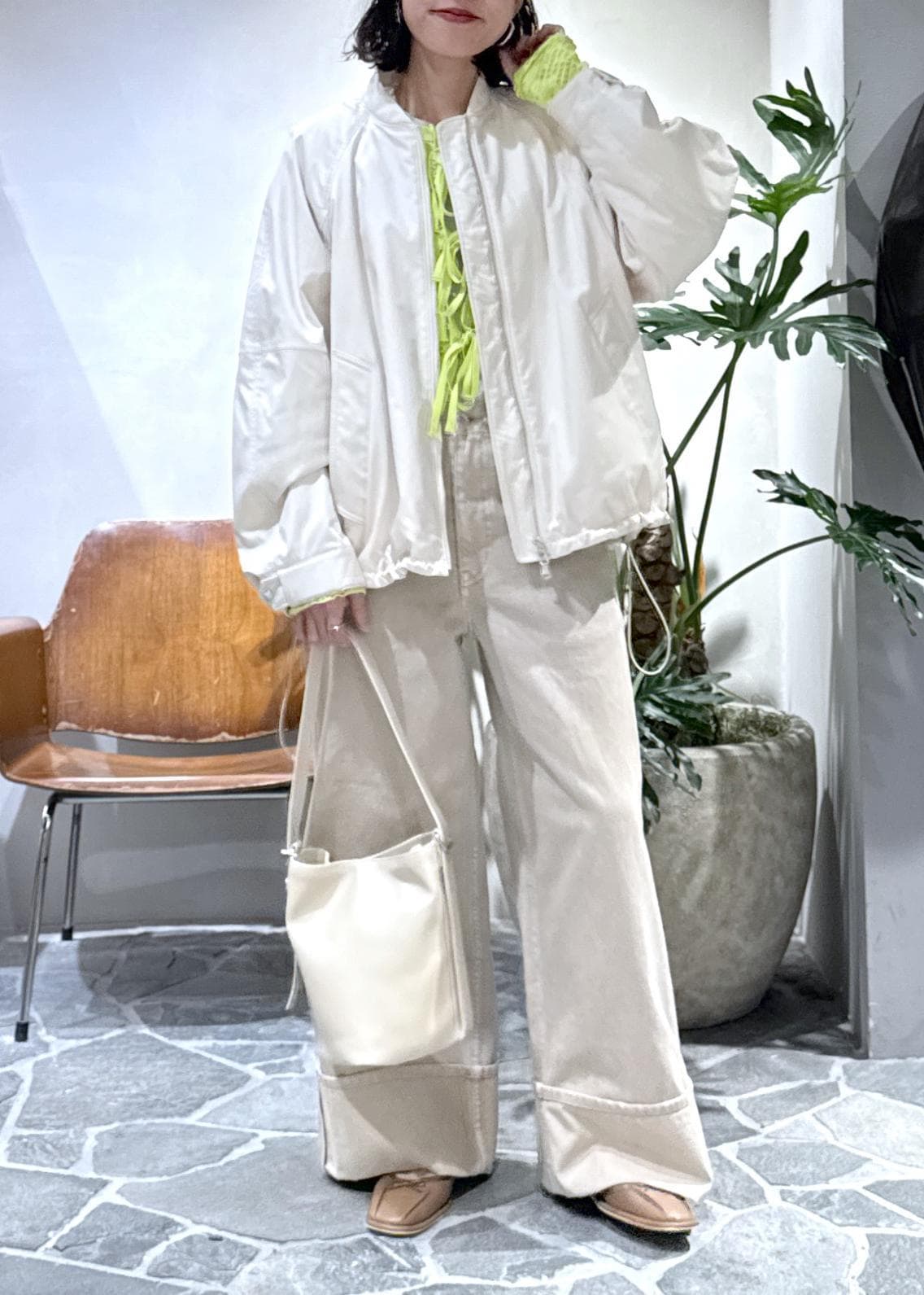 ホワイトのブルゾンにベージュのボトムス、ホワイトのバッグで柔らかい優しい印象のスタイリングにライトグリーンをプラスしてパキッとしたスタイリングに。