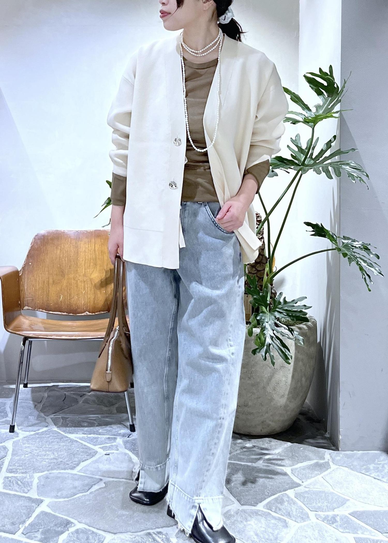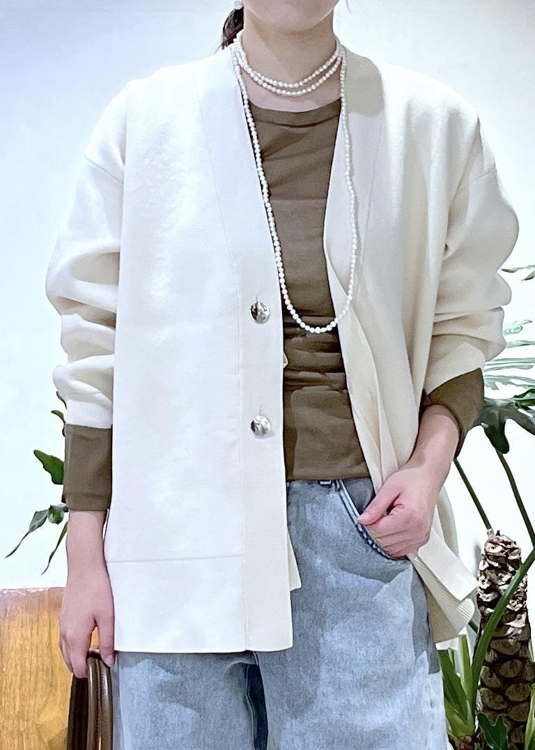 ボタンをリボンモチーフにも、シルバーボタンにもアレンジ自在なカーディガンが登場しました。