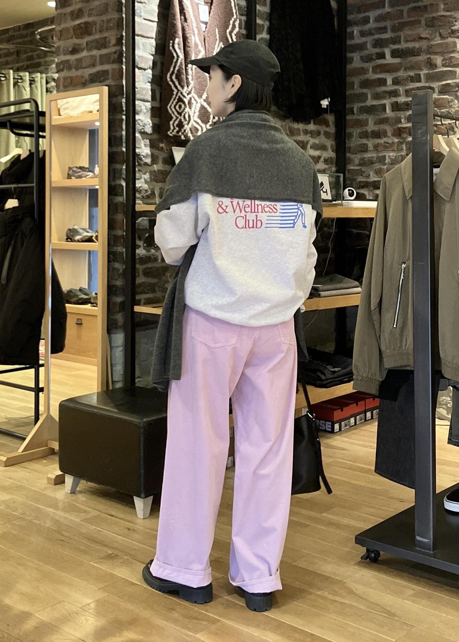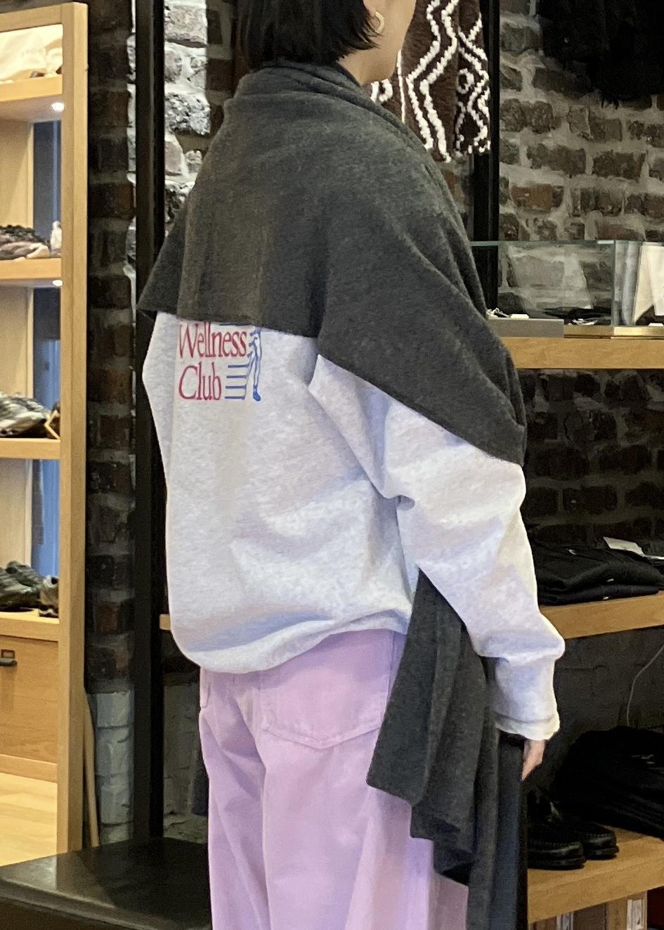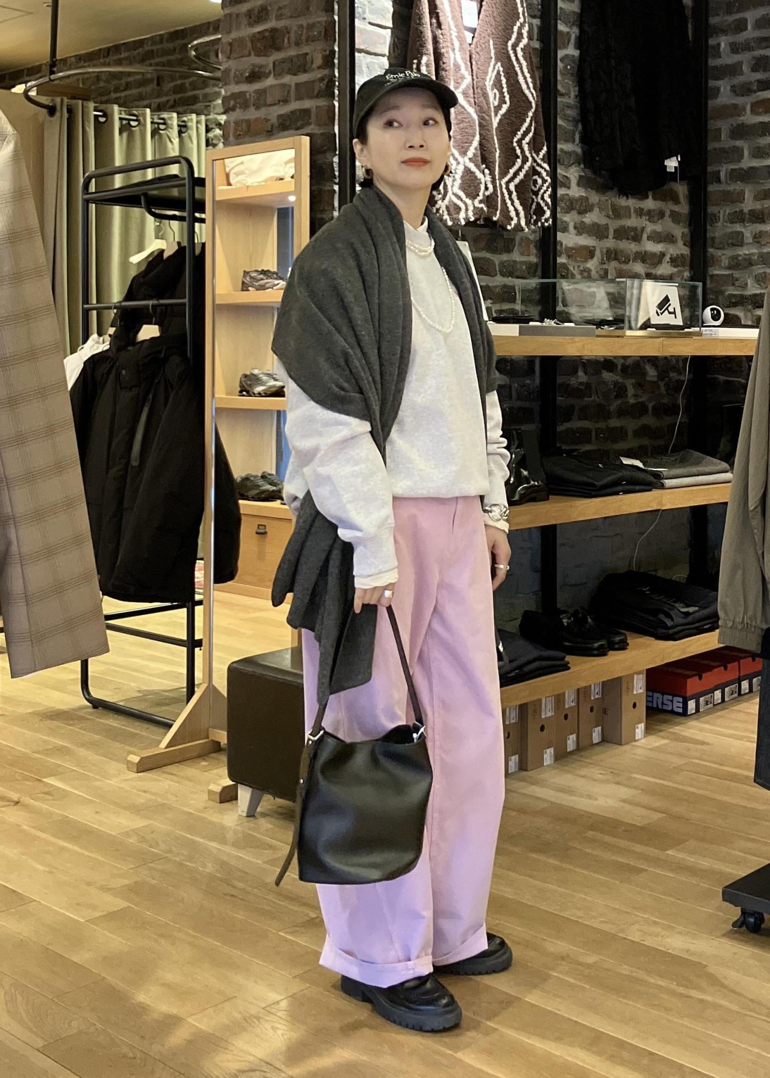 スウェットと、濃いめのグレーのストールでピンク以外を