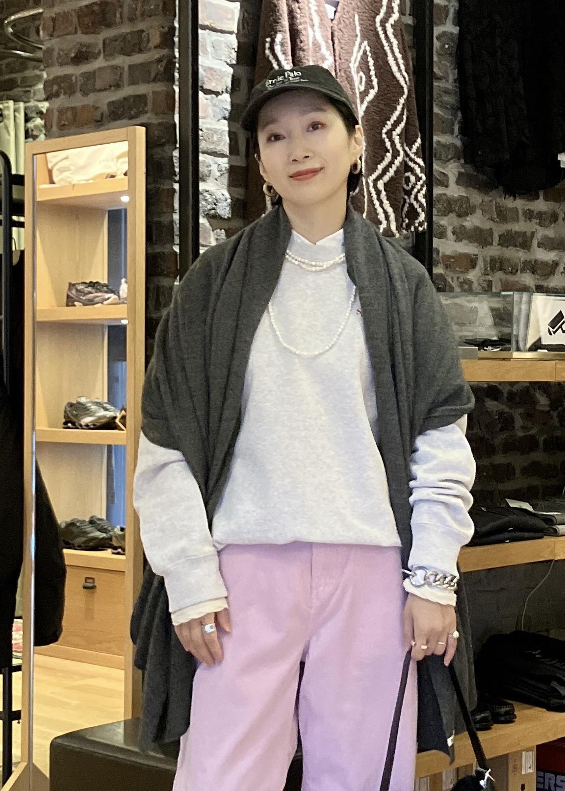 こんな色味のスタイリングで着ると、ピンクでも